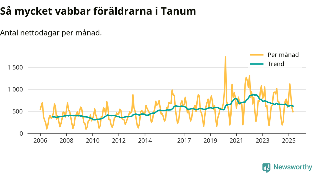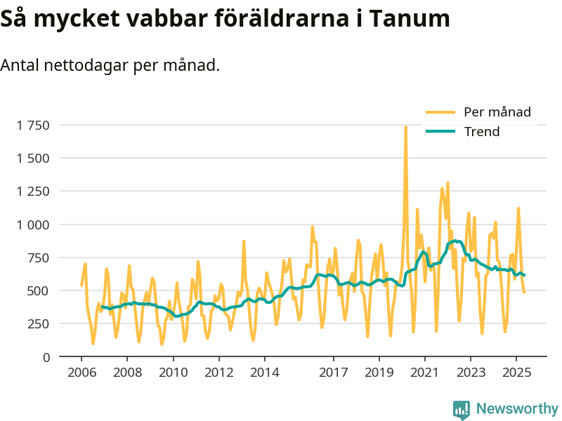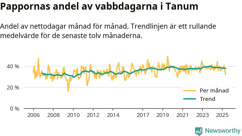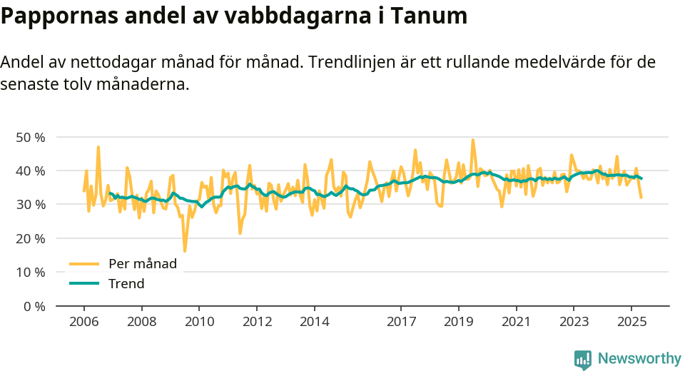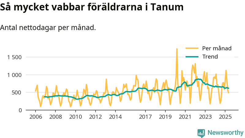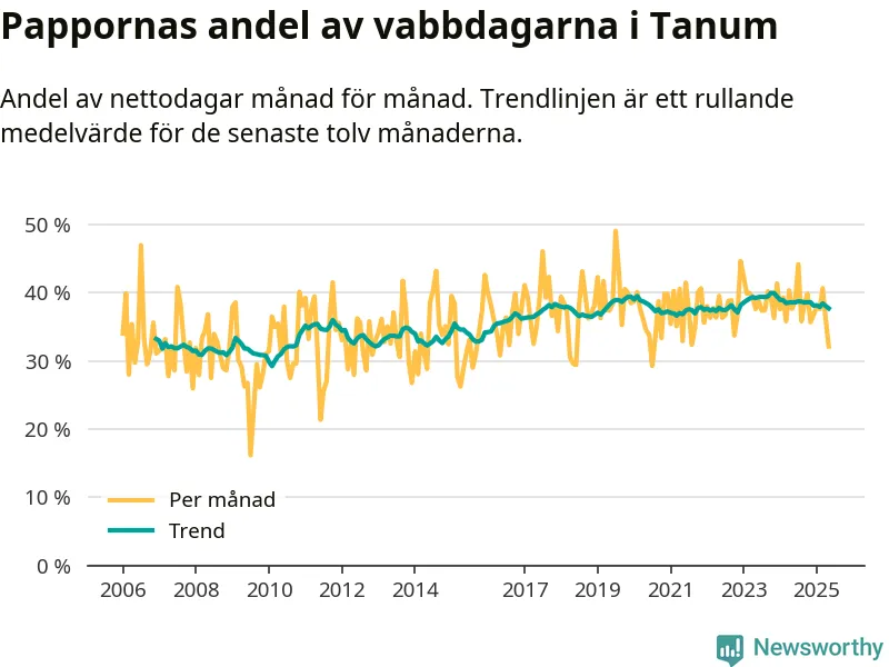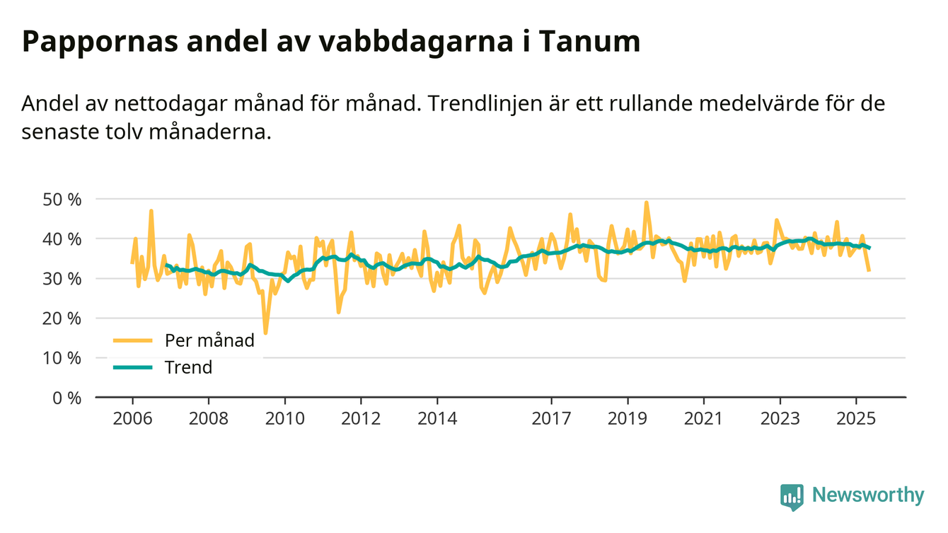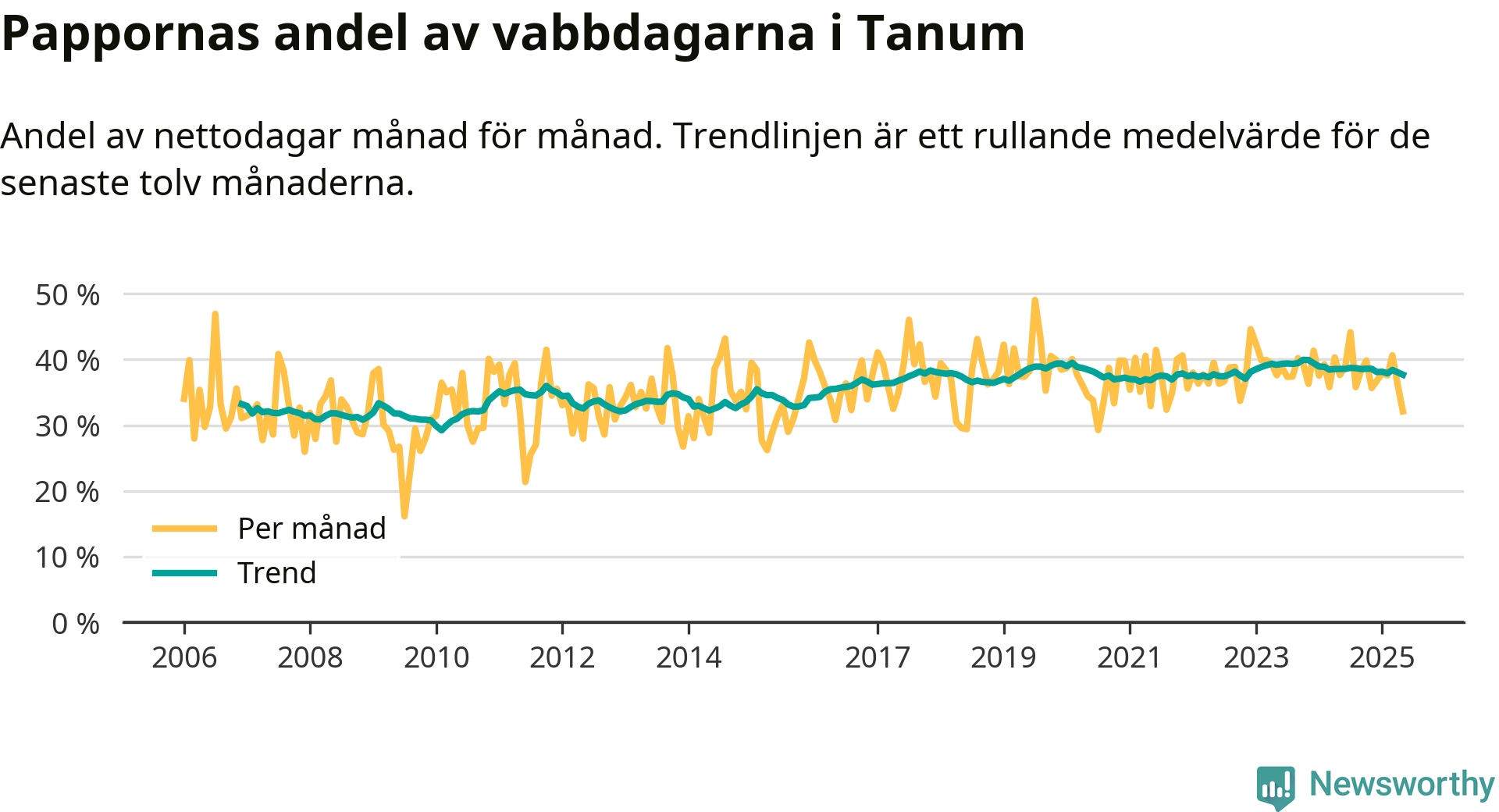Tanum ligger en bit från ett jämställt uttag. Under de senaste tolv månaderna har männen stått för 38 procent av all vabb i kommunen. Pappornas uttag peakade hösten 2023 då kommunens fäder var uppe i 40 procent av vabbdagarna 1.