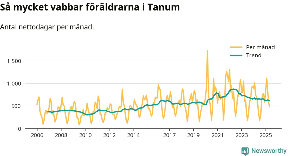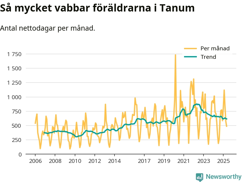 När coronapandemin drog in i mars 2020 peakade antalet vabbdagar både i Tanums kommun och i riket som helhet. Under de senaste två åren har vabbuttaget börjat minska igen.