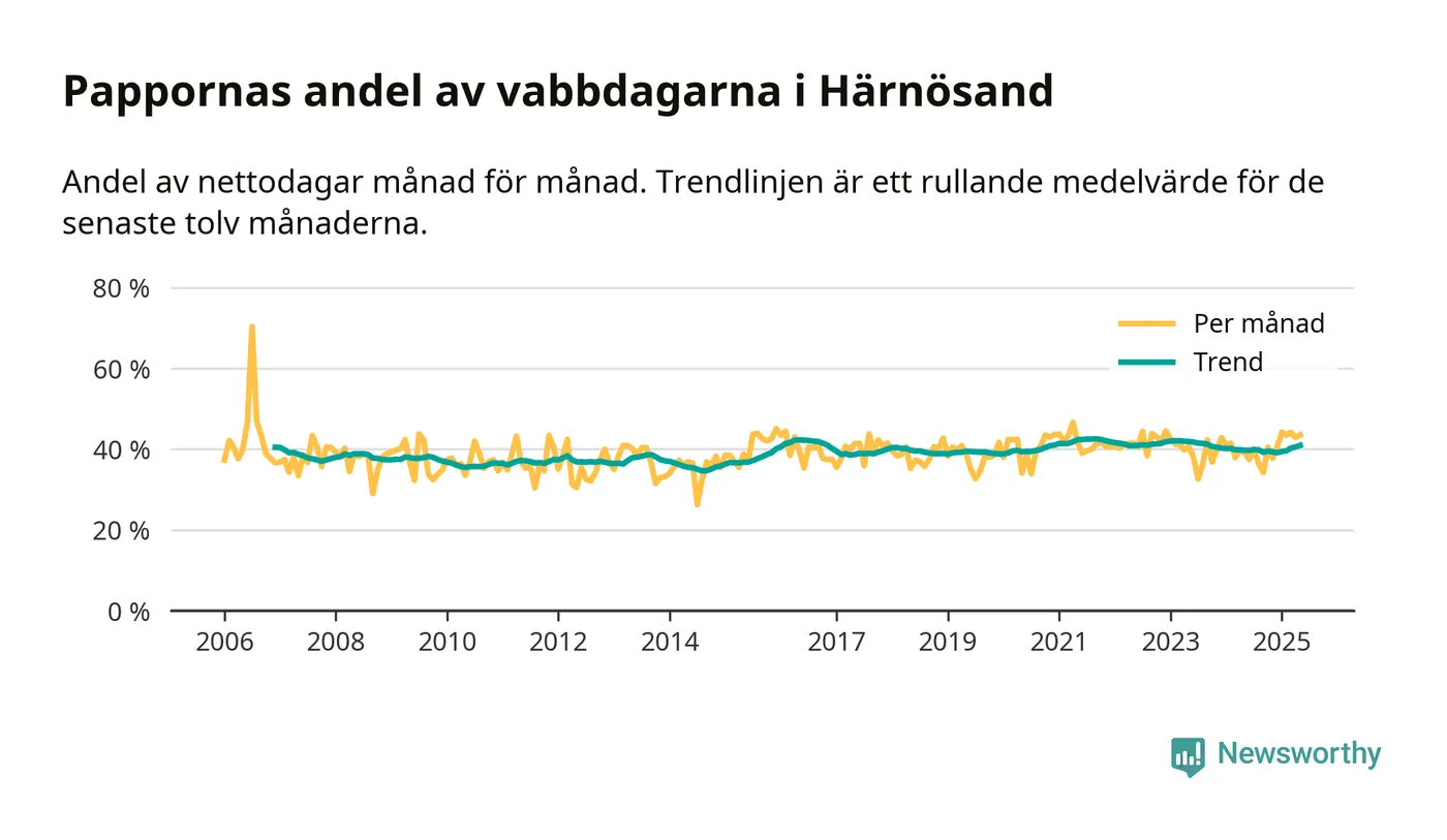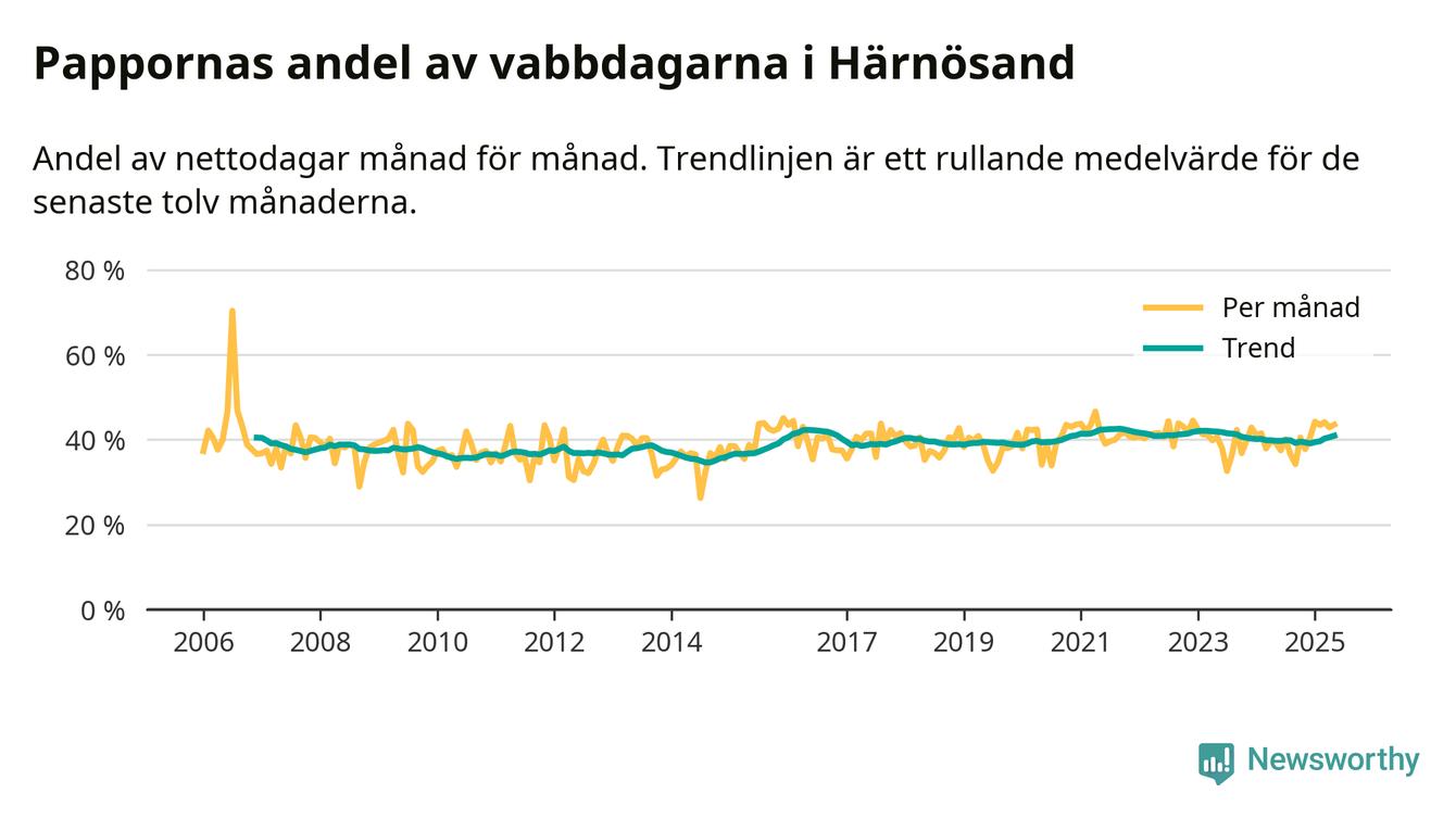 Härnösand ligger en bit från ett jämställt uttag. Under de senaste tolv månaderna har männen stått för 41 procent av all vabb i kommunen.