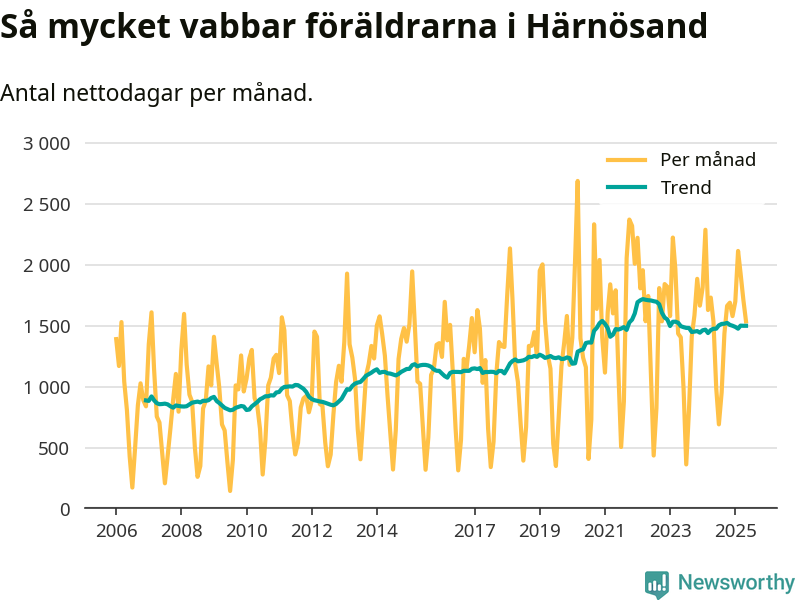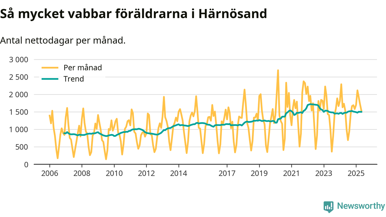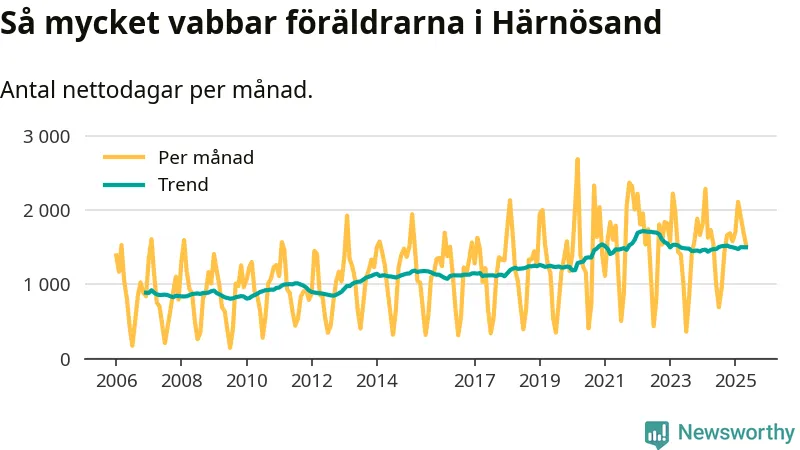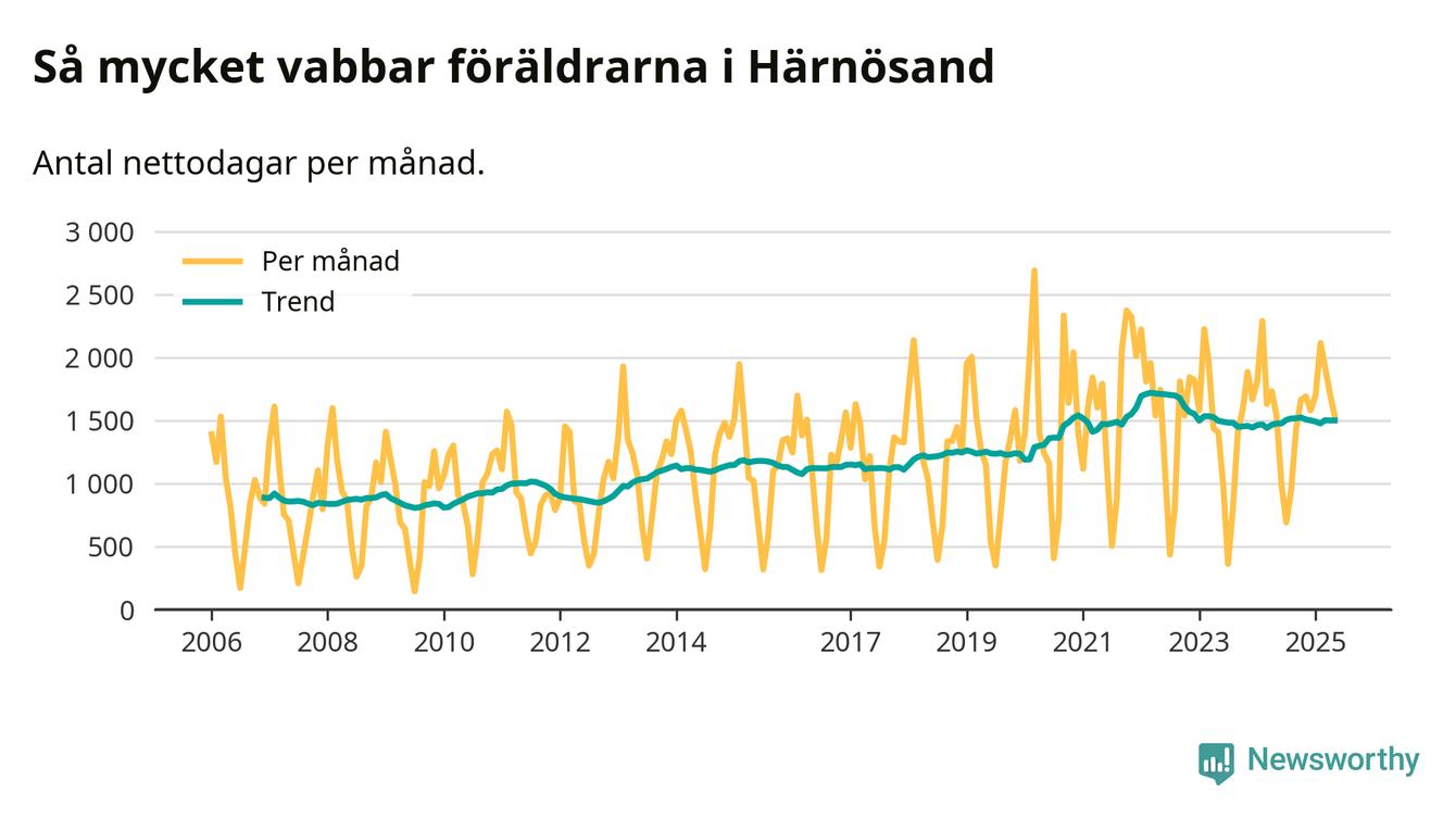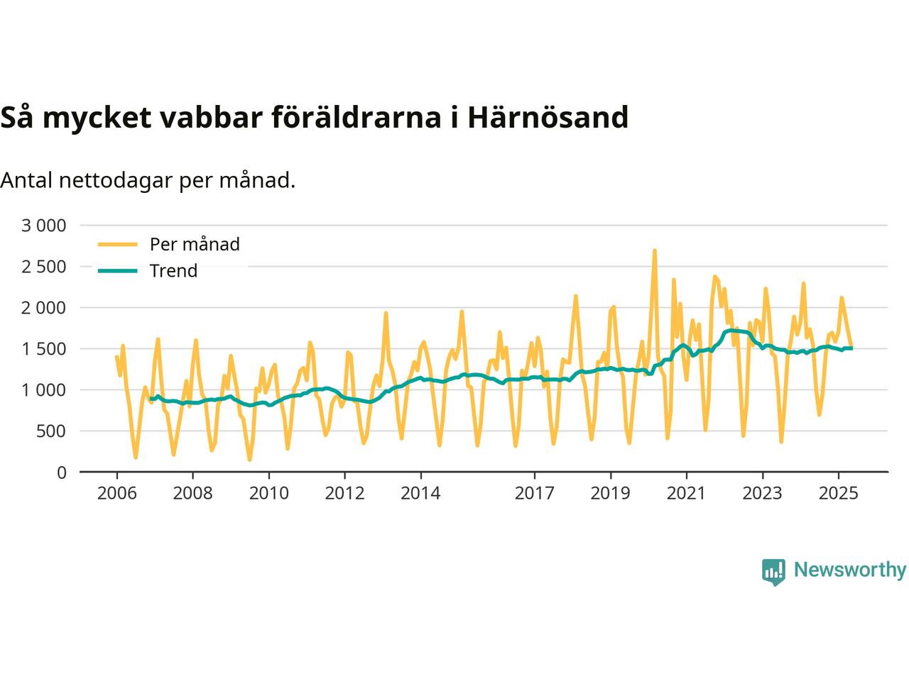 När coronapandemin drog in i mars 2020 peakade antalet vabbdagar både i Härnösands kommun och i riket som helhet. Under de senaste två åren har vabbuttaget börjat minska igen.