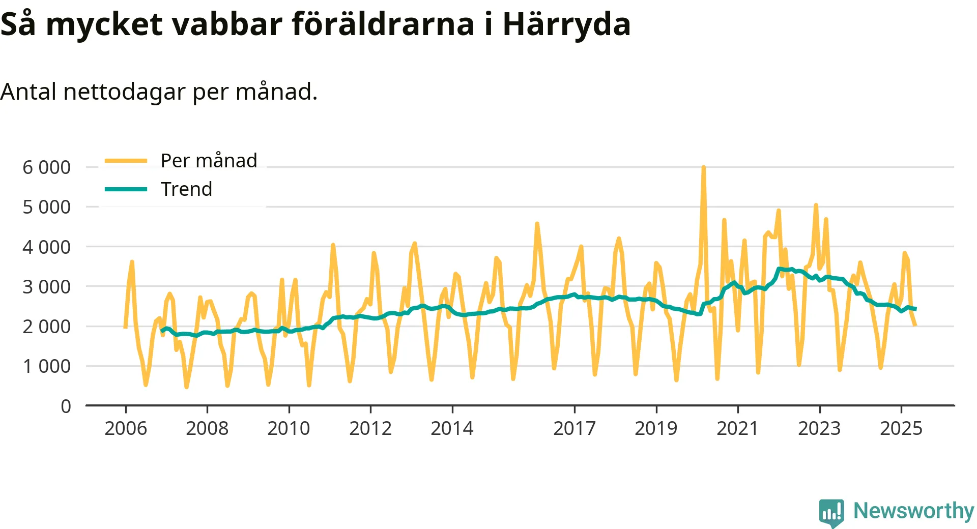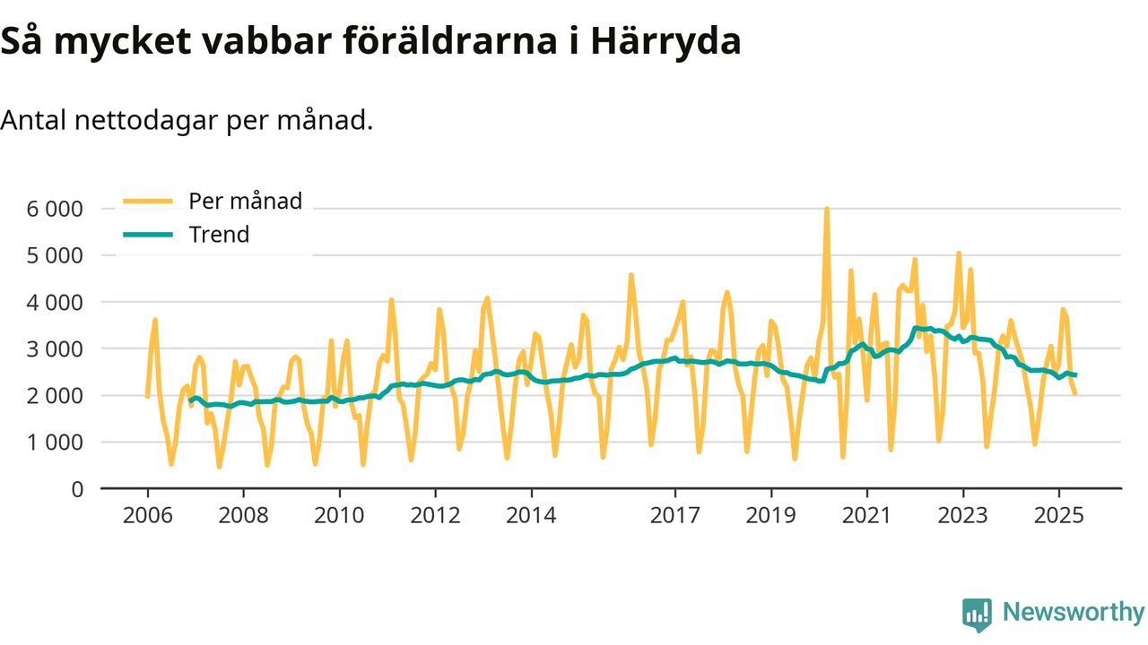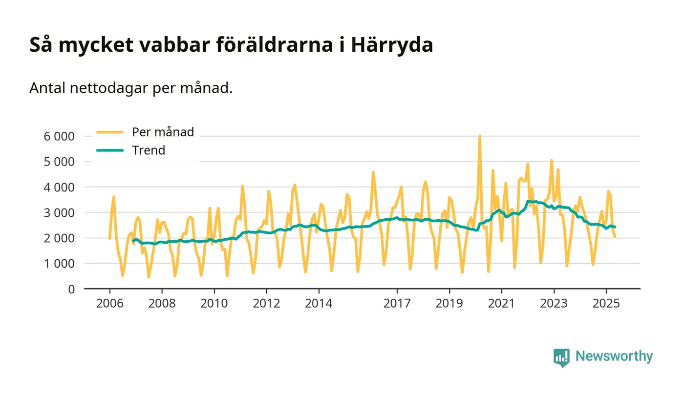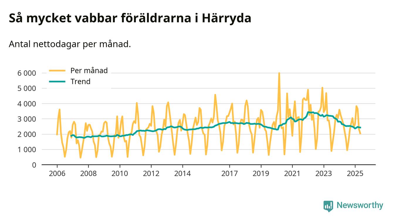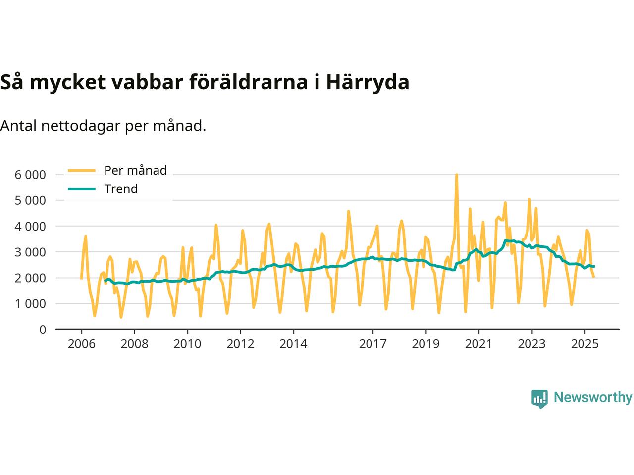 När coronapandemin drog in i mars 2020 peakade antalet vabbdagar både i Härryda kommun och i riket som helhet. Under de senaste två åren har vabbuttaget börjat minska igen.