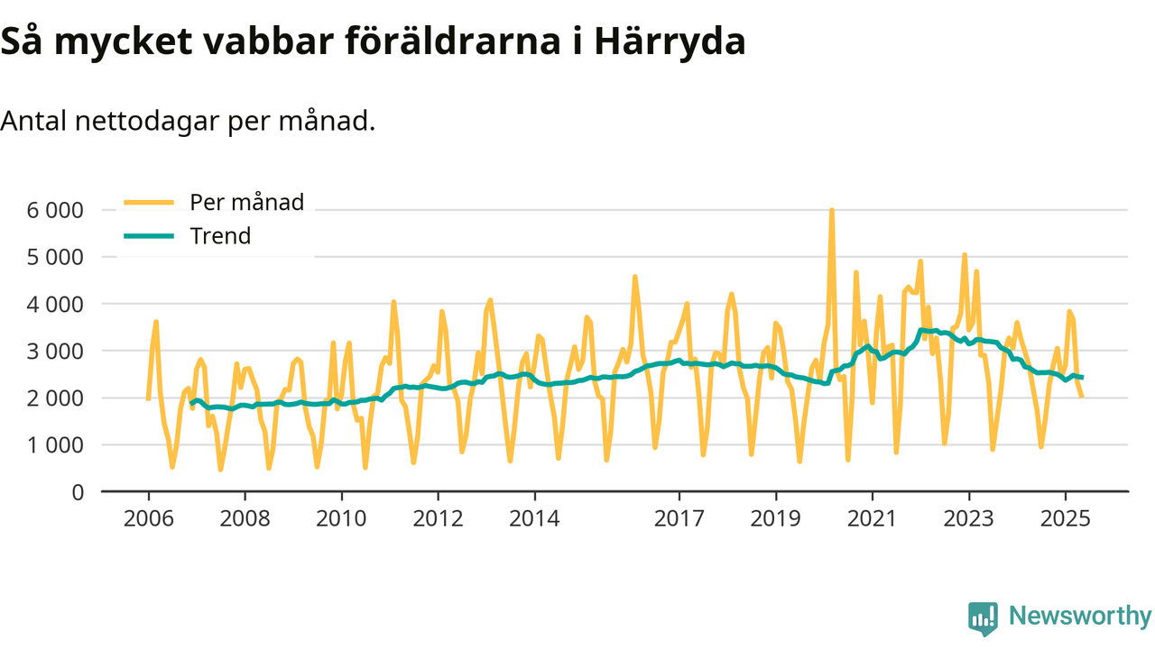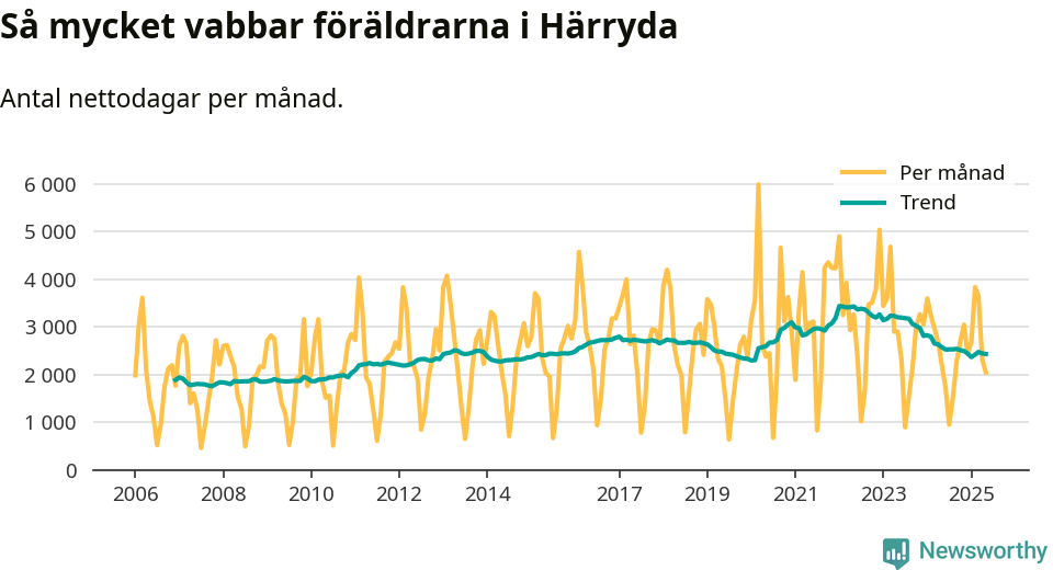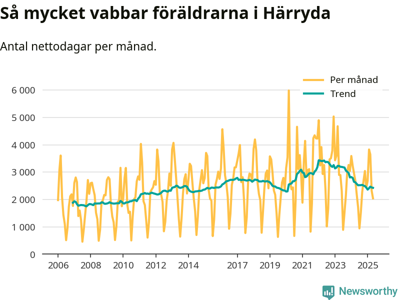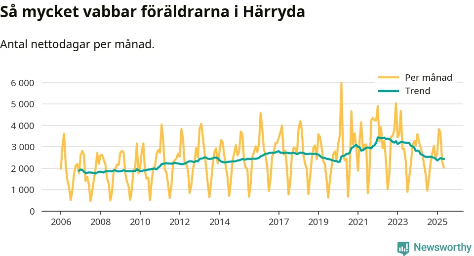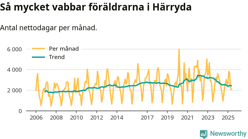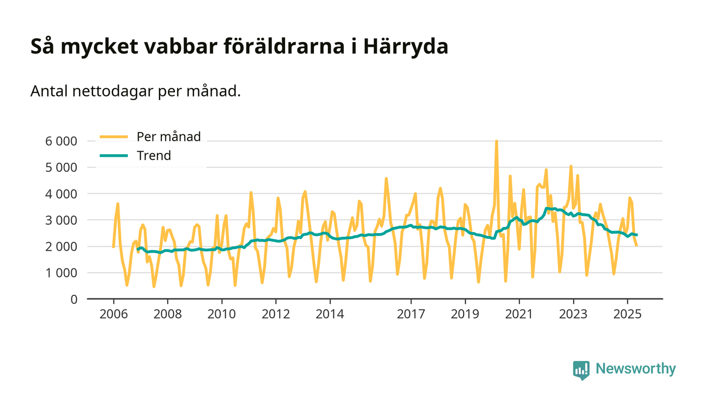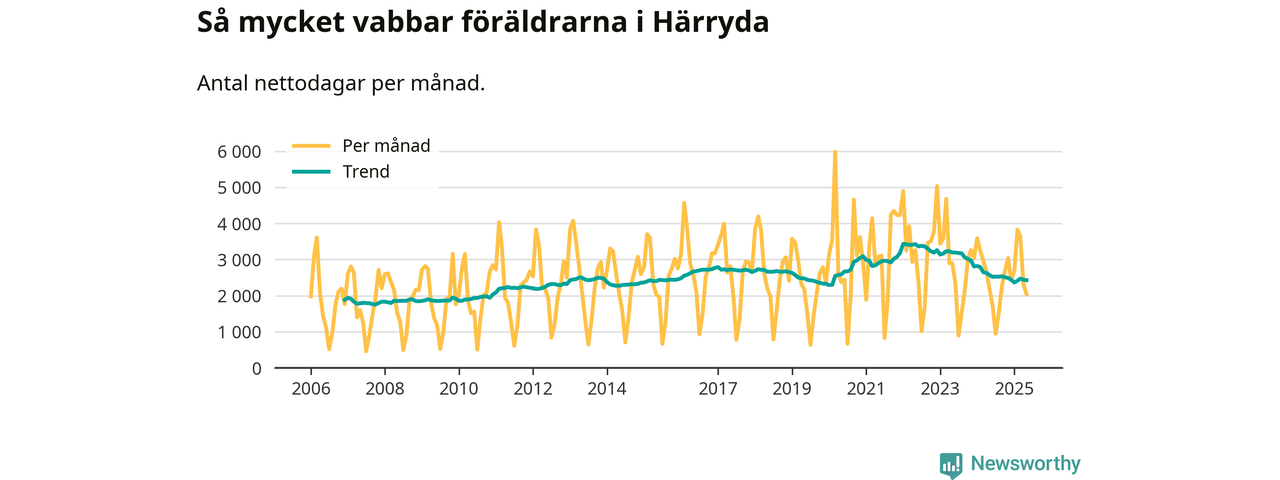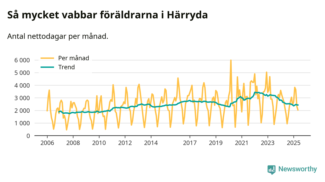 När coronapandemin drog in i mars 2020 peakade antalet vabbdagar både i Härryda kommun och i riket som helhet. Under de senaste två åren har vabbuttaget börjat minska igen.
