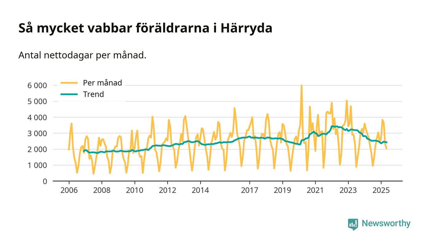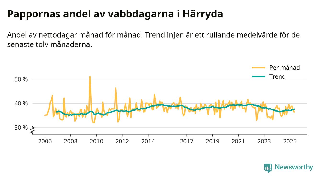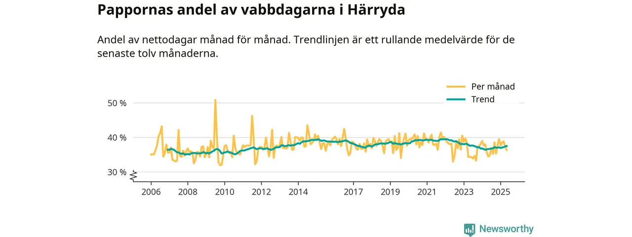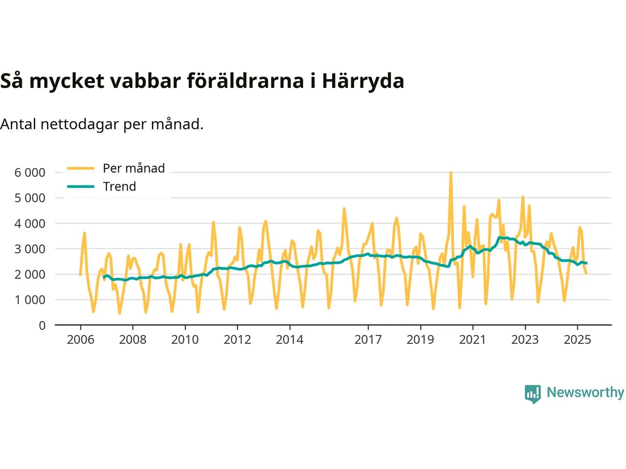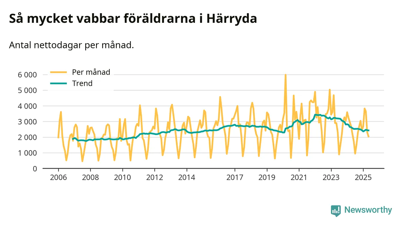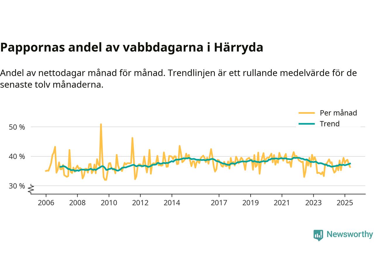 Härryda ligger en bit från ett jämställt uttag. Under de senaste tolv månaderna har männen stått för 38 procent av all vabb i kommunen. Pappornas uttag peakade hösten 2021 då kommunens fäder var uppe i 40 procent av vabbdagarna 1.