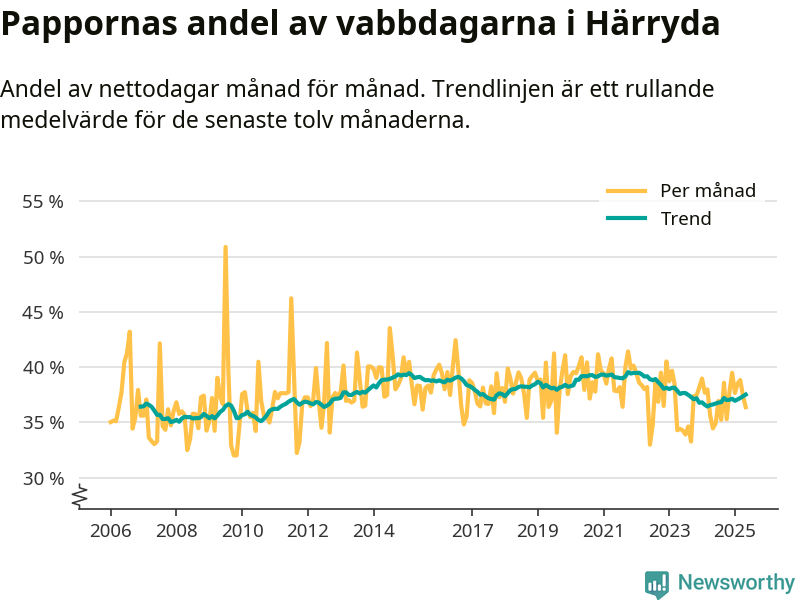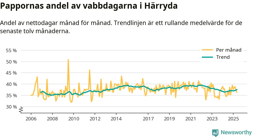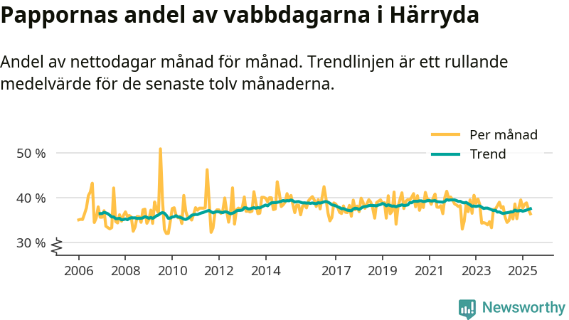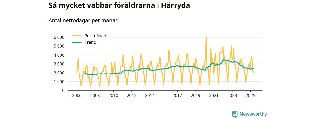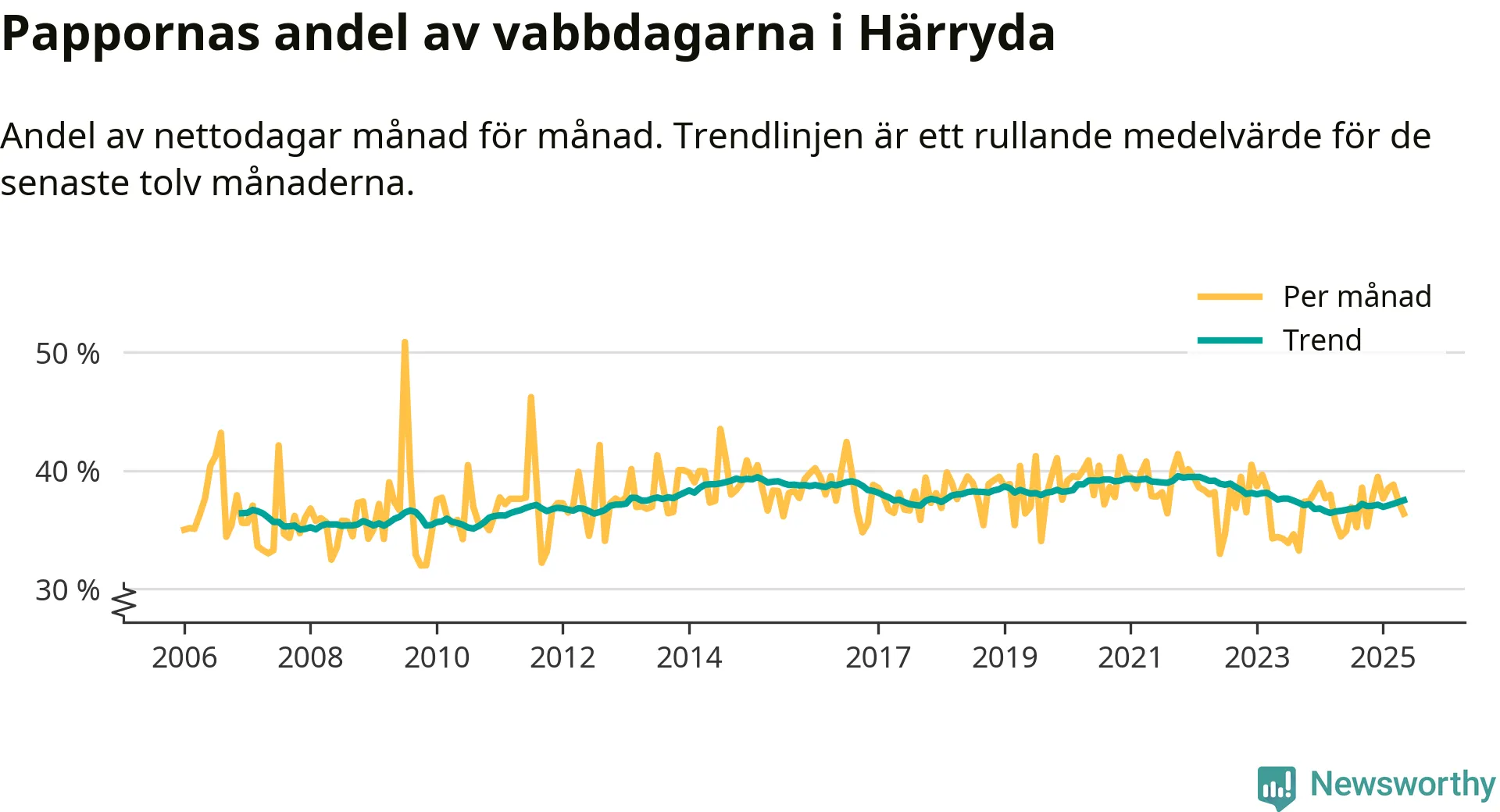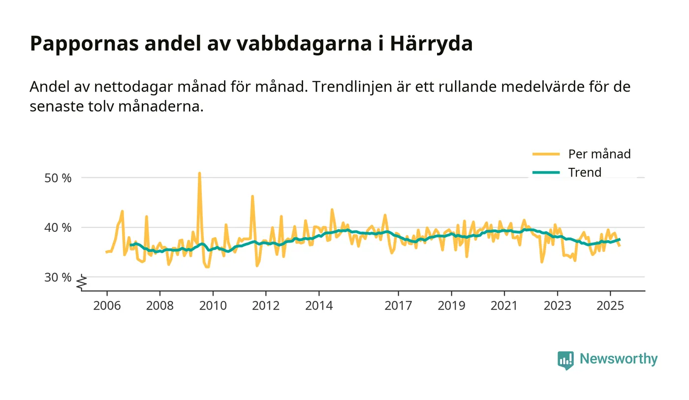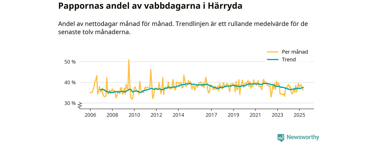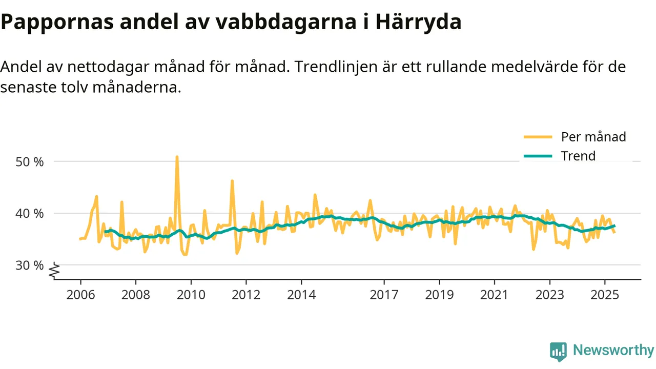 Härryda ligger en bit från ett jämställt uttag. Under de senaste tolv månaderna har männen stått för 38 procent av all vabb i kommunen. Pappornas uttag peakade hösten 2021 då kommunens fäder var uppe i 40 procent av vabbdagarna 1.