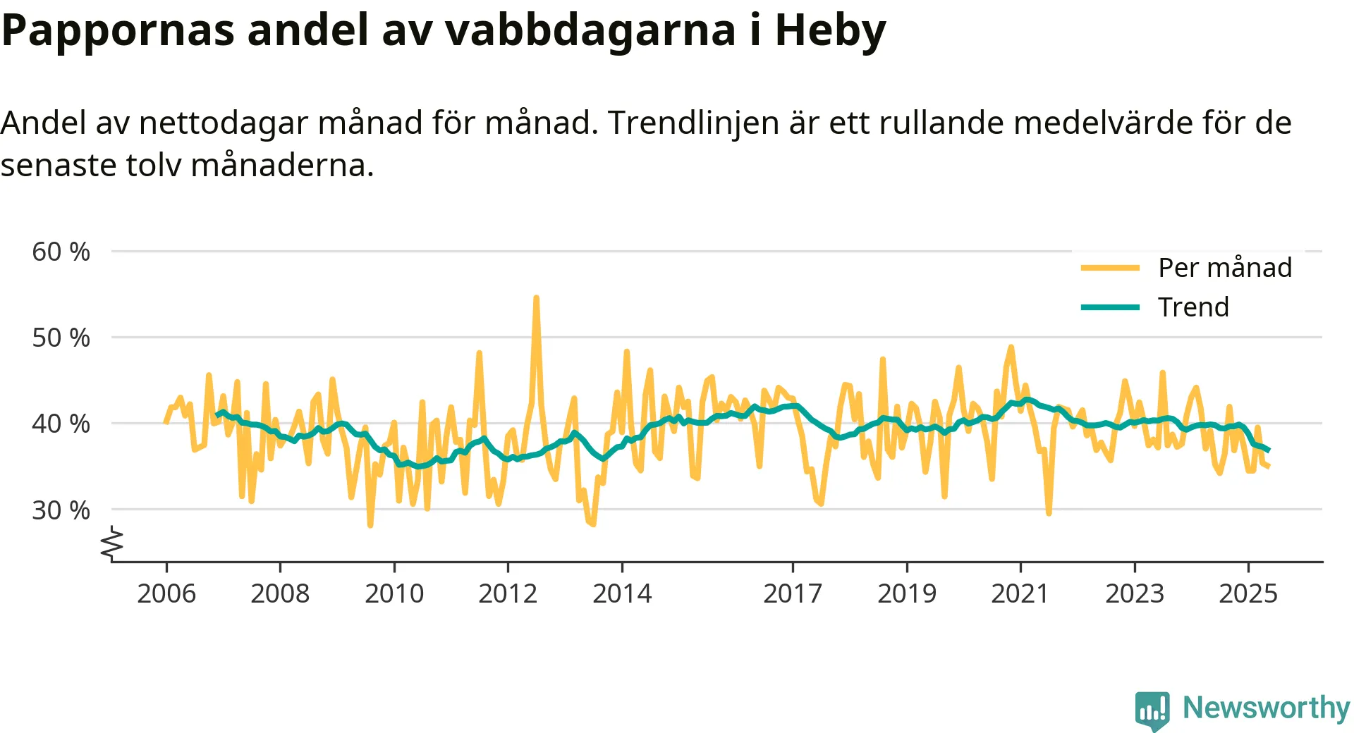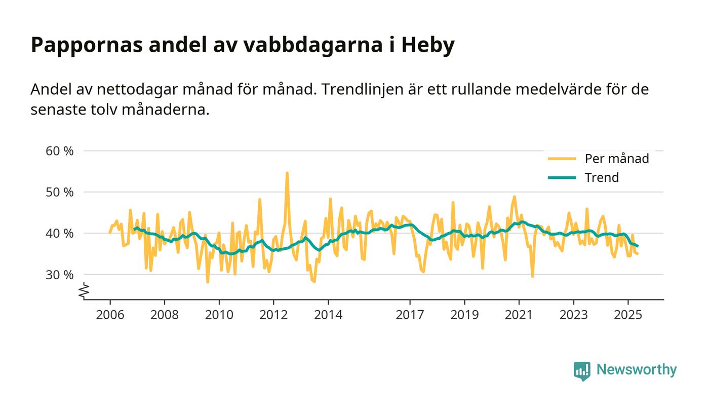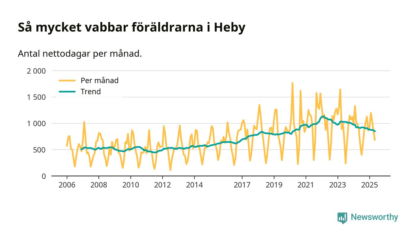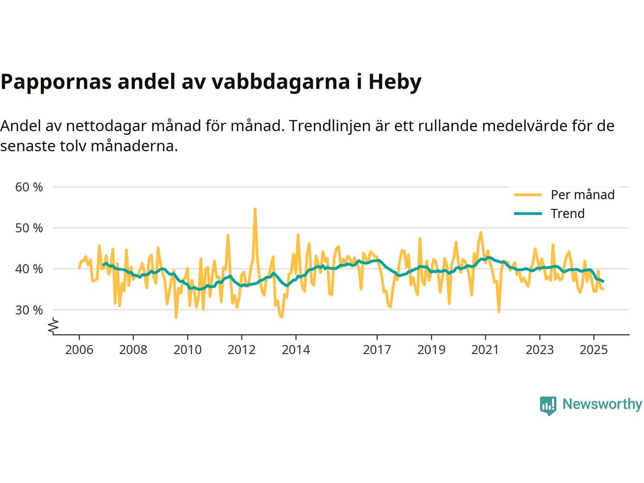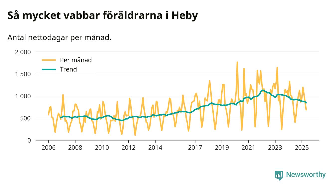 Heby ligger en bit från ett jämställt uttag. Under de senaste tolv månaderna har männen stått för 37 procent av all vabb i kommunen. Det är en lägre andel än på över elva år.