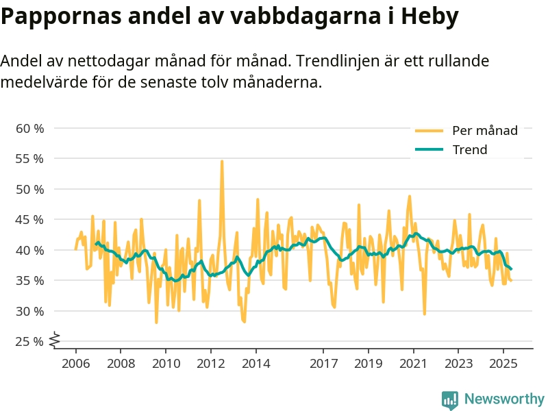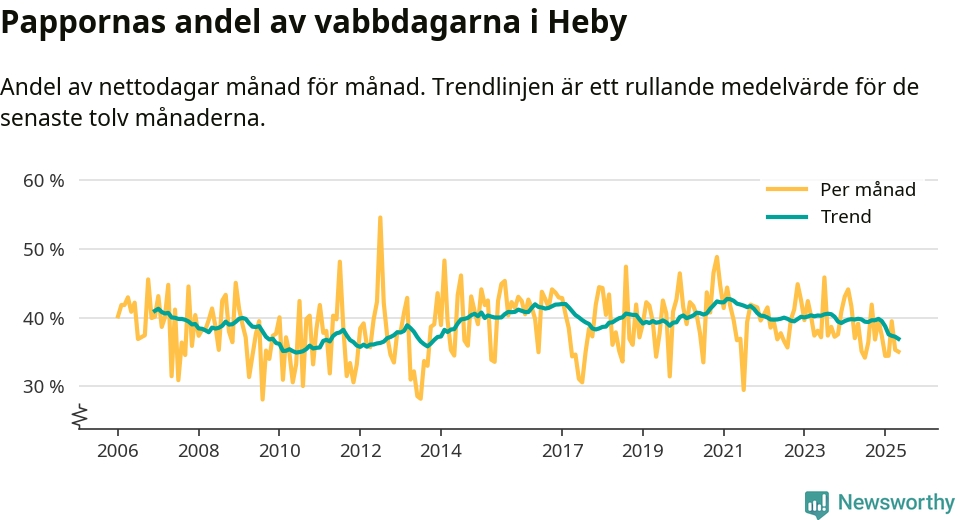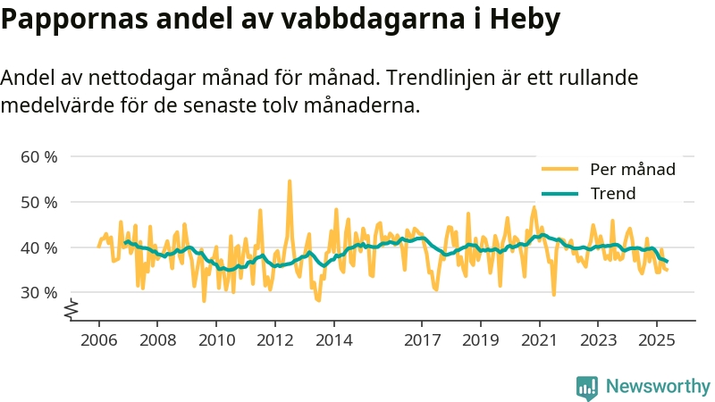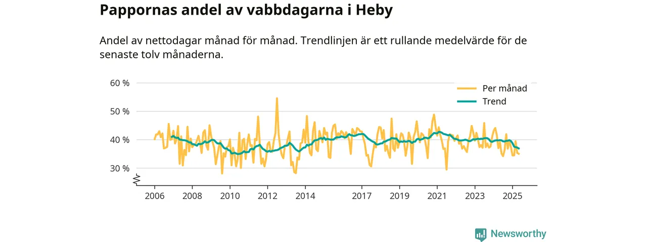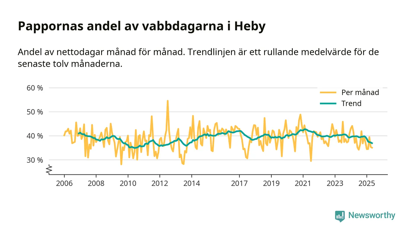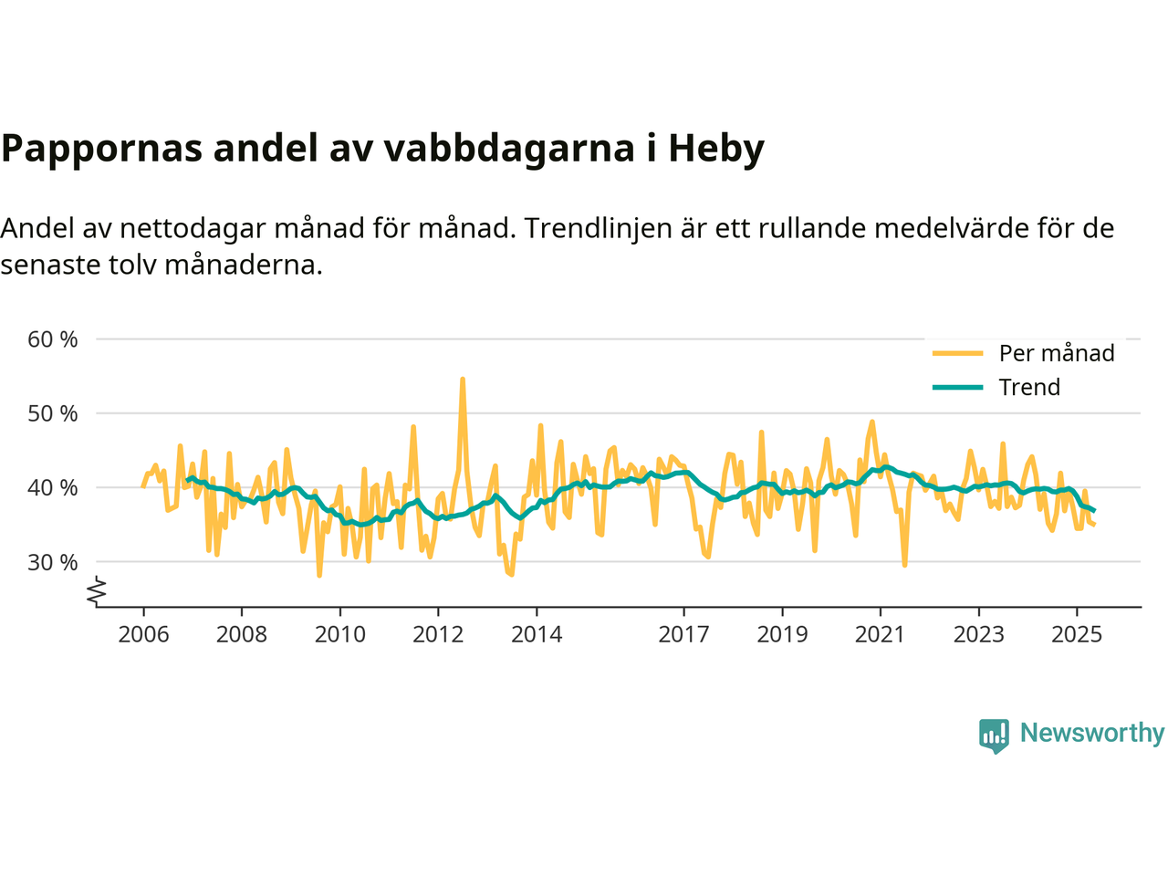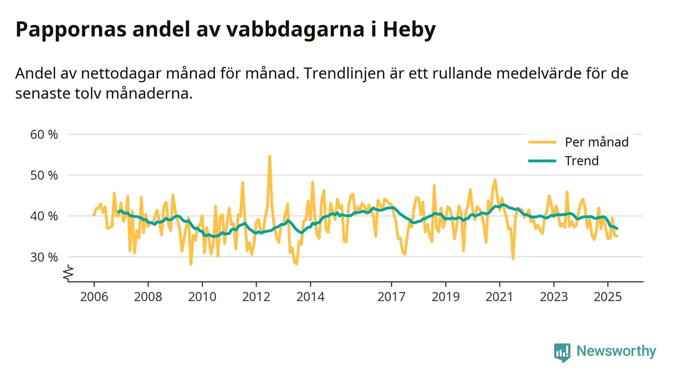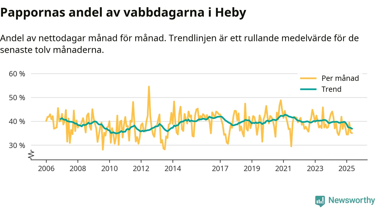 Heby ligger en bit från ett jämställt uttag. Under de senaste tolv månaderna har männen stått för 37 procent av all vabb i kommunen. Det är en lägre andel än på över elva år.