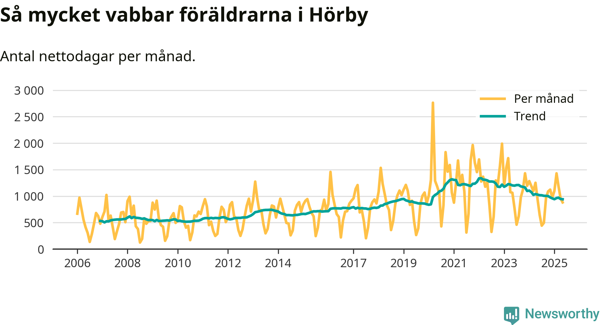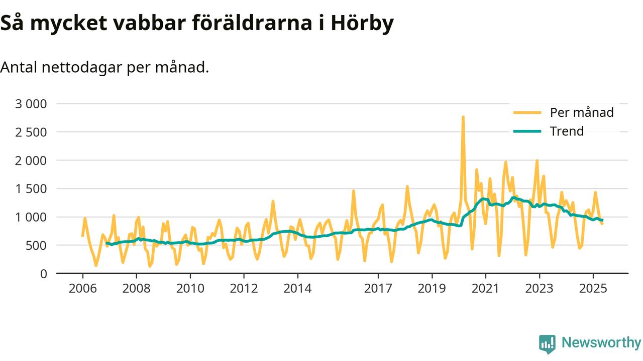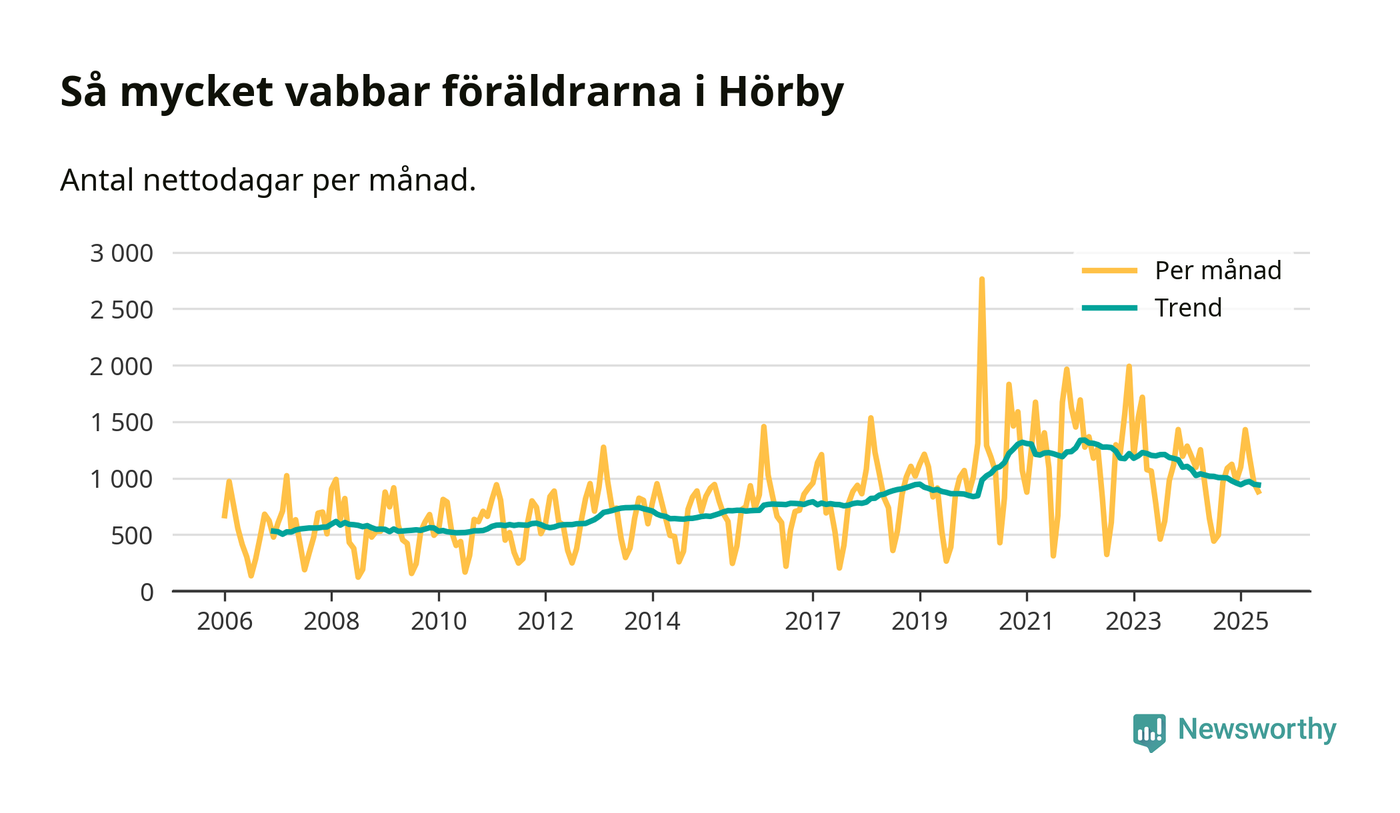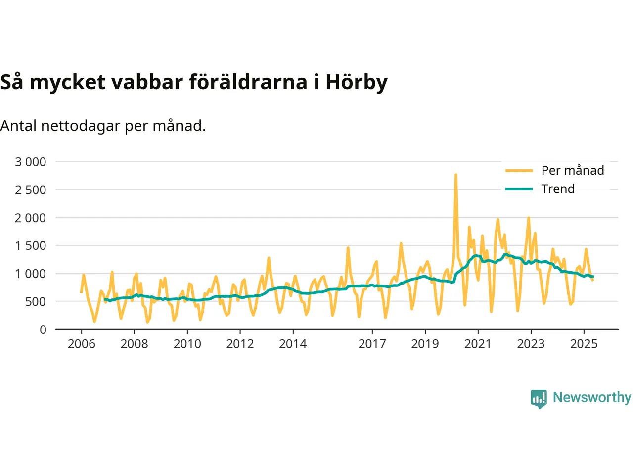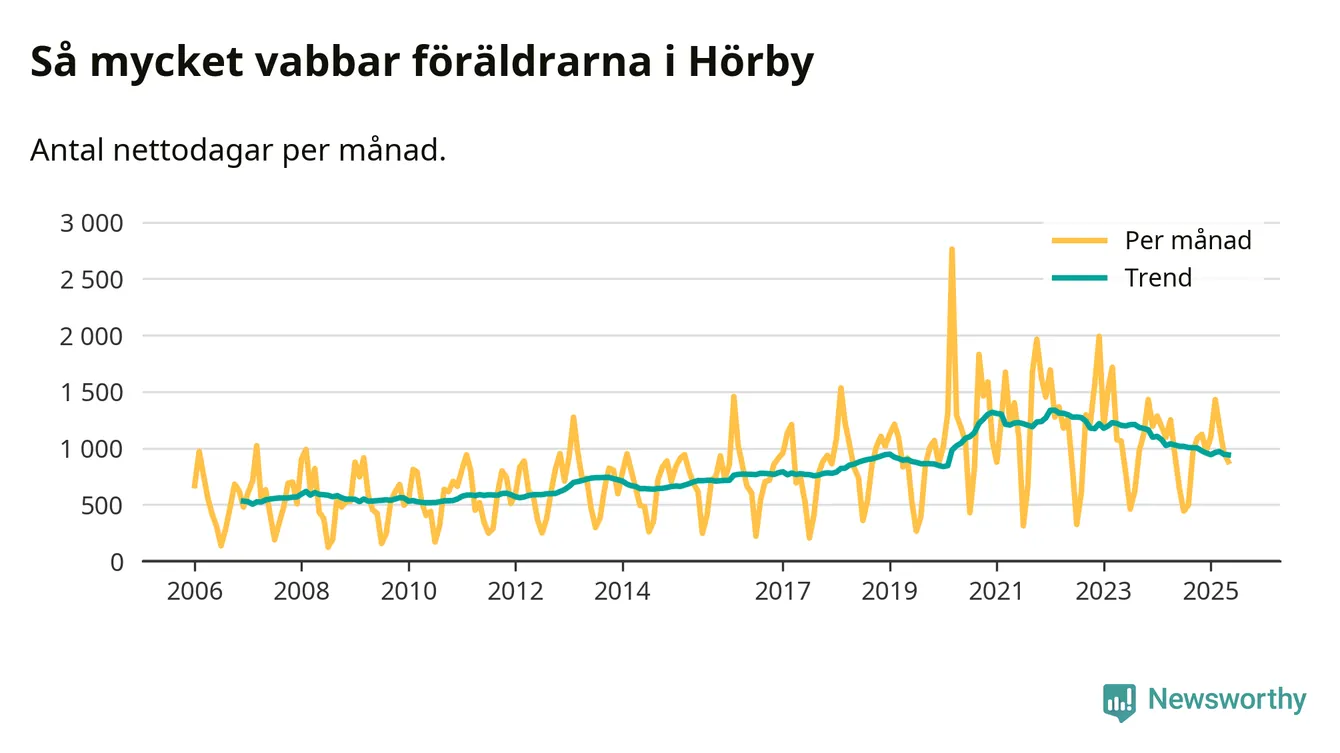 När coronapandemin drog in i mars 2020 peakade antalet vabbdagar både i Hörby kommun och i riket som helhet. Under de senaste två åren har vabbuttaget börjat minska igen.