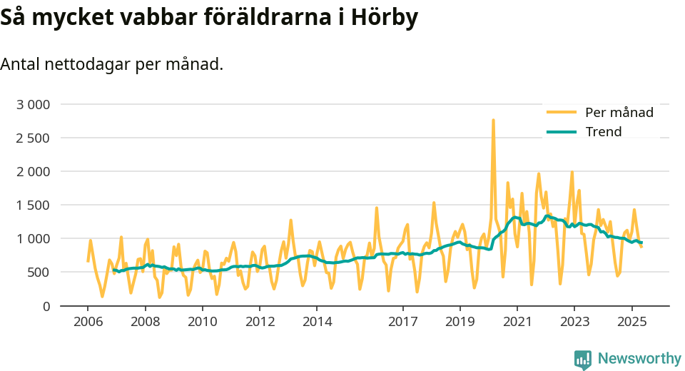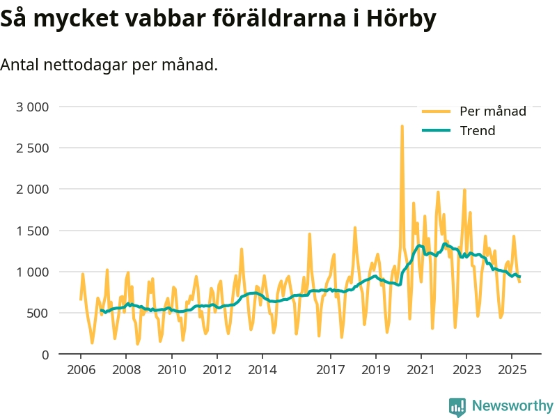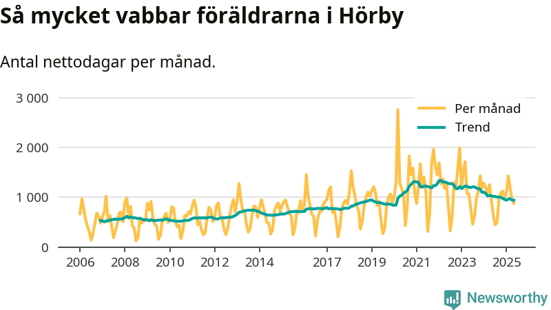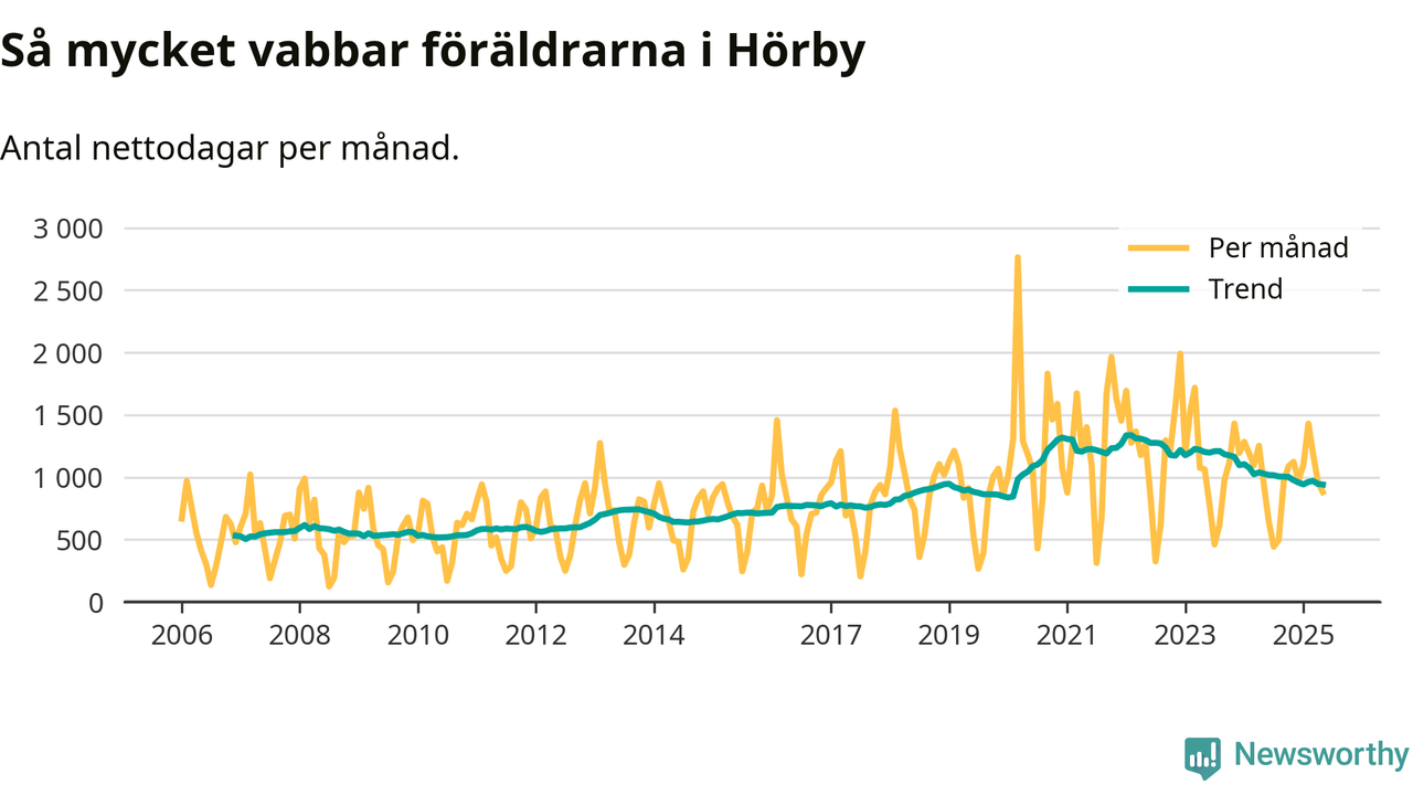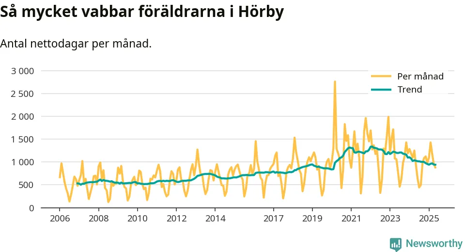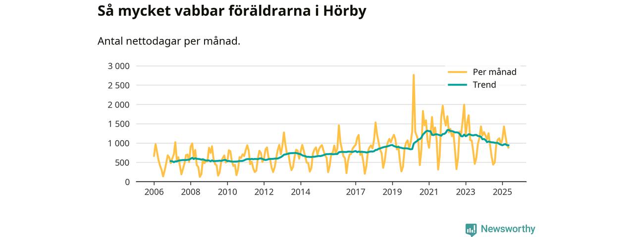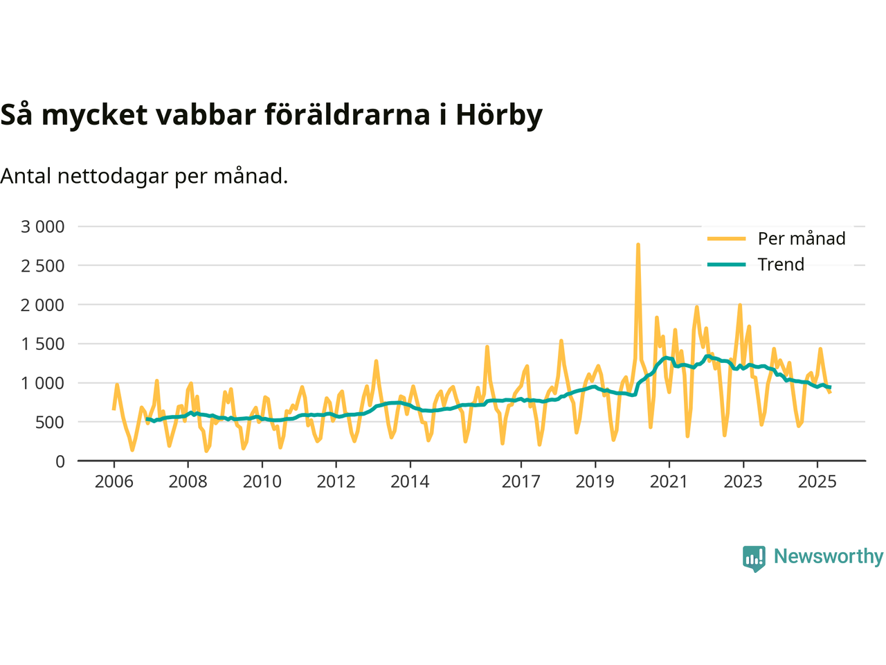 När coronapandemin drog in i mars 2020 peakade antalet vabbdagar både i Hörby kommun och i riket som helhet. Under de senaste två åren har vabbuttaget börjat minska igen.