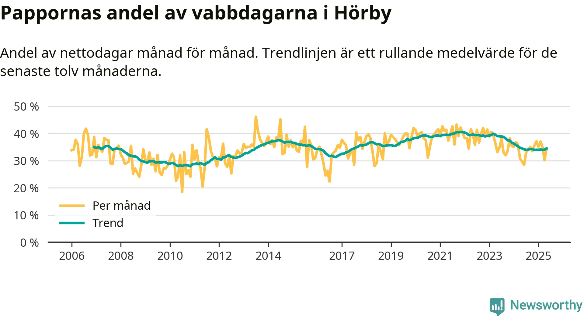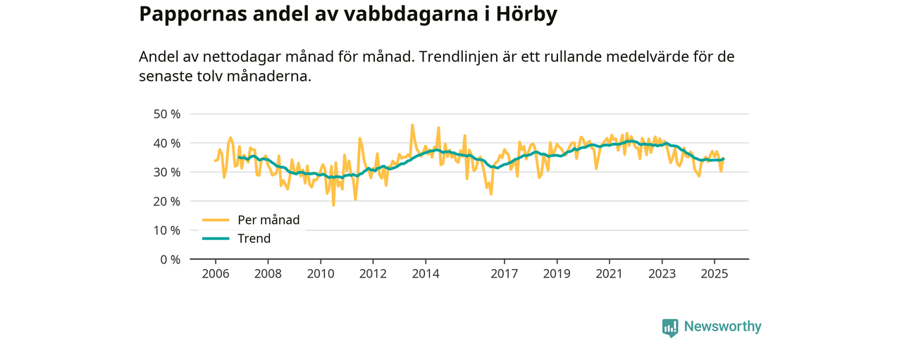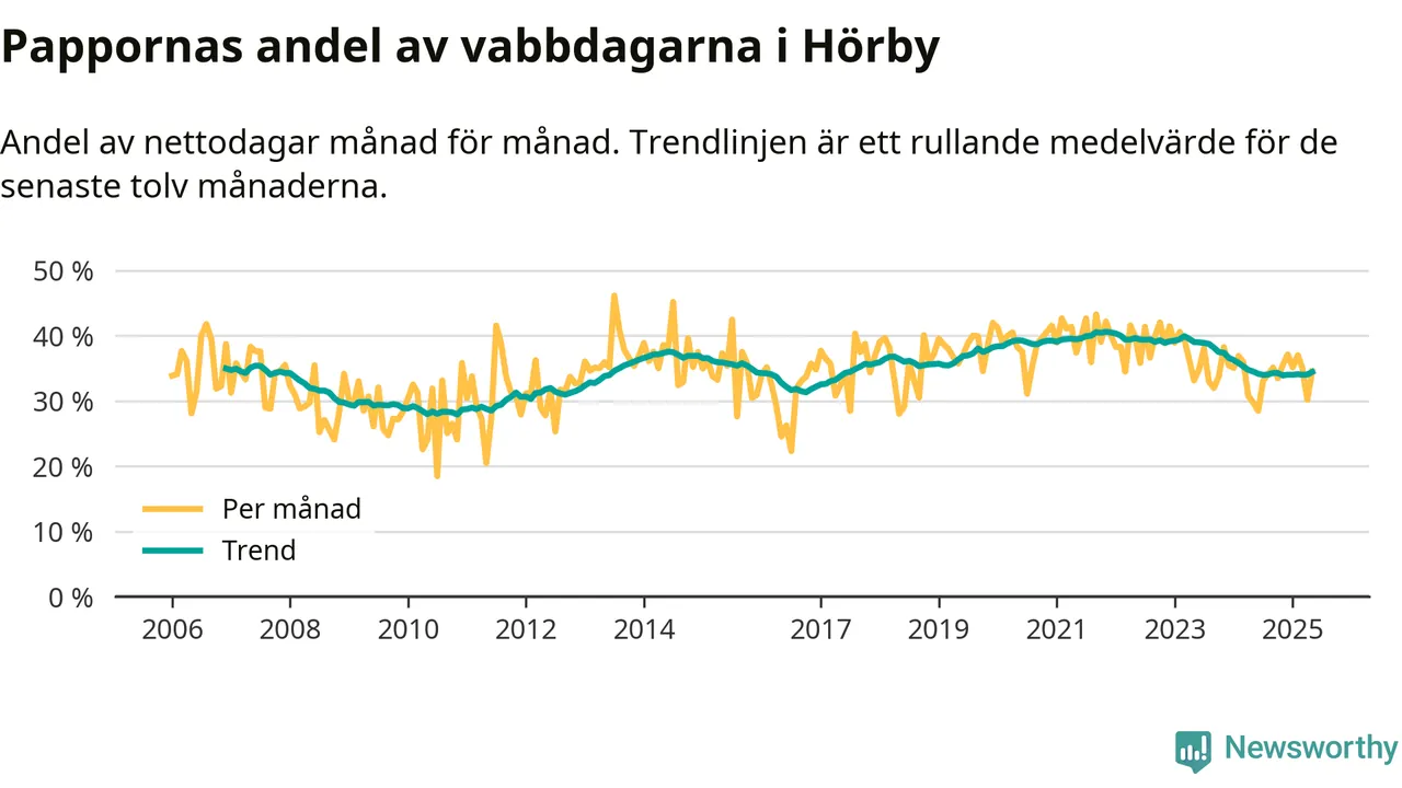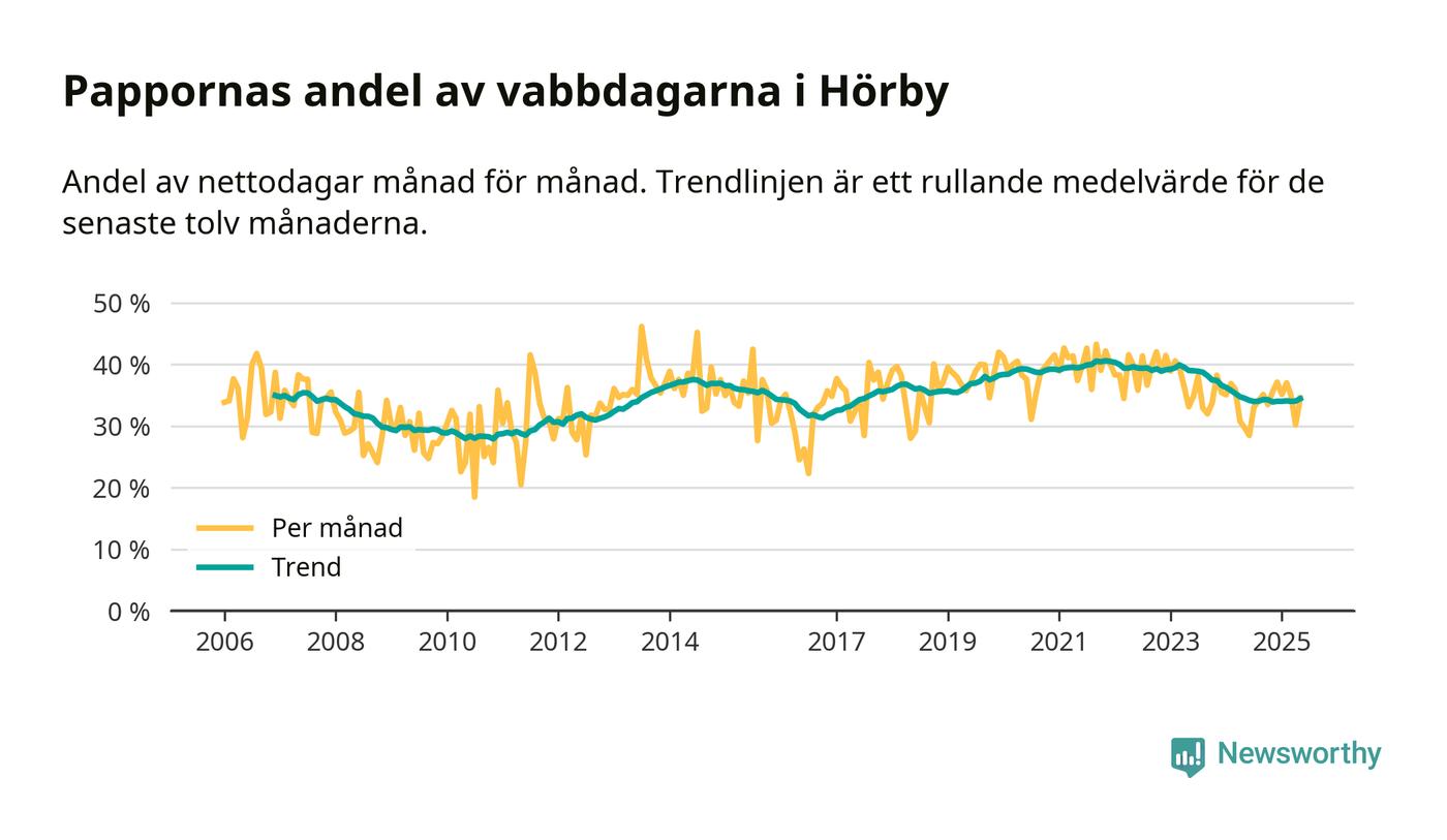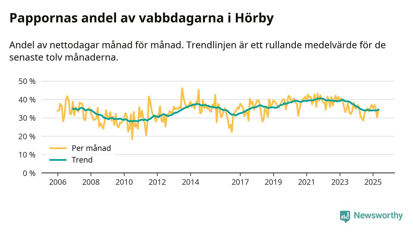 Hörby ligger en bra bit från ett jämställt uttag. Under de senaste tolv månaderna har männen stått för 34 procent av all vabb i kommunen. Pappornas uttag peakade hösten 2021 då kommunens fäder var uppe i 41 procent av vabbdagarna 1.