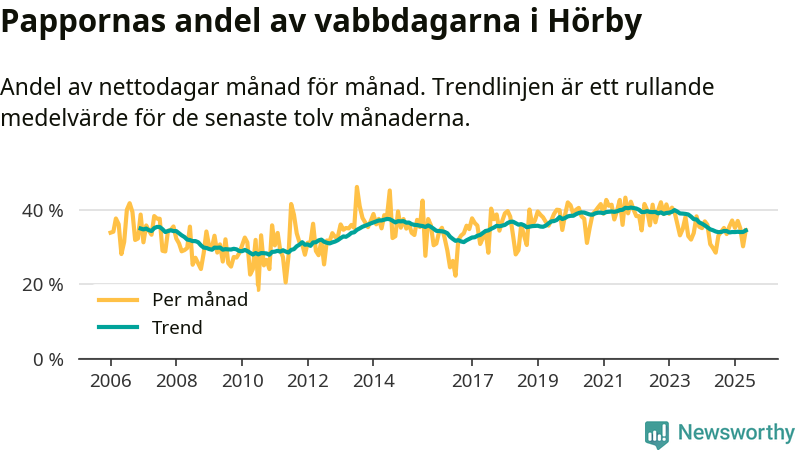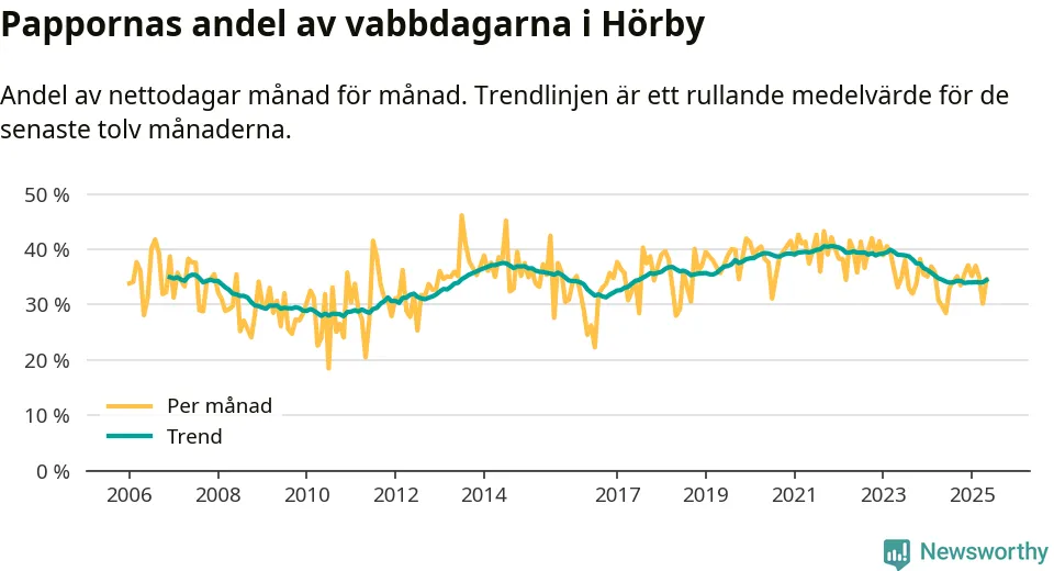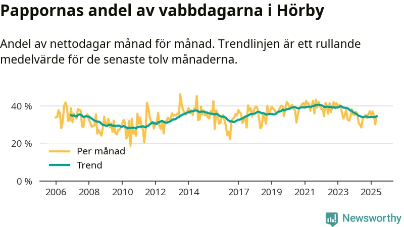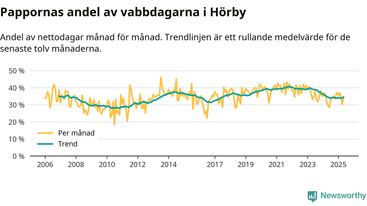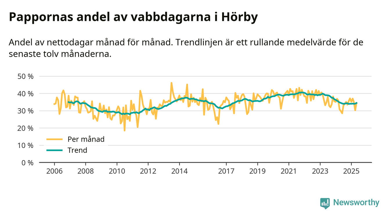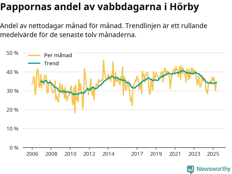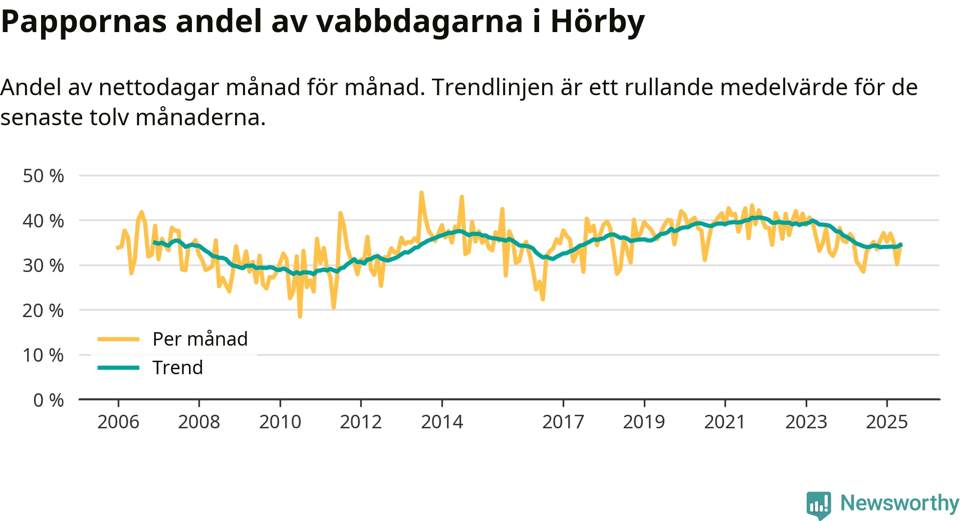 Hörby ligger en bra bit från ett jämställt uttag. Under de senaste tolv månaderna har männen stått för 34 procent av all vabb i kommunen. Pappornas uttag peakade hösten 2021 då kommunens fäder var uppe i 41 procent av vabbdagarna 1.