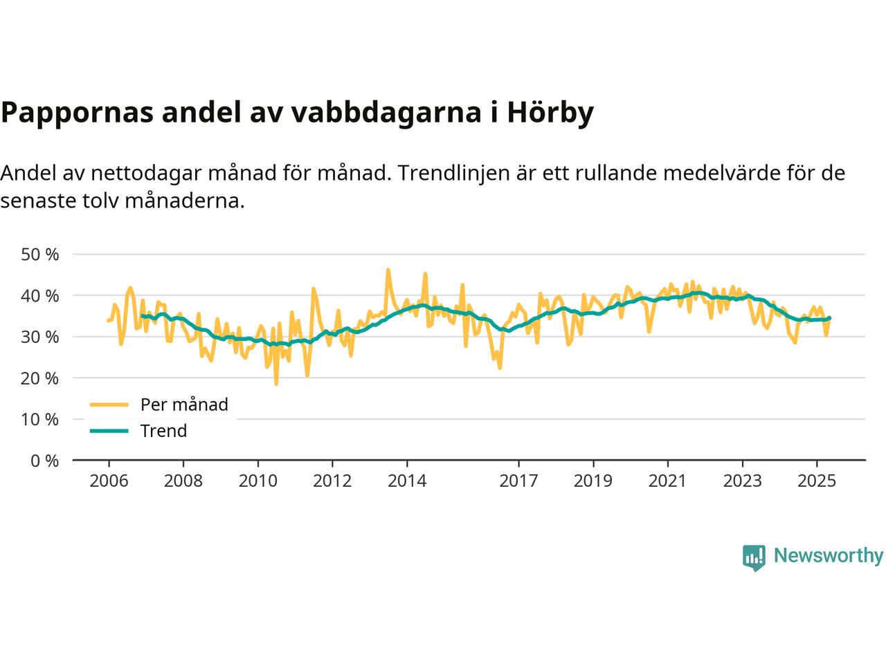 Pappor i Hörby vabbar mindre än rikssnittet (38 procent), och ungefär lika mycket som andra män i Skåne län. Skillnaderna inom landet är stora. Dorotea är den enda kommun i landet som når 50–50-fördelning.