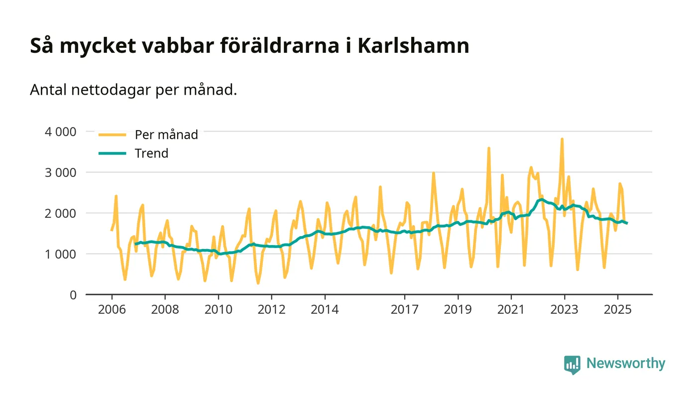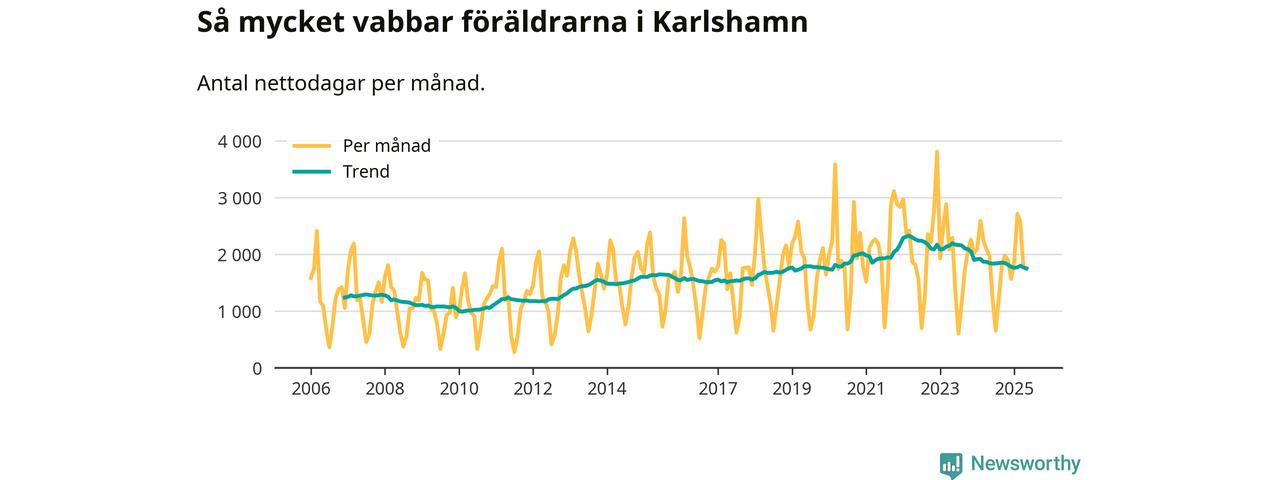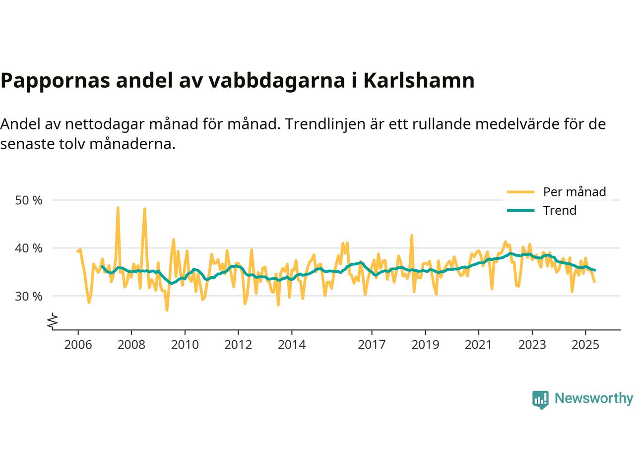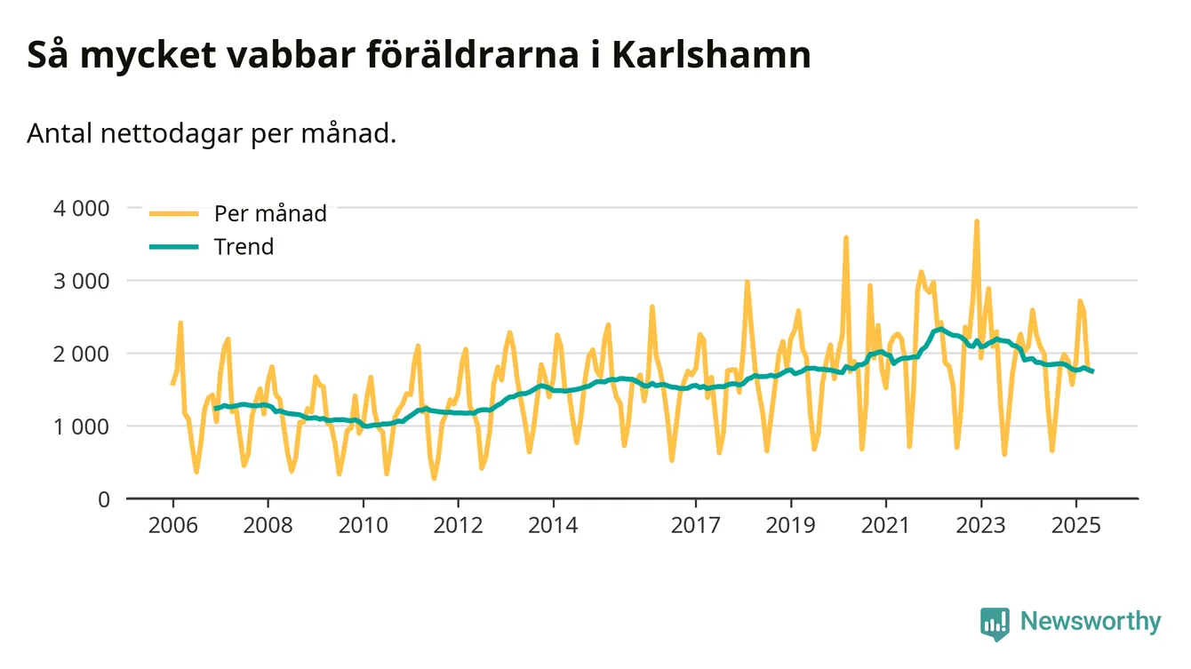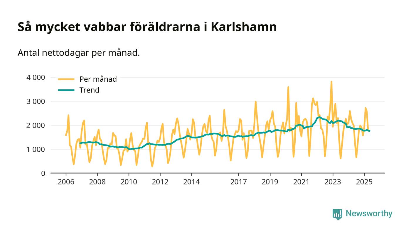 Karlshamn ligger en bit från ett jämställt uttag. Under de senaste tolv månaderna har männen stått för 35 procent av all vabb i kommunen. Det är en lägre andel än på nästan sex år.