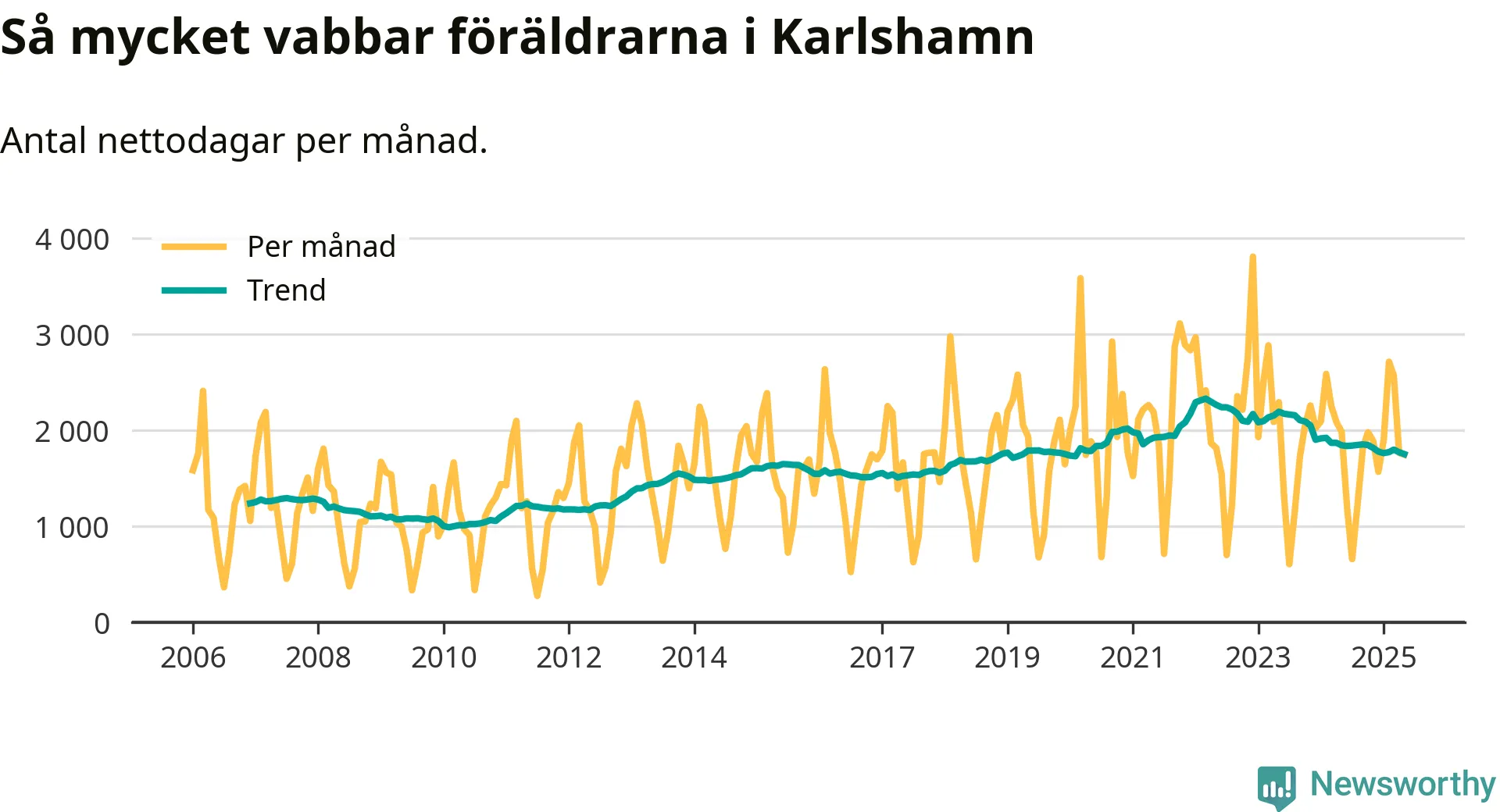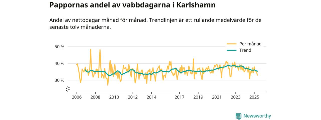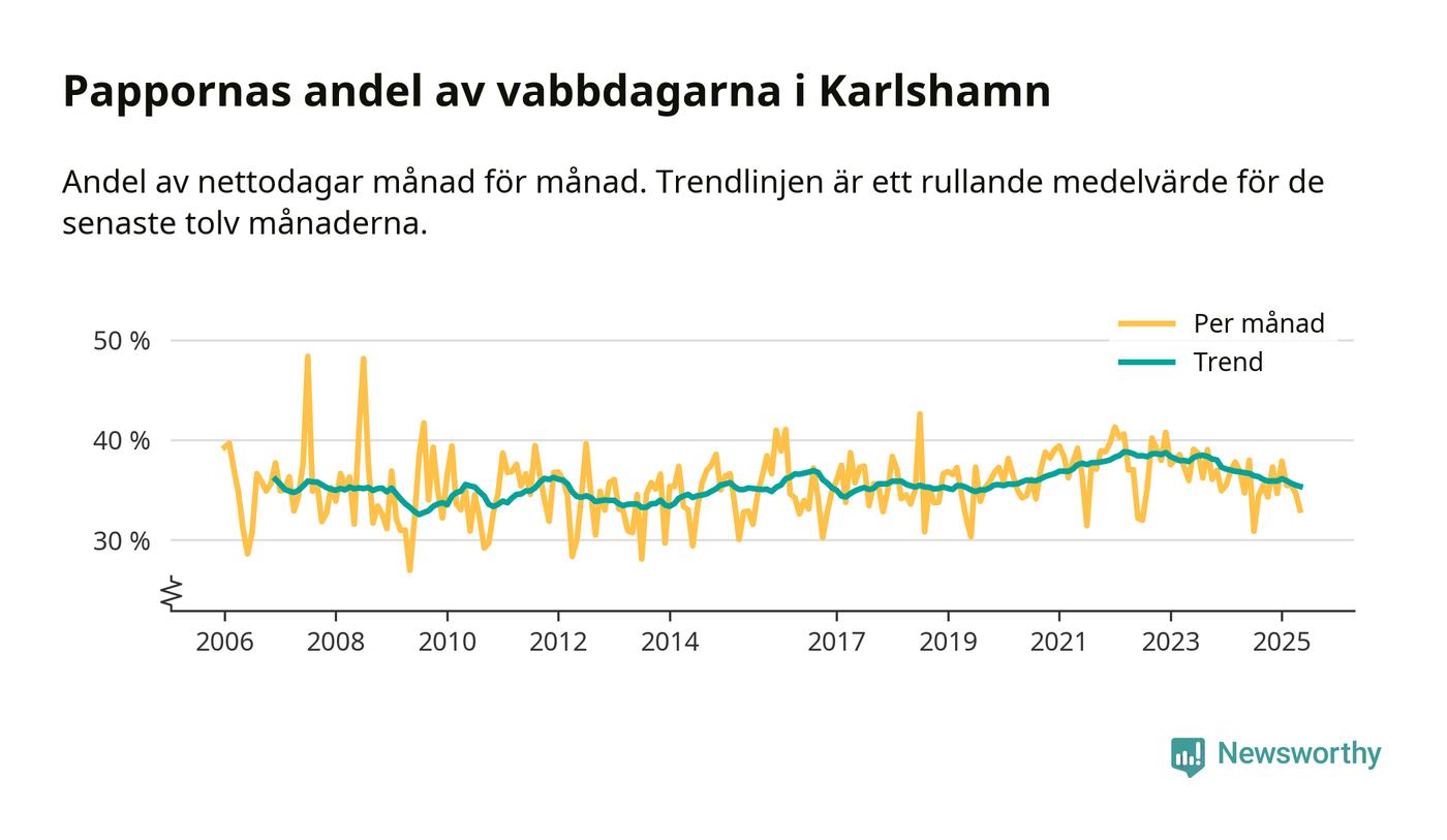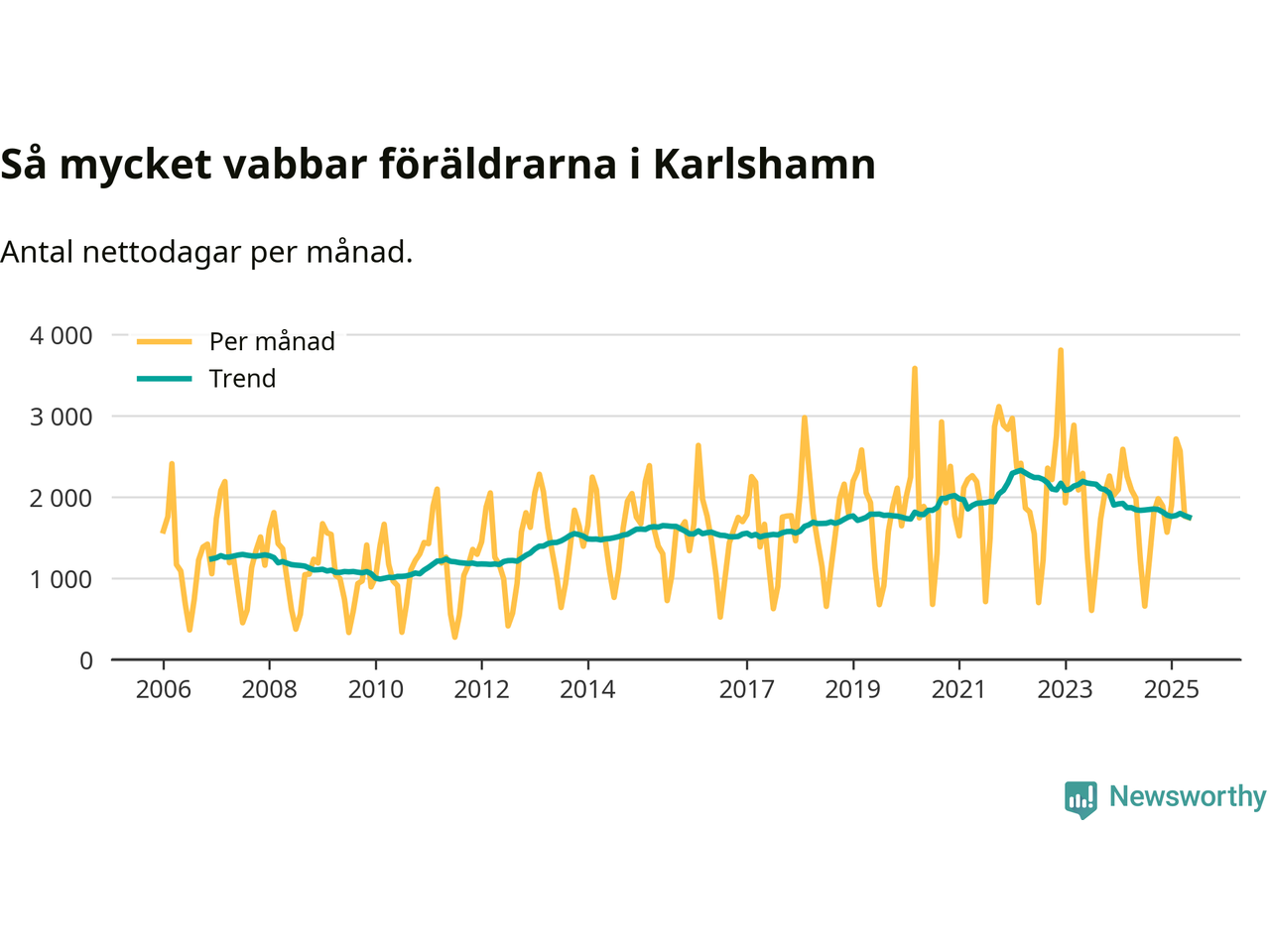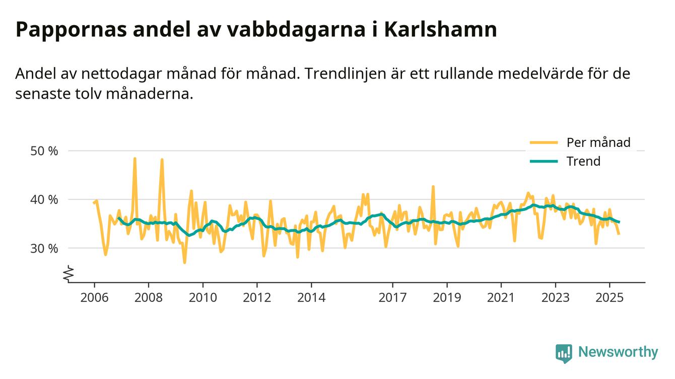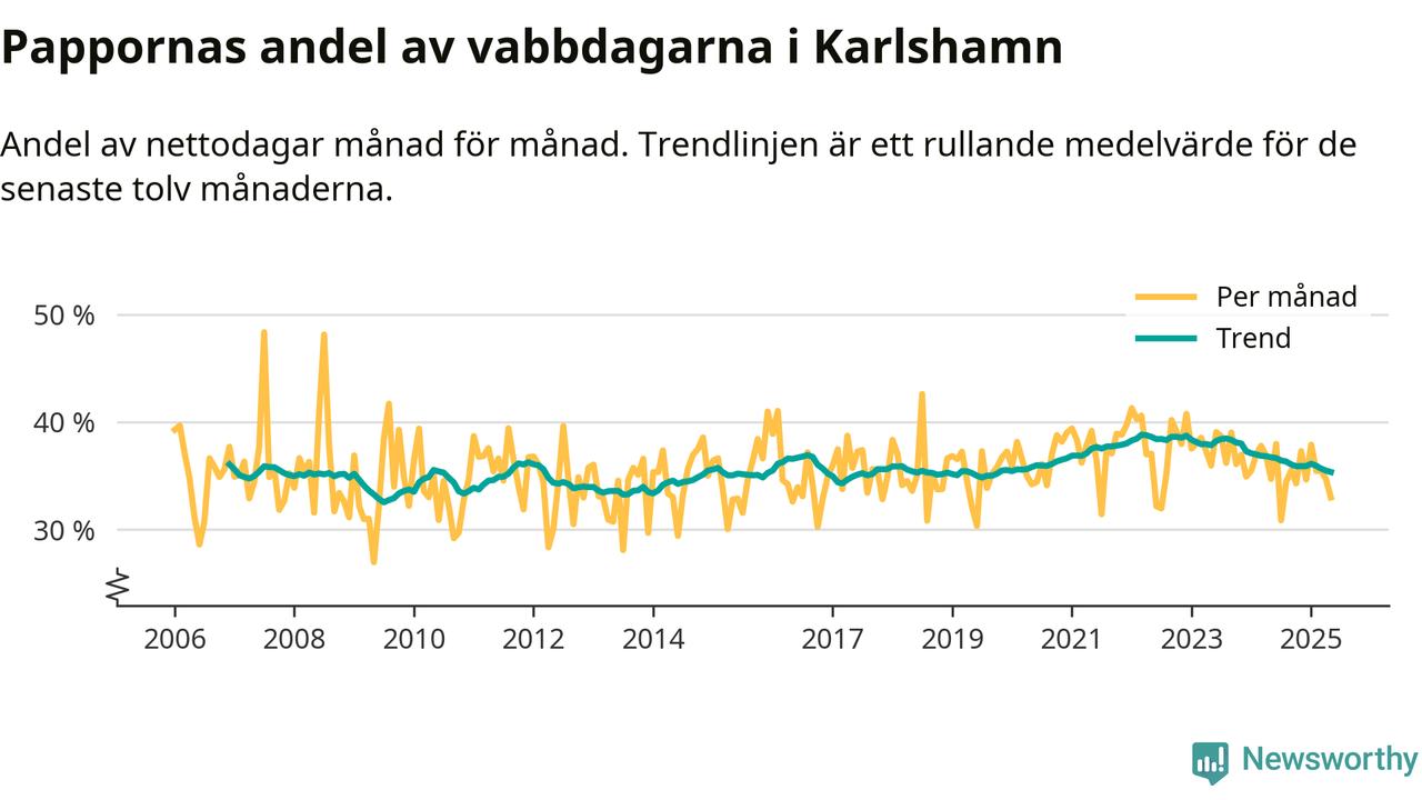 Karlshamn ligger en bit från ett jämställt uttag. Under de senaste tolv månaderna har männen stått för 35 procent av all vabb i kommunen. Det är en lägre andel än på nästan sex år.