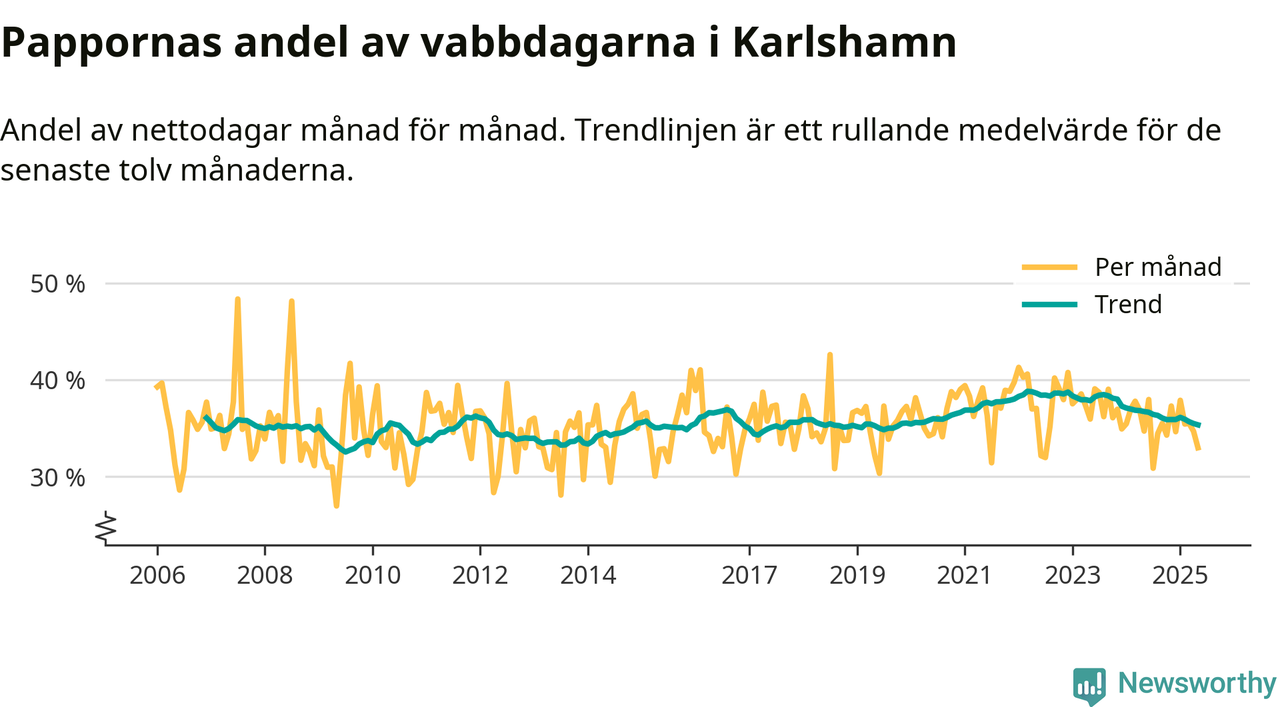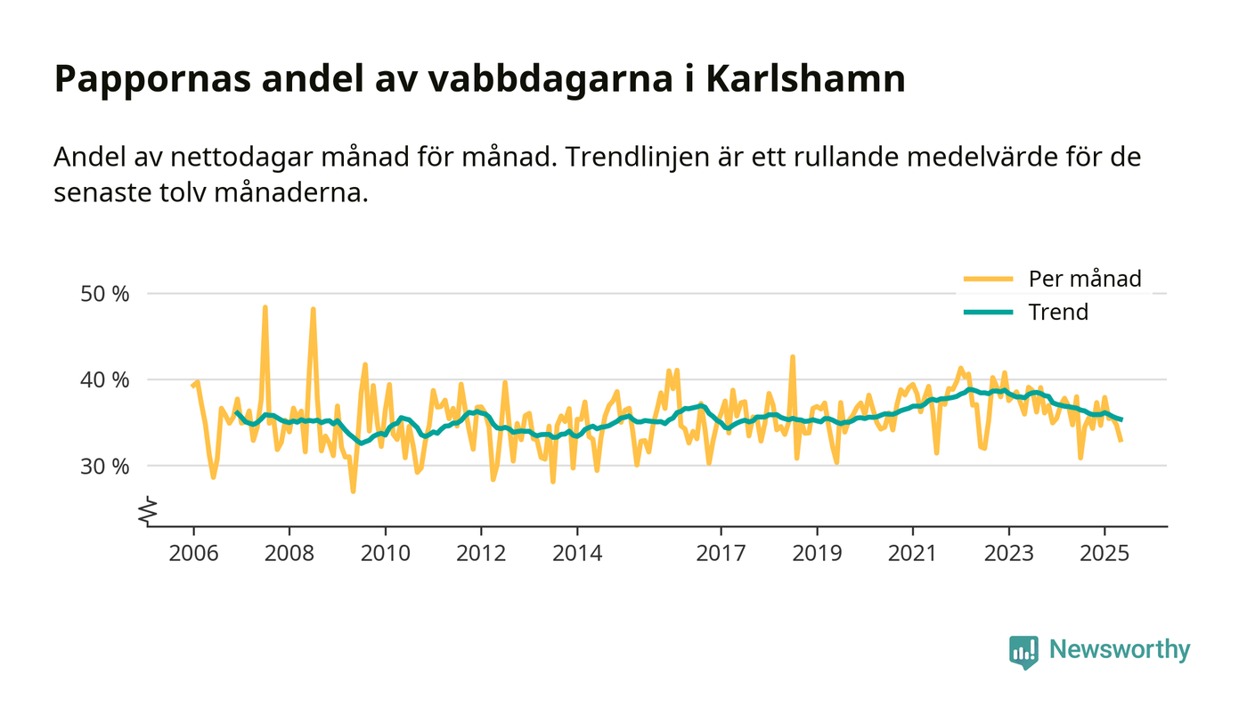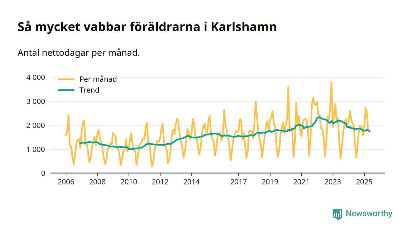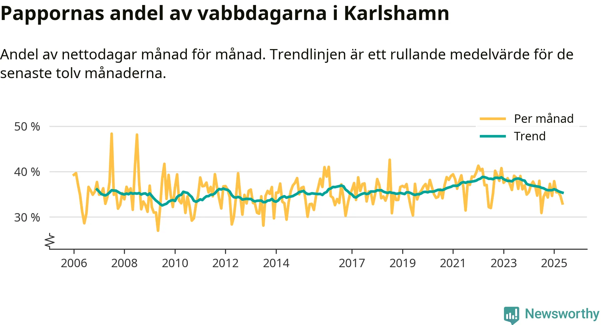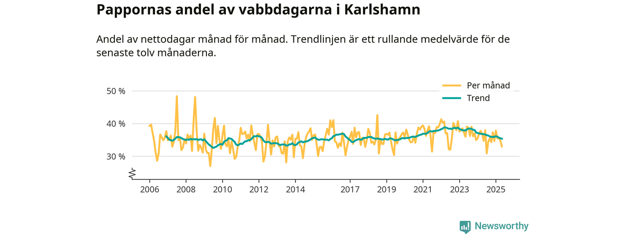 Karlshamn ligger en bit från ett jämställt uttag. Under de senaste tolv månaderna har männen stått för 35 procent av all vabb i kommunen. Det är en lägre andel än på nästan sex år.