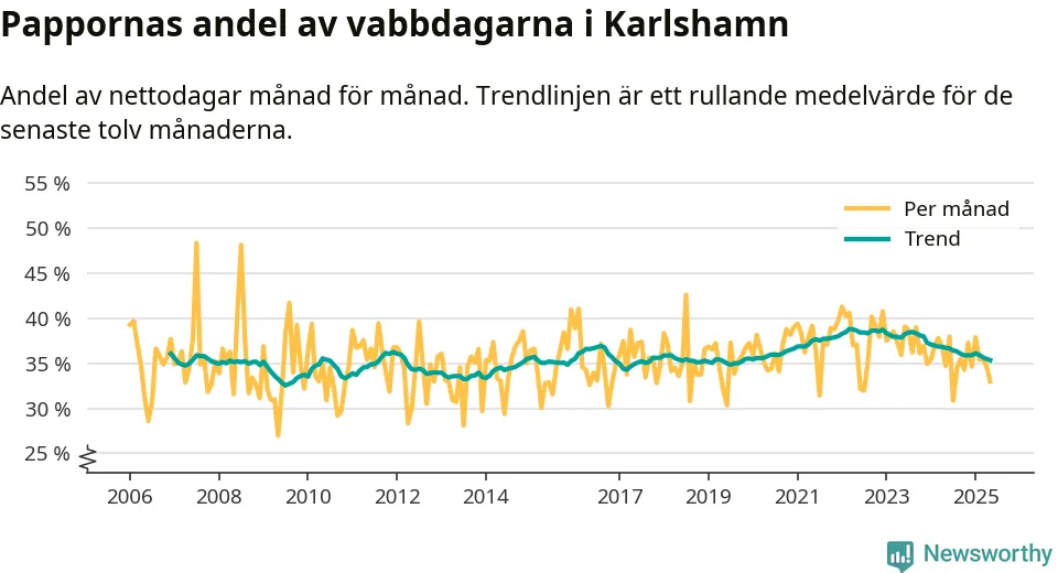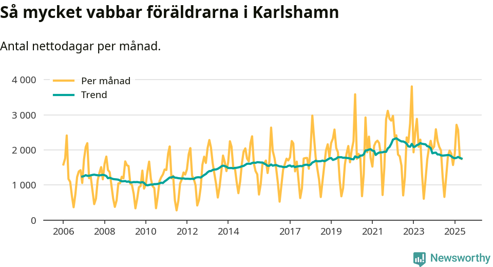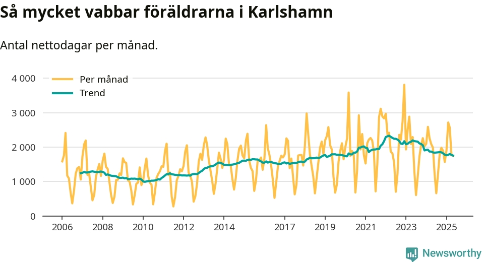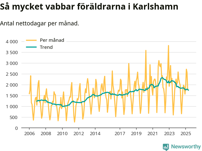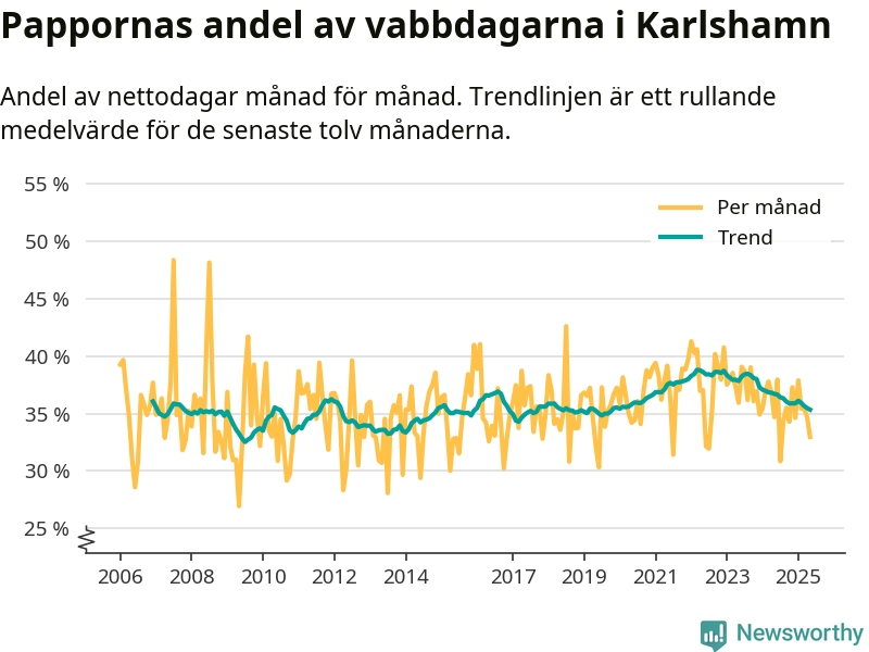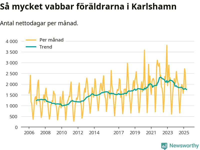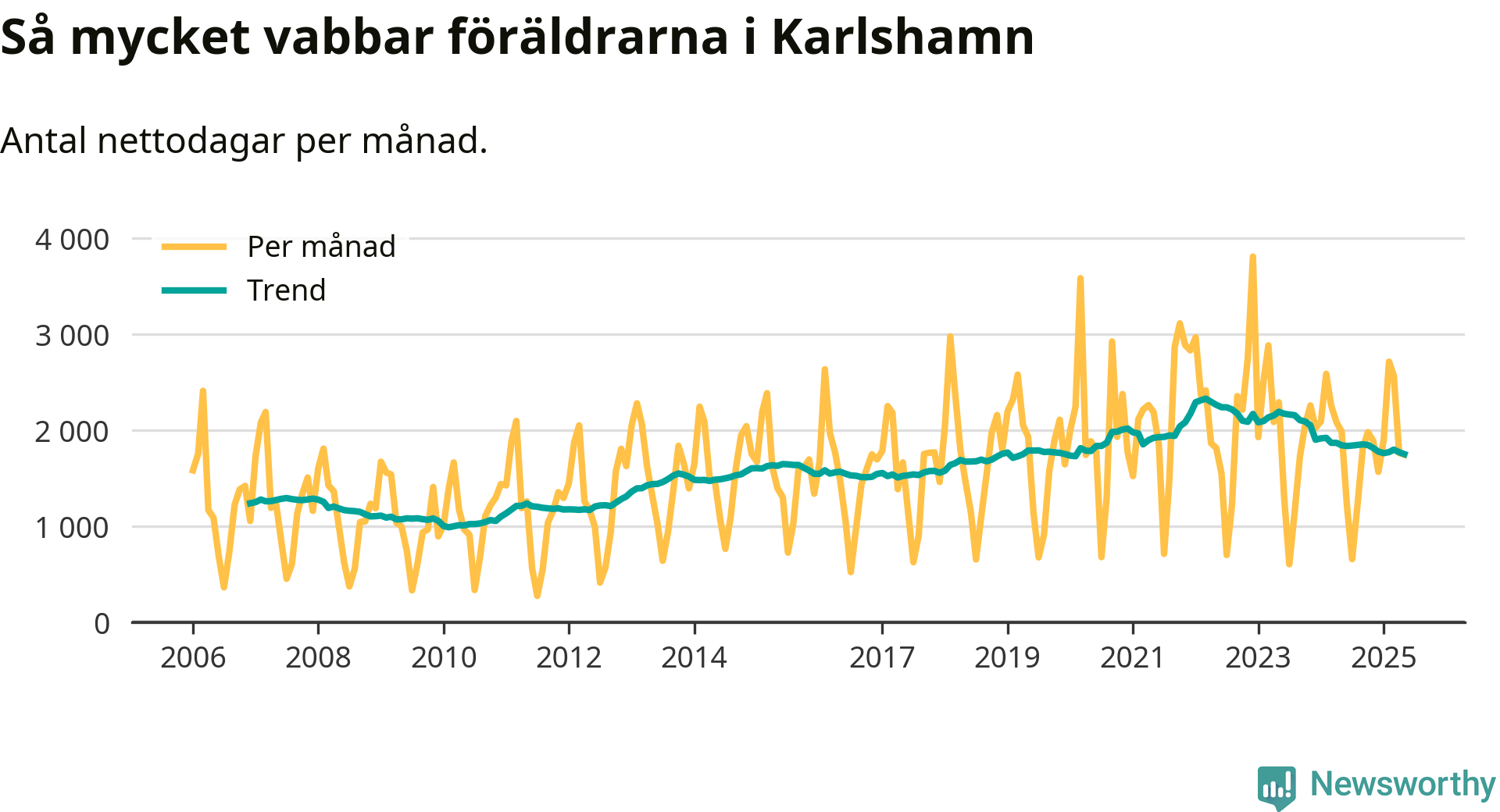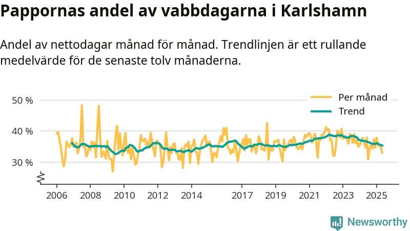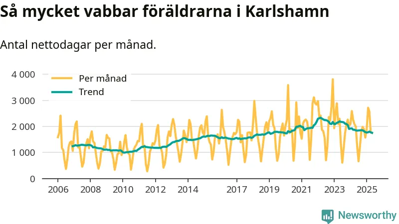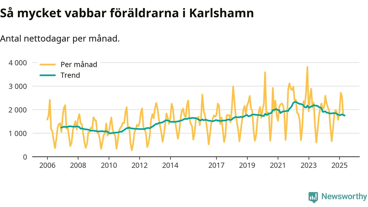 Karlshamn ligger en bit från ett jämställt uttag. Under de senaste tolv månaderna har männen stått för 35 procent av all vabb i kommunen. Det är en lägre andel än på nästan sex år.