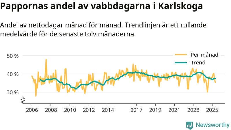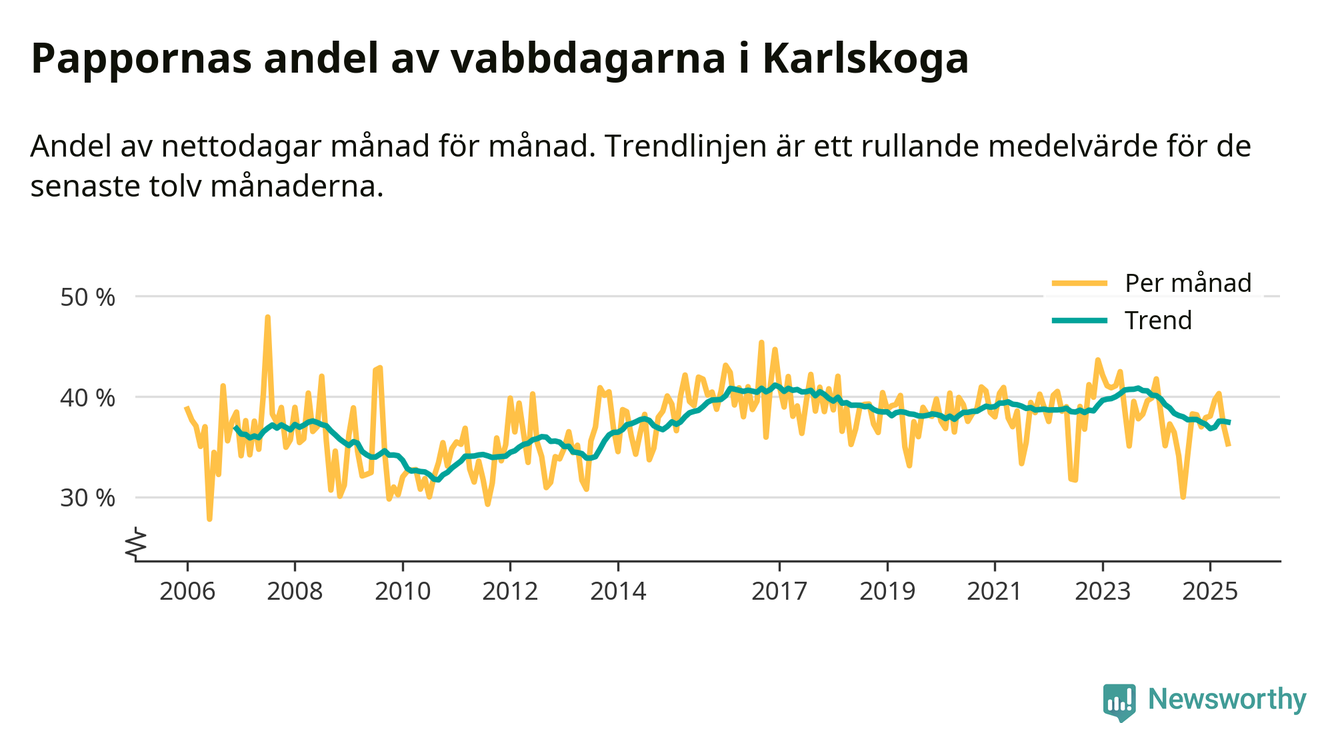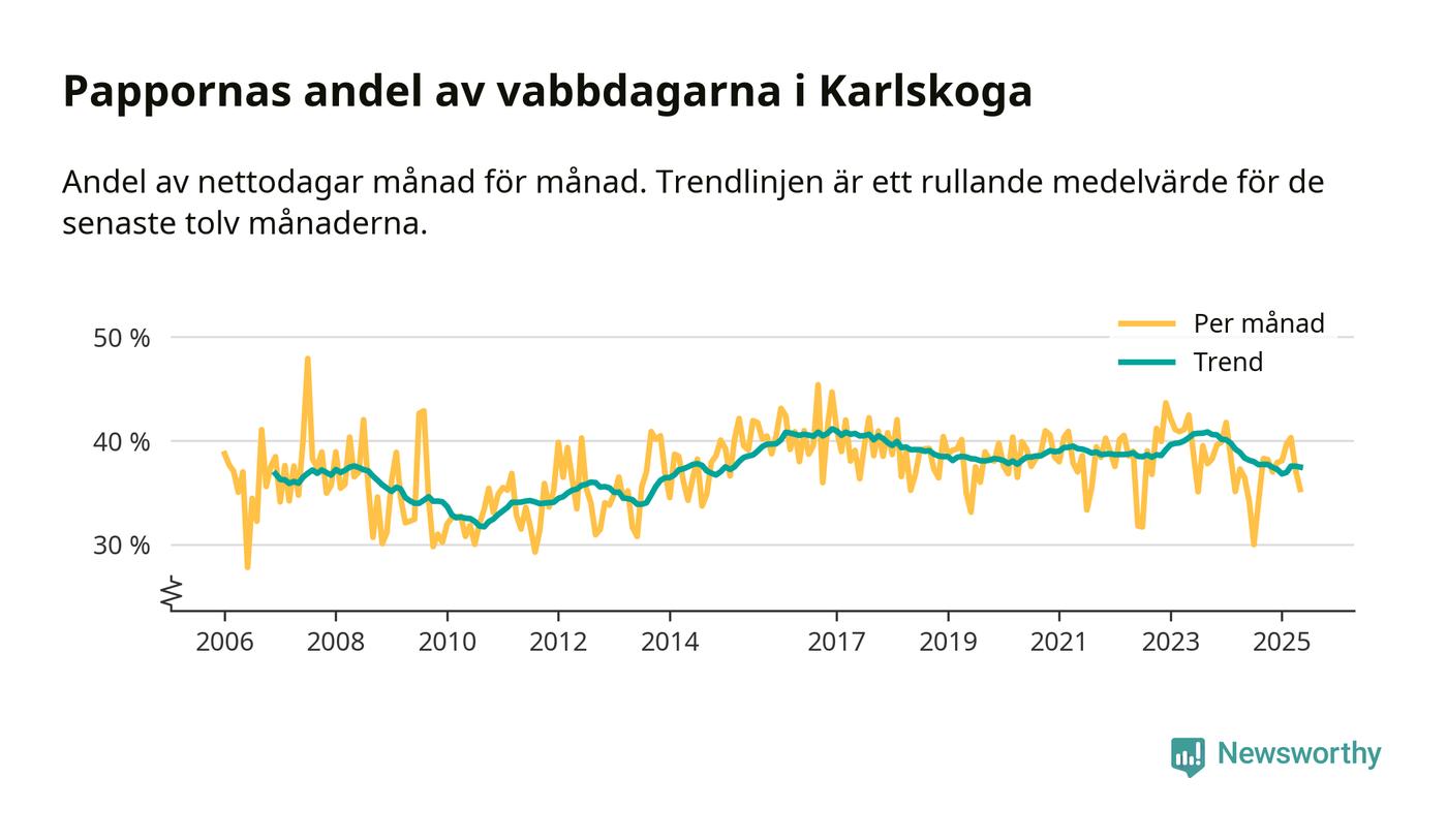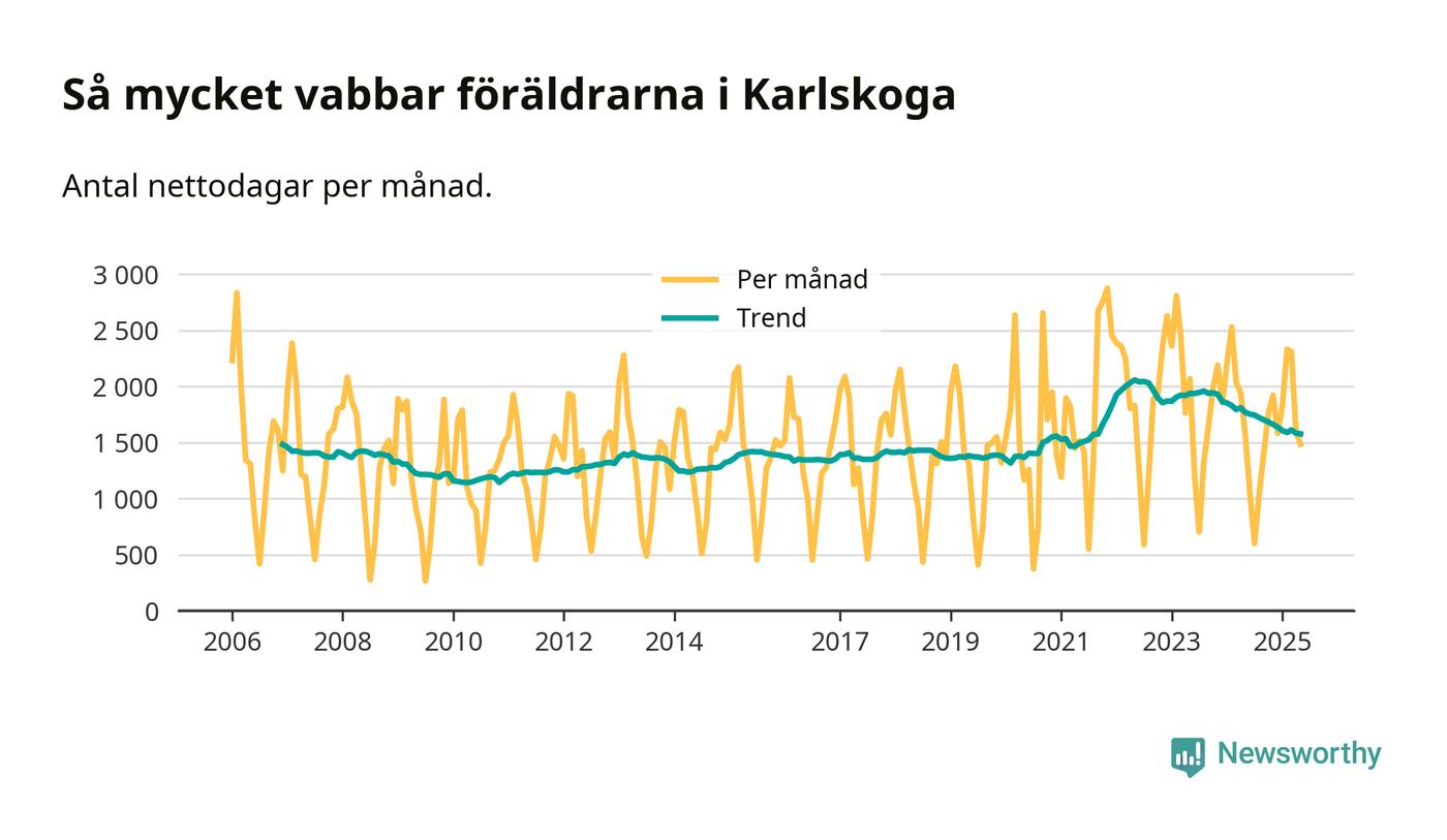 Karlskoga ligger en bit från ett jämställt uttag. Under de senaste tolv månaderna har männen stått för 37 procent av all vabb i kommunen. I år har andelen varit lägre än på över tio år.