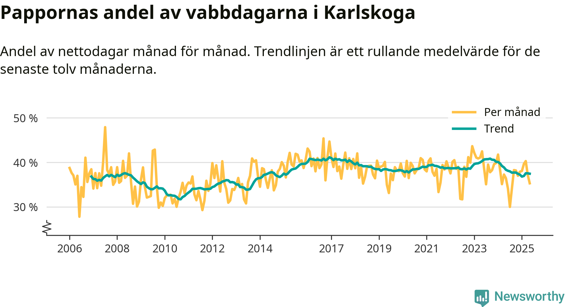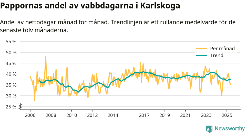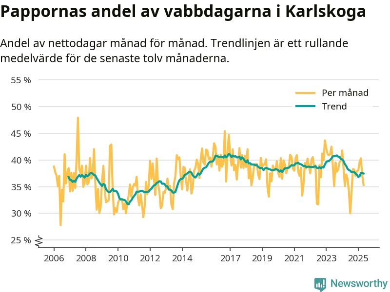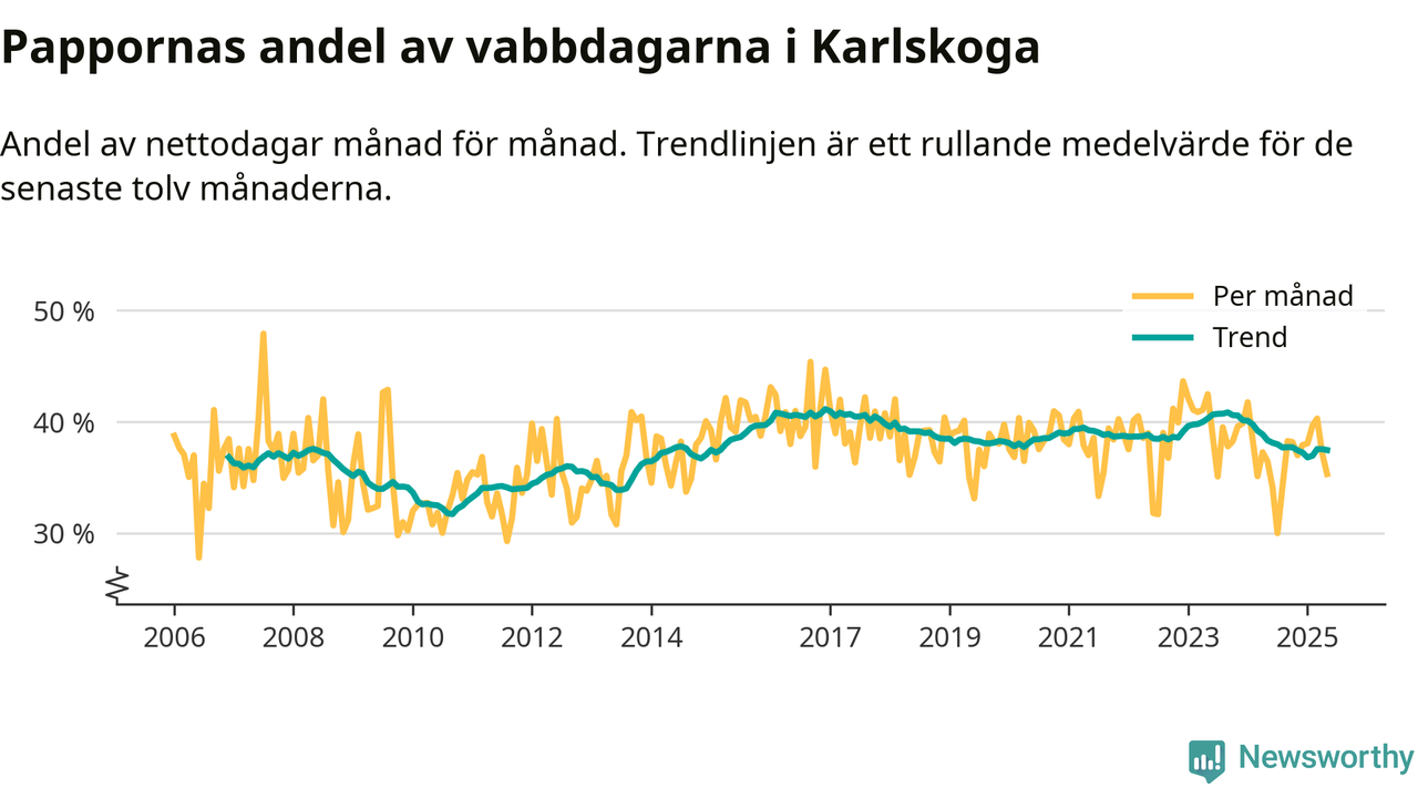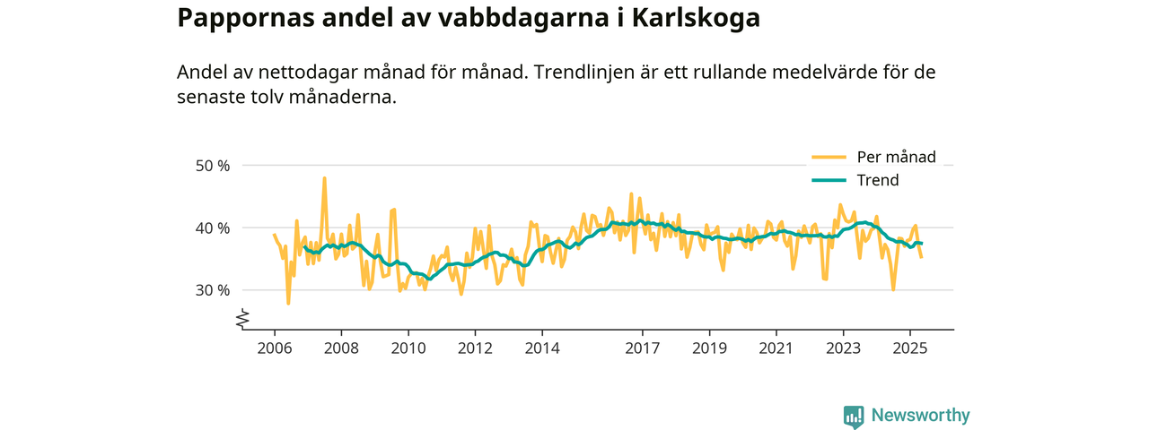 Karlskoga ligger en bit från ett jämställt uttag. Under de senaste tolv månaderna har männen stått för 37 procent av all vabb i kommunen. I år har andelen varit lägre än på över tio år.