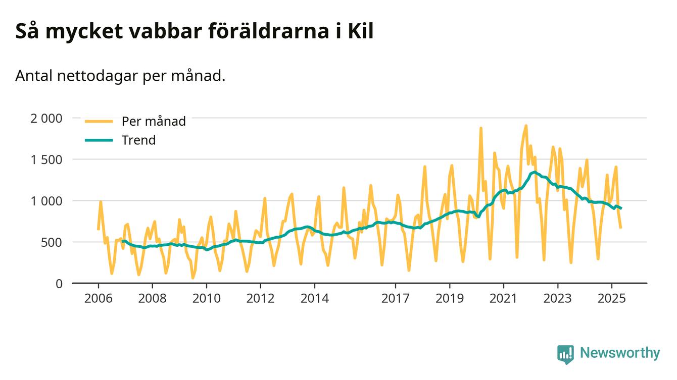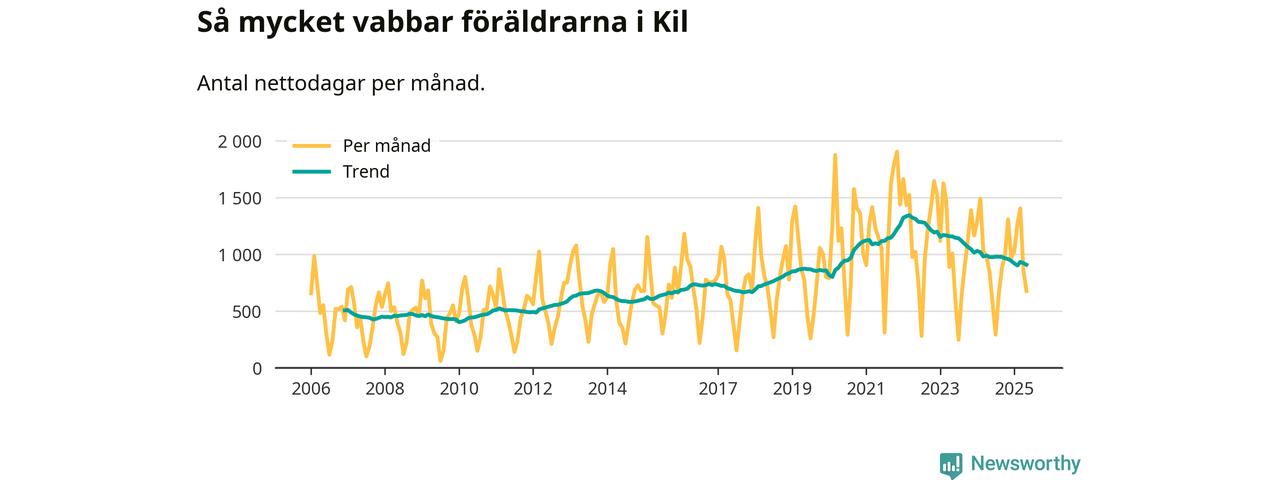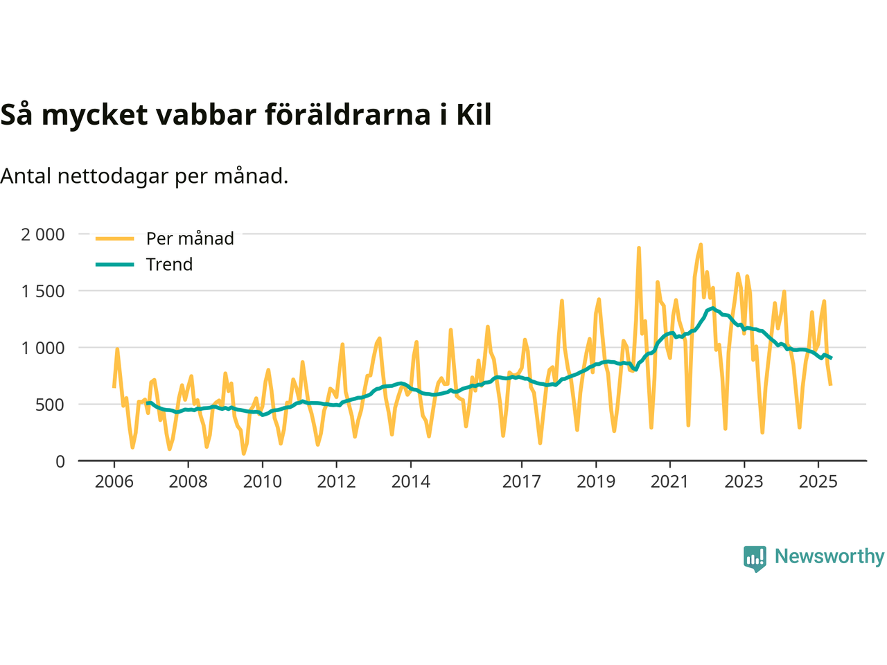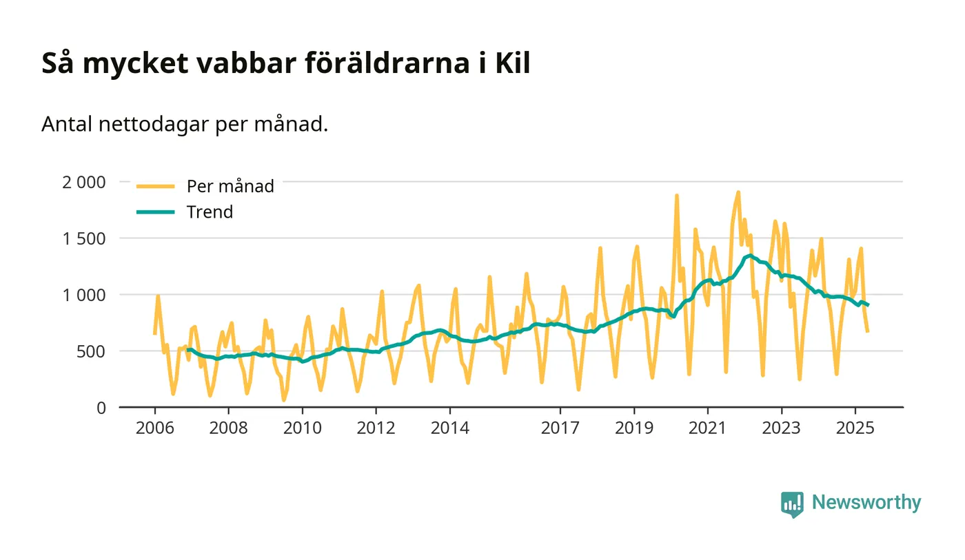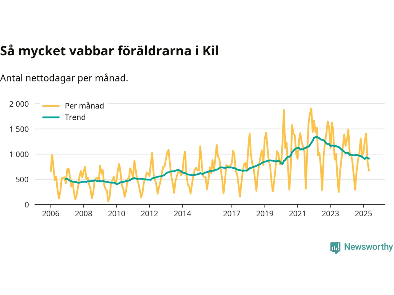 Kil ligger en bit från ett jämställt uttag. Under de senaste tolv månaderna har männen stått för 37 procent av all vabb i kommunen. Pappornas uttag peakade hösten 2021 då kommunens fäder var uppe i 42 procent av vabbdagarna 1.