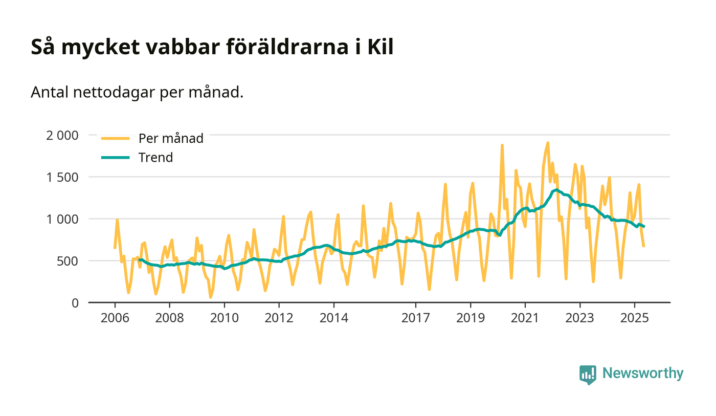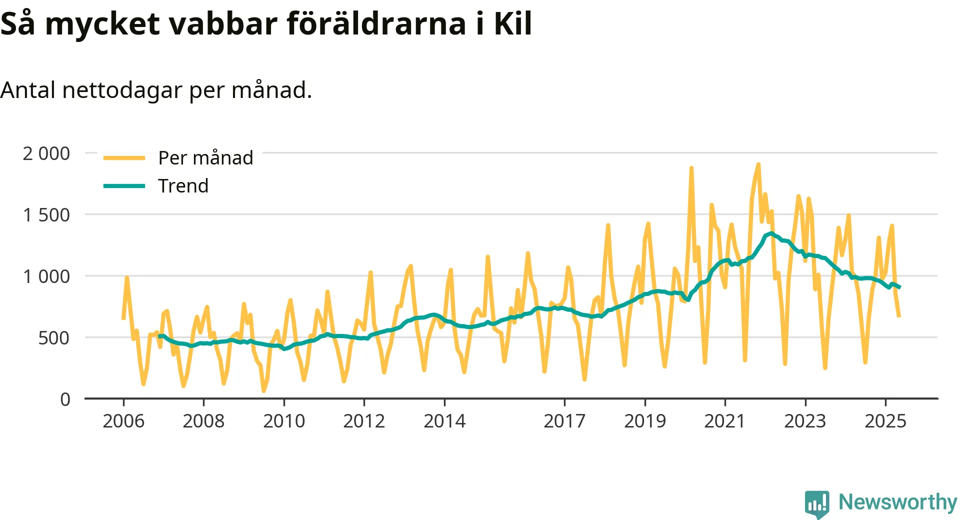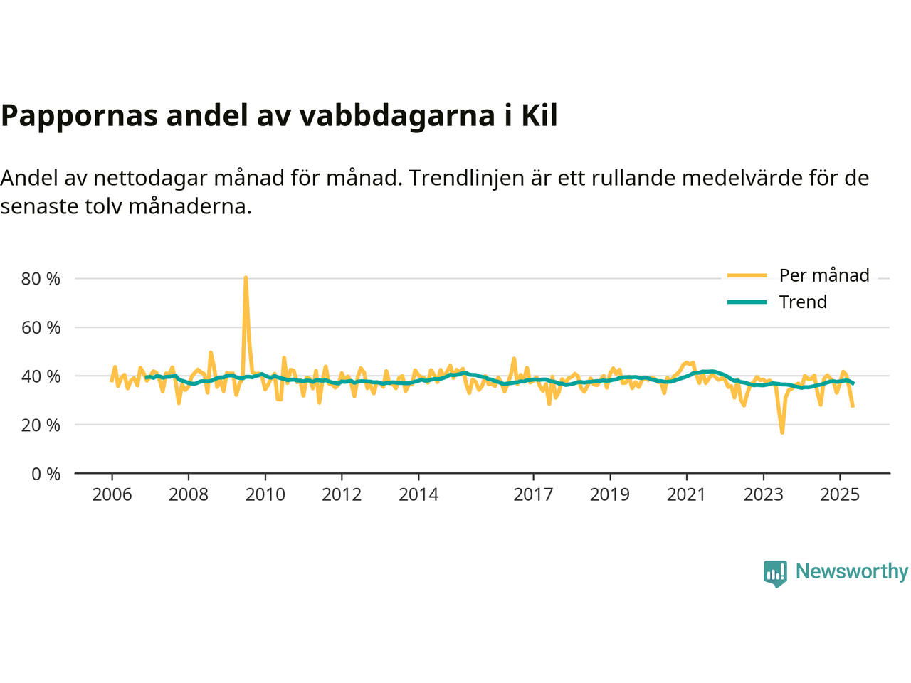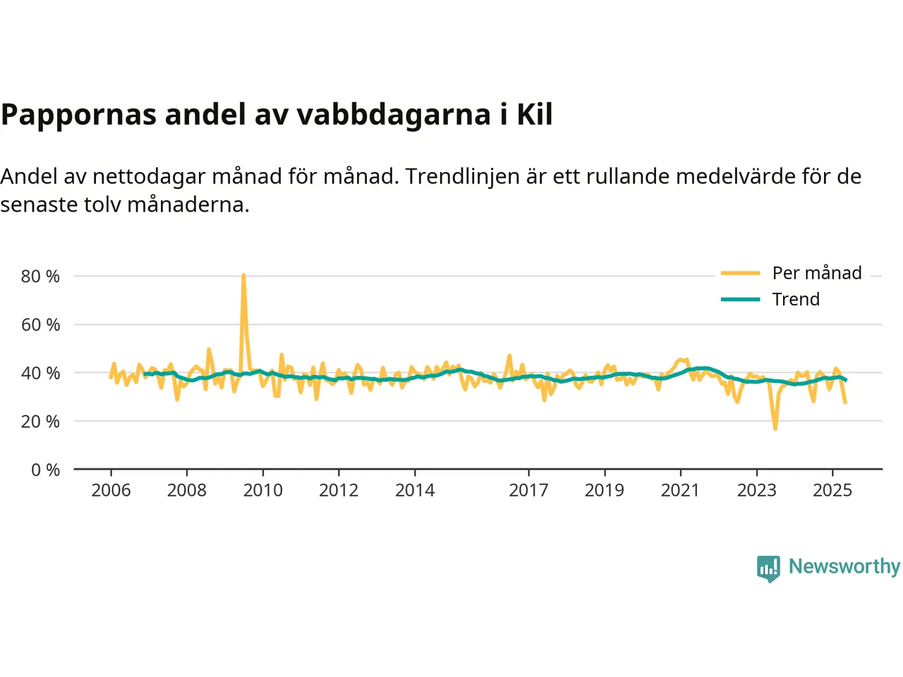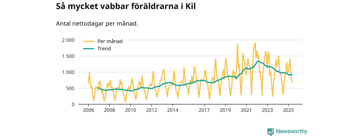 Kil ligger en bit från ett jämställt uttag. Under de senaste tolv månaderna har männen stått för 37 procent av all vabb i kommunen. Pappornas uttag peakade hösten 2021 då kommunens fäder var uppe i 42 procent av vabbdagarna 1.