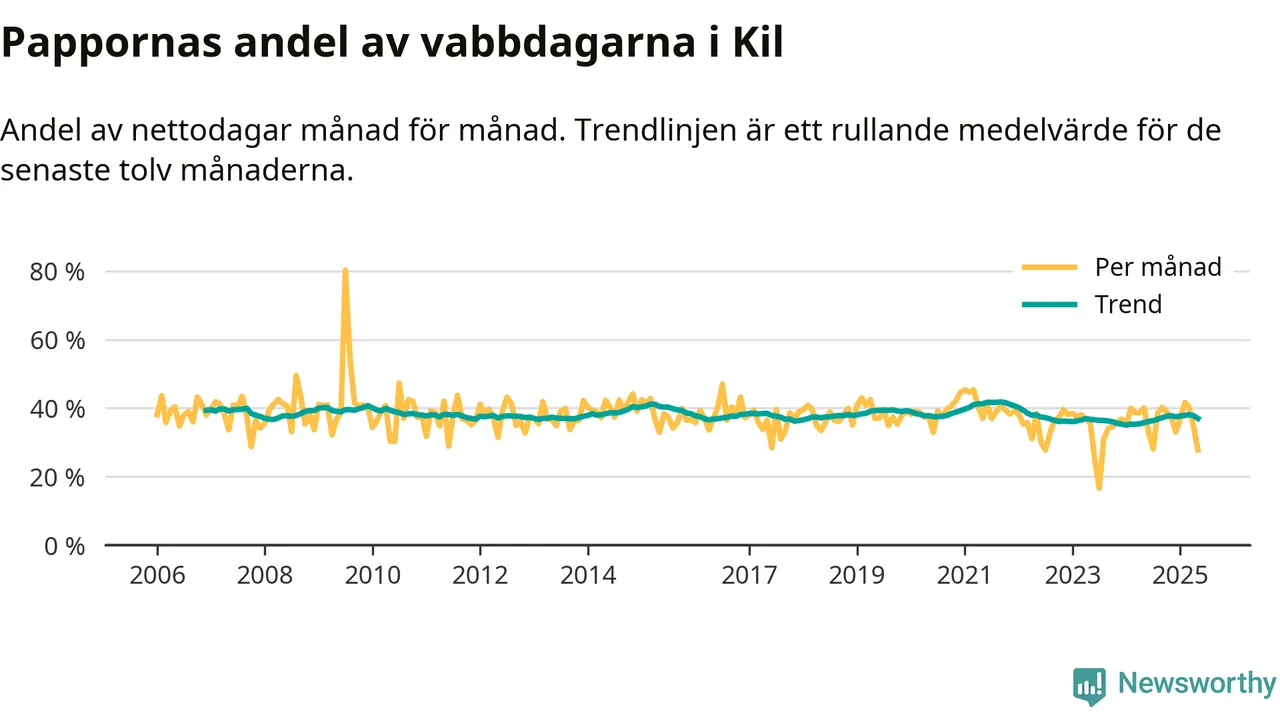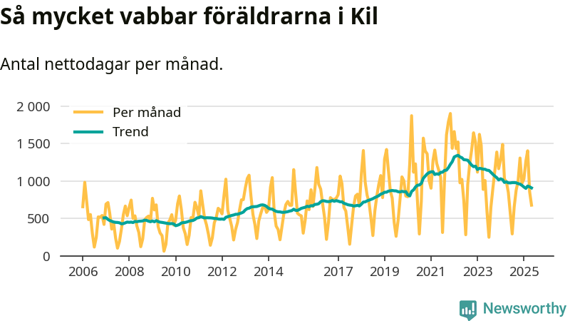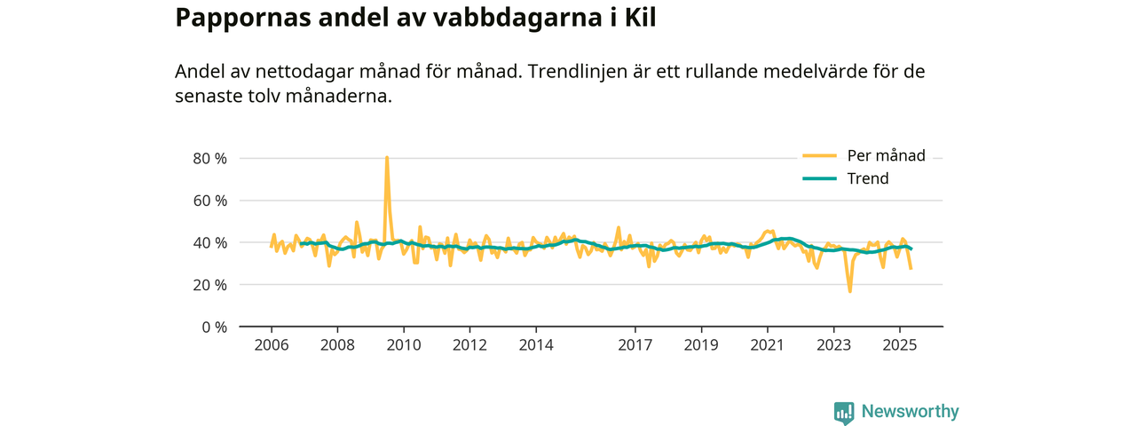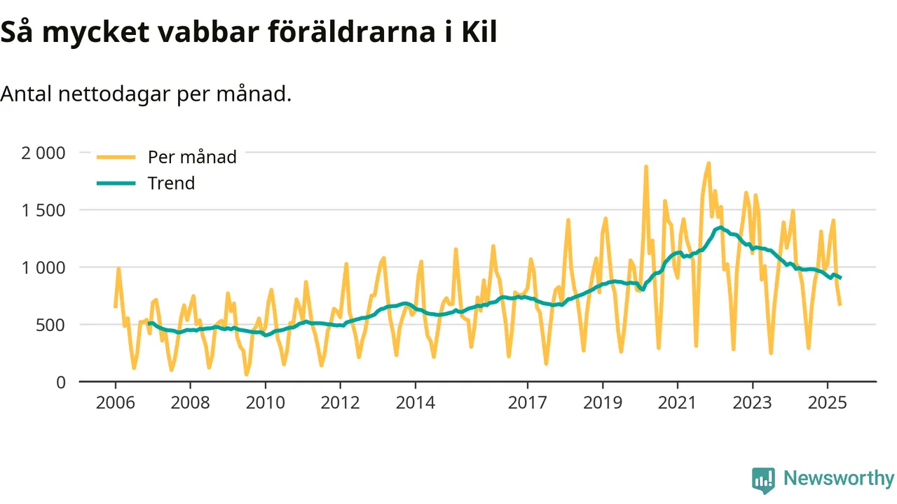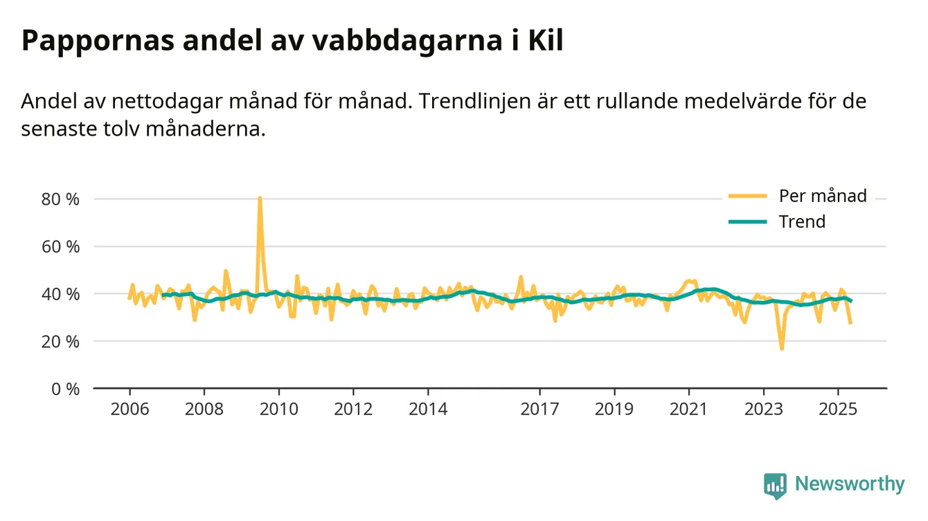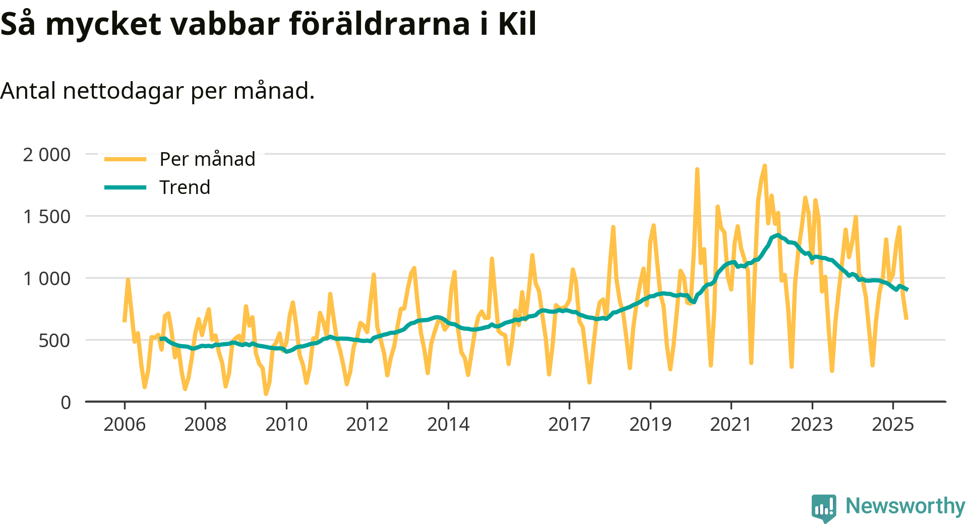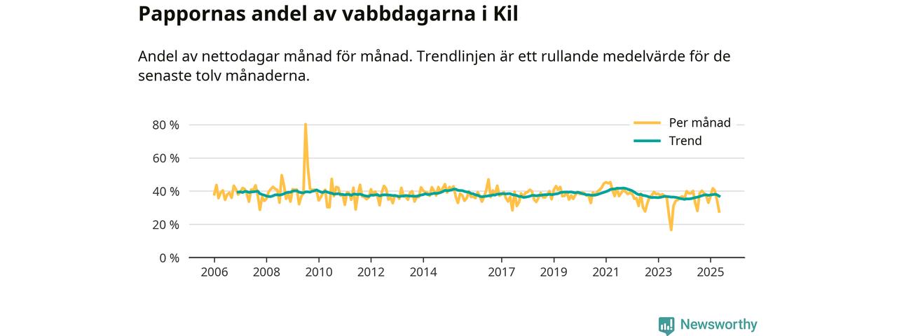 Kil ligger en bit från ett jämställt uttag. Under de senaste tolv månaderna har männen stått för 37 procent av all vabb i kommunen. Pappornas uttag peakade hösten 2021 då kommunens fäder var uppe i 42 procent av vabbdagarna 1.