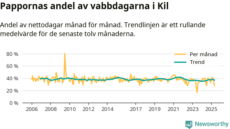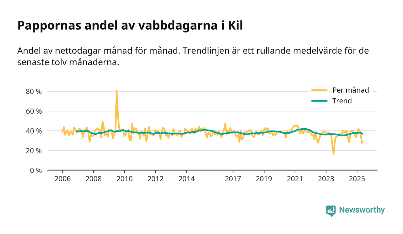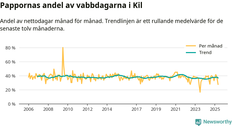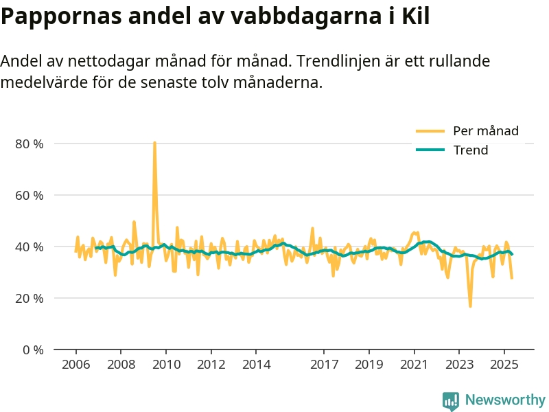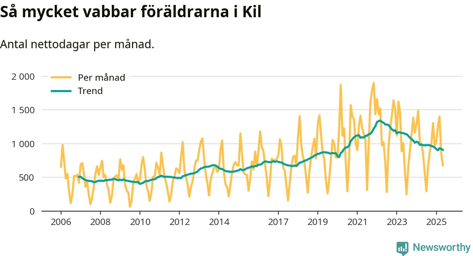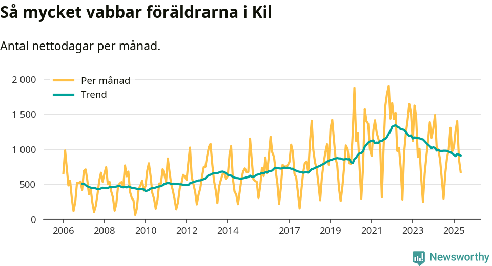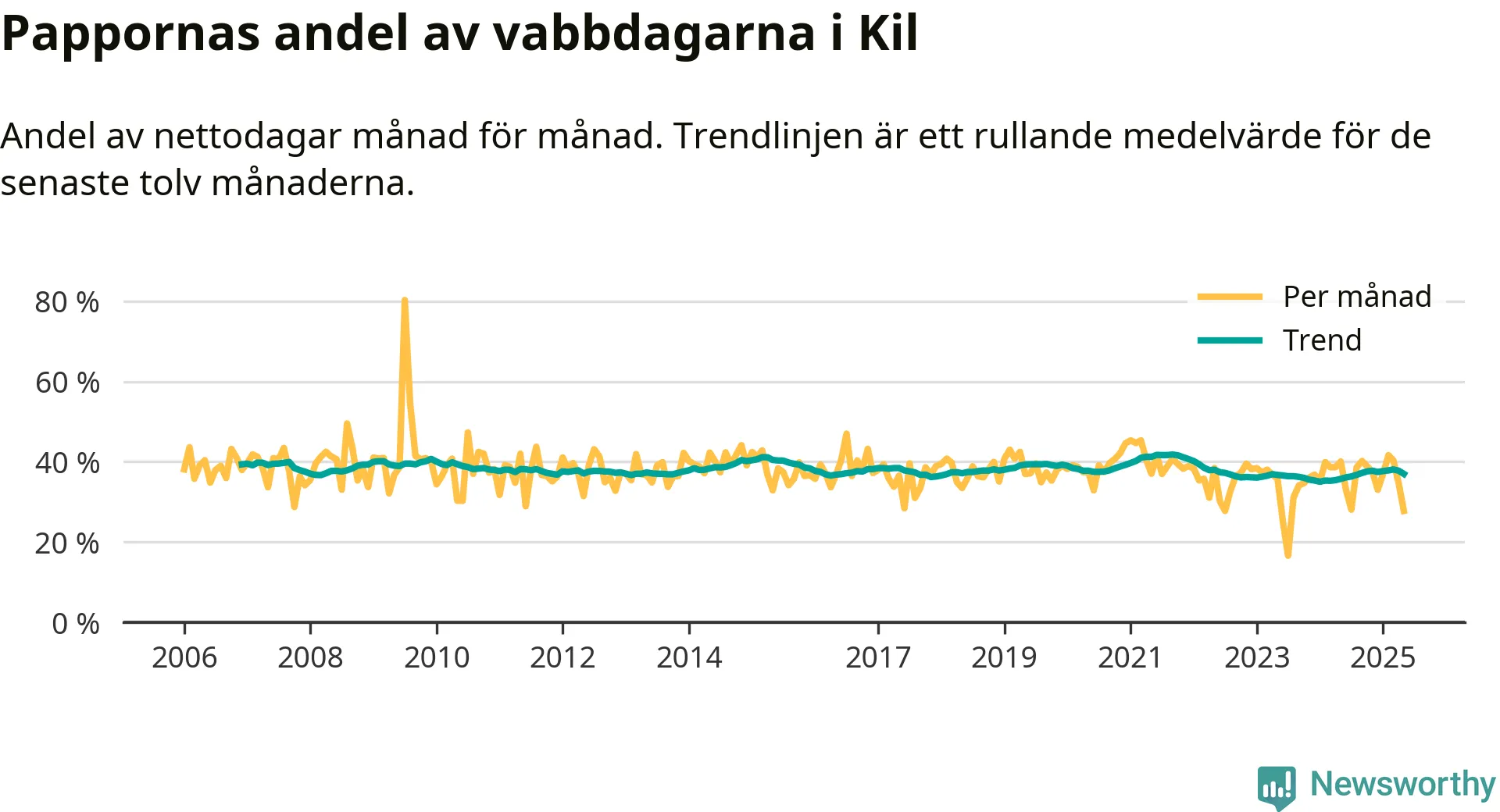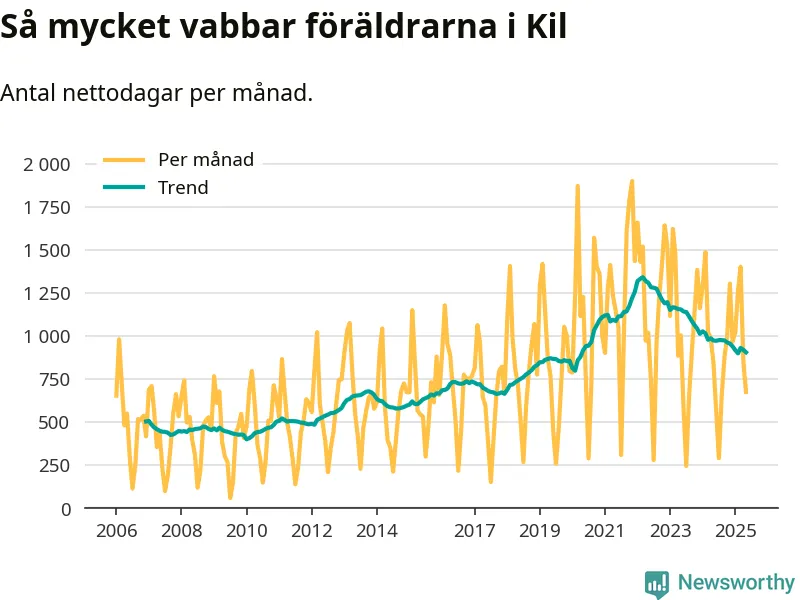 Kil ligger en bit från ett jämställt uttag. Under de senaste tolv månaderna har männen stått för 37 procent av all vabb i kommunen. Pappornas uttag peakade hösten 2021 då kommunens fäder var uppe i 42 procent av vabbdagarna 1.