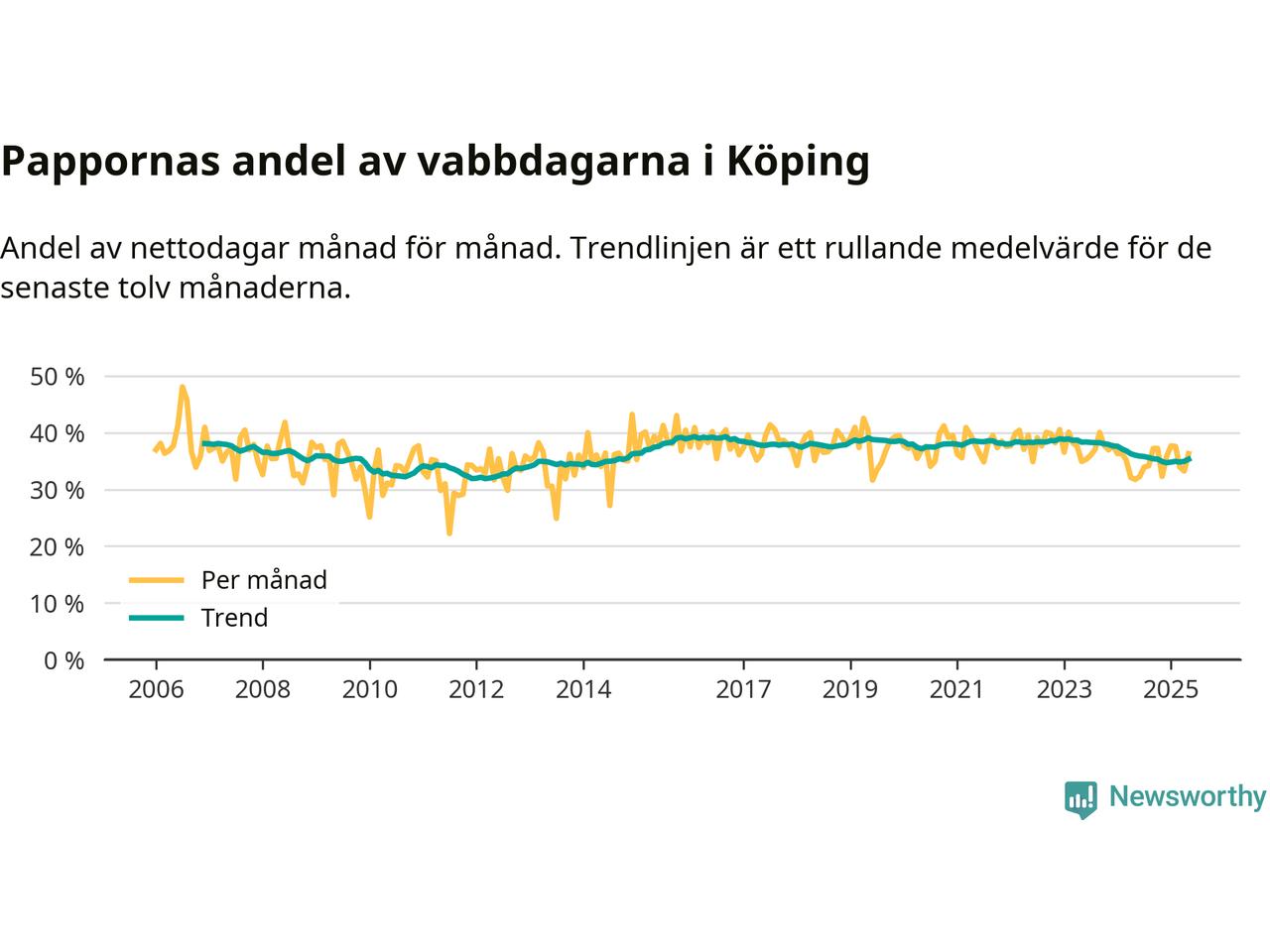 Köping ligger en bit från ett jämställt uttag. Under de senaste tolv månaderna har männen stått för 35 procent av all vabb i kommunen. I år har andelen varit lägre än på nästan elva år.