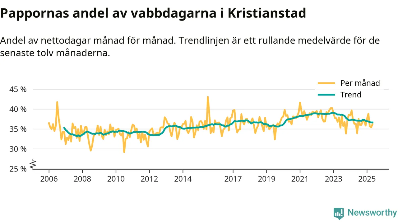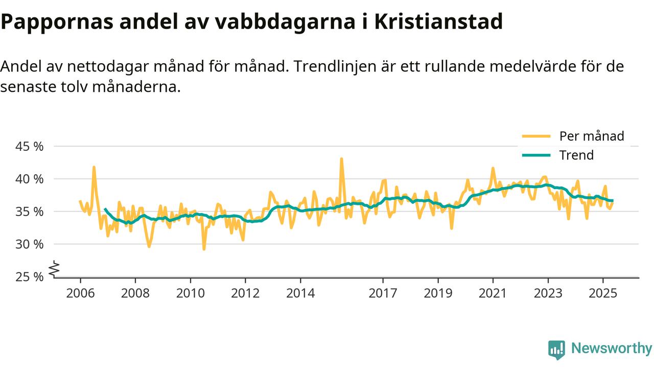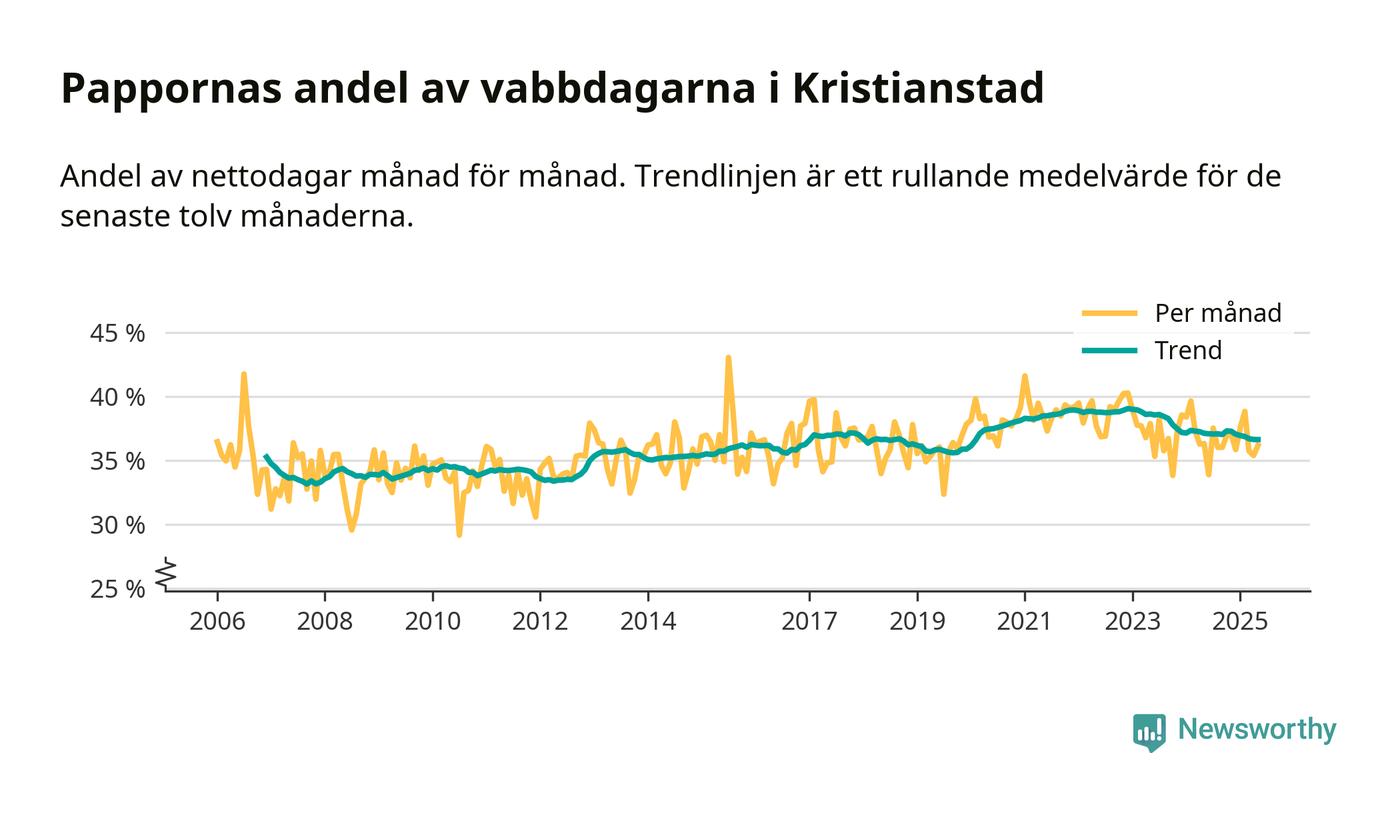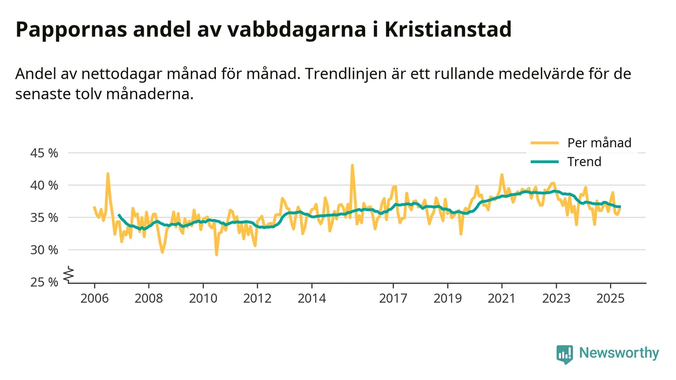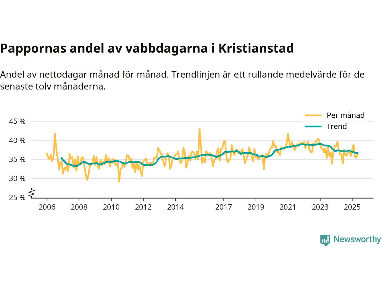 Kristianstad ligger en bit från ett jämställt uttag. Under de senaste tolv månaderna har männen stått för 37 procent av all vabb i kommunen. Det är en lägre andel än på över fem år.