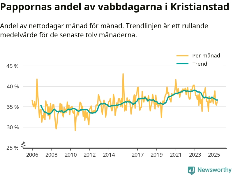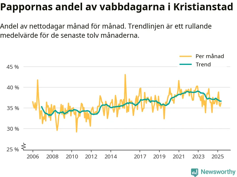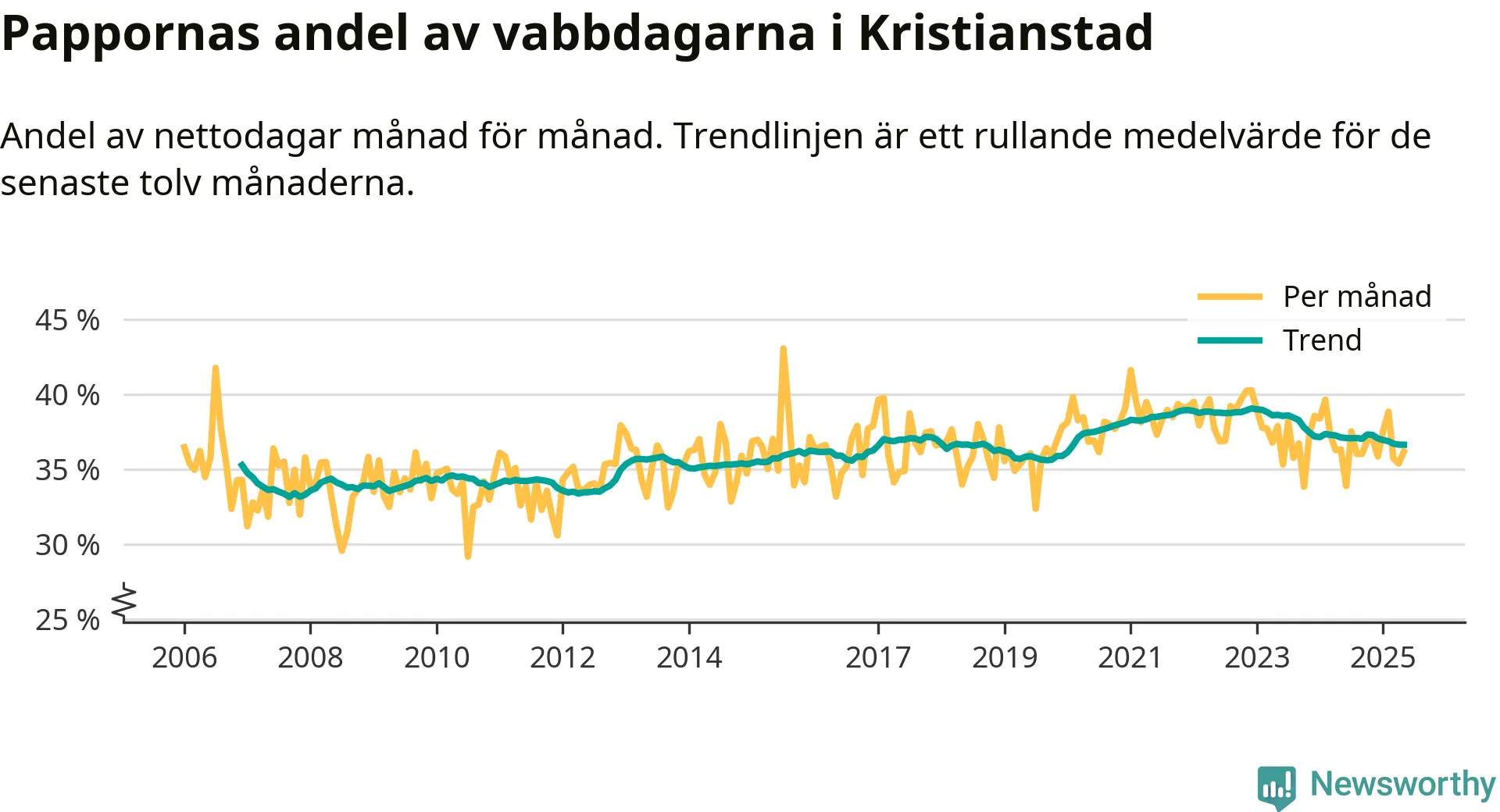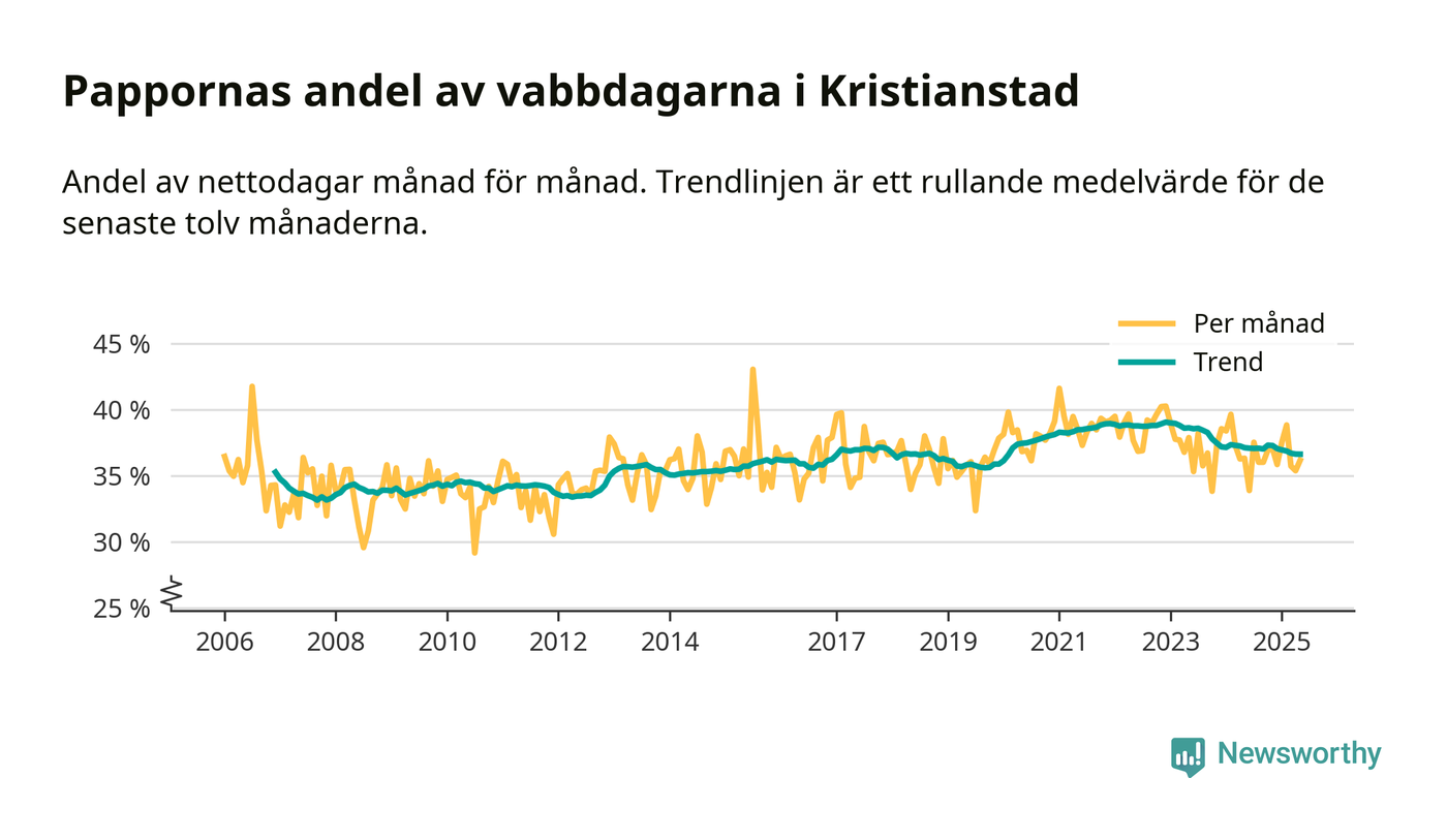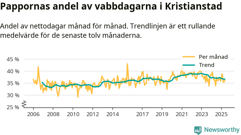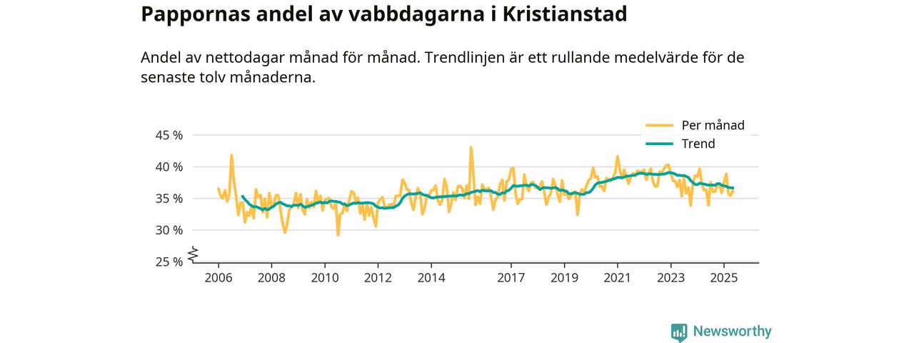 Kristianstad ligger en bit från ett jämställt uttag. Under de senaste tolv månaderna har männen stått för 37 procent av all vabb i kommunen. Det är en lägre andel än på över fem år.