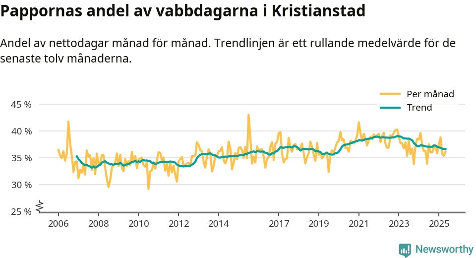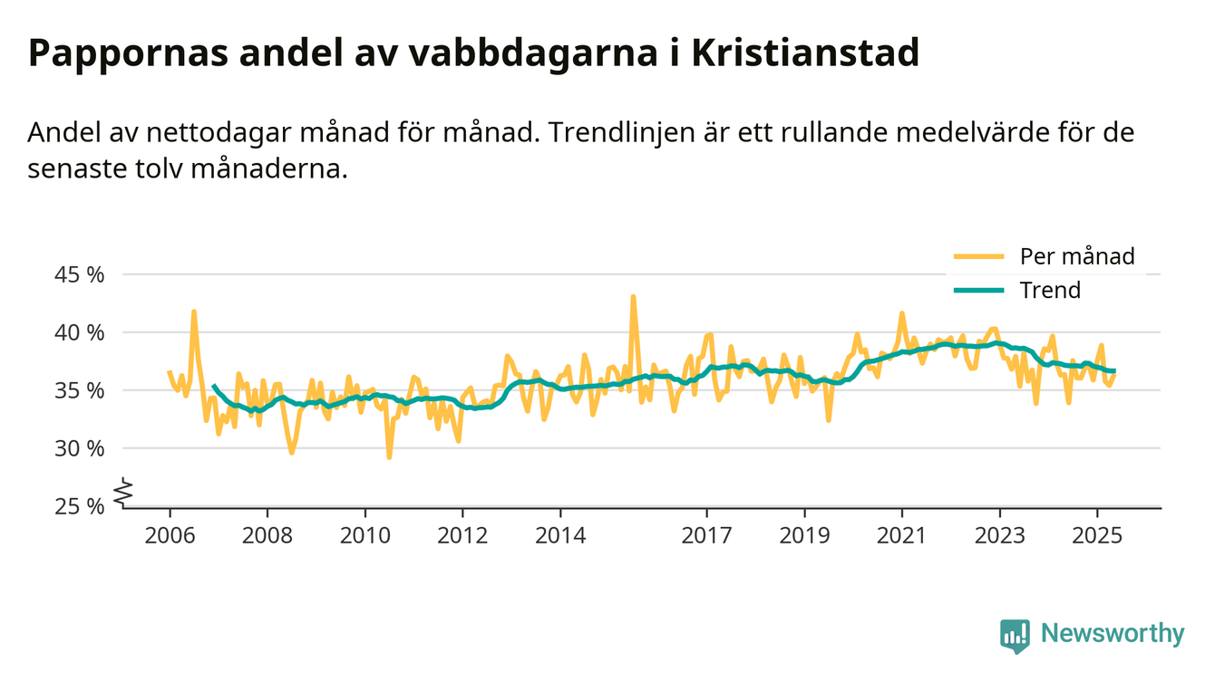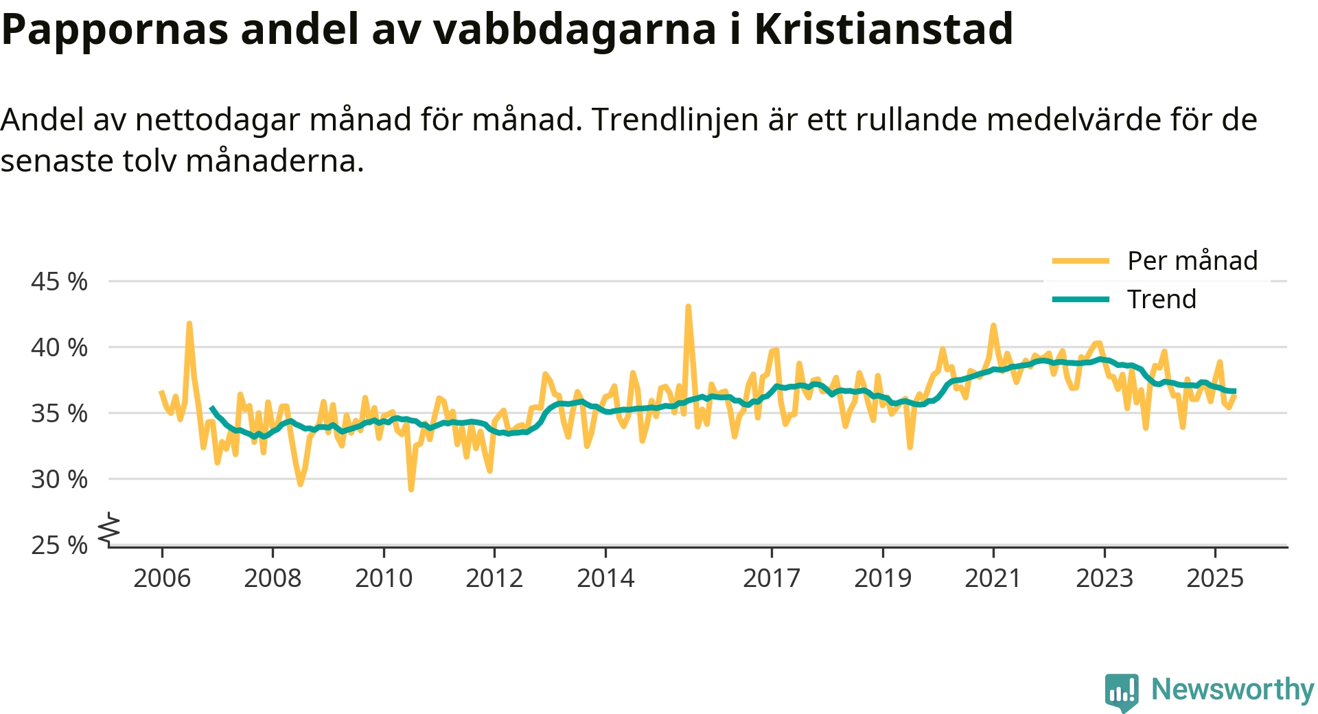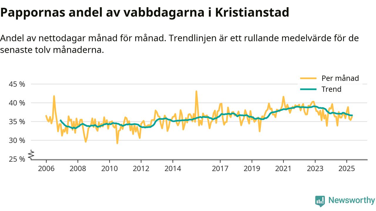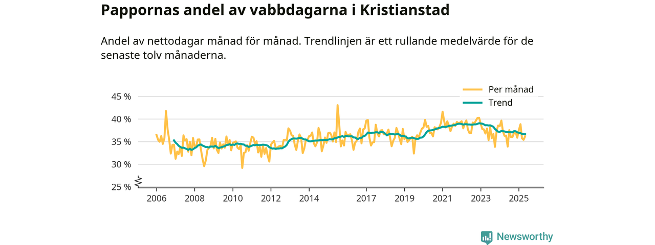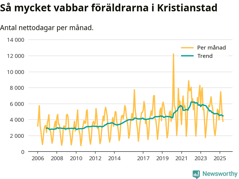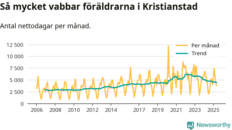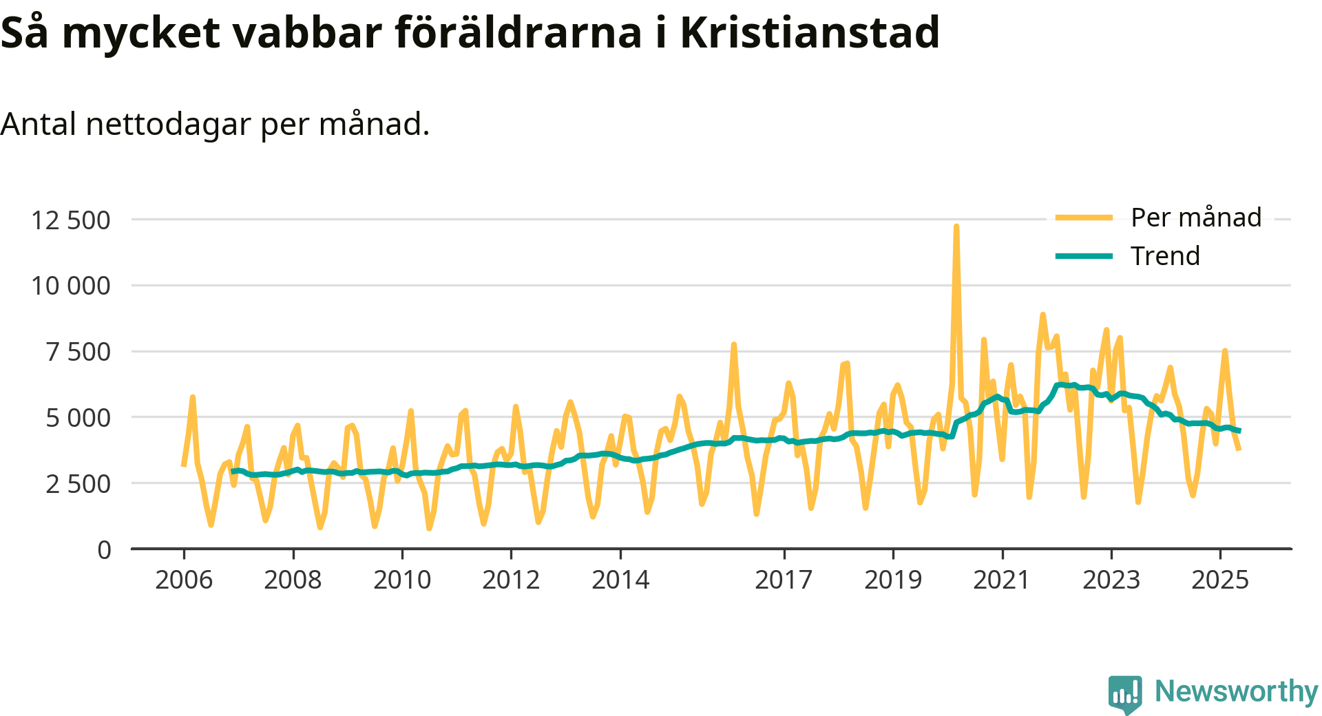 När coronapandemin drog in i mars 2020 peakade antalet vabbdagar både i Kristianstads kommun och i riket som helhet. Under de senaste två åren har vabbuttaget börjat minska igen.