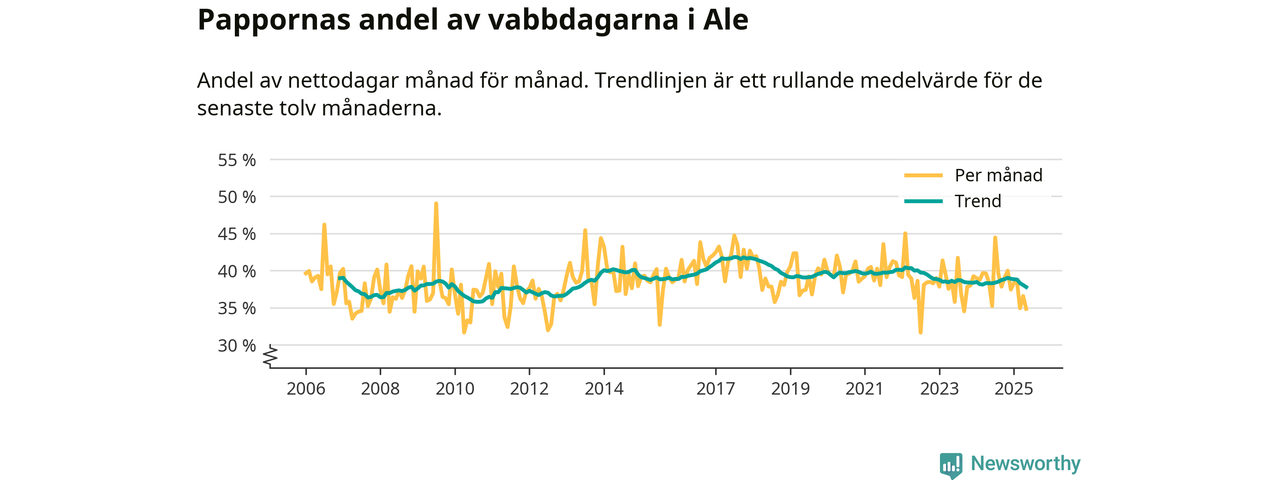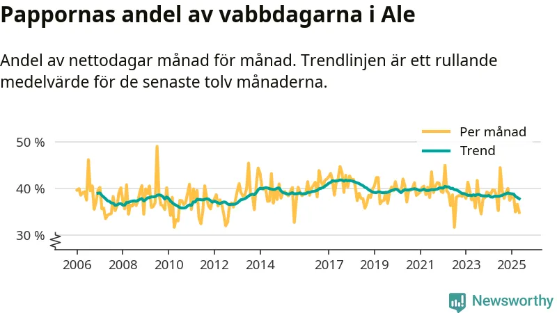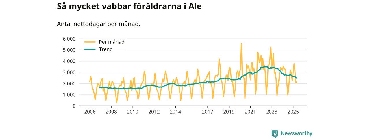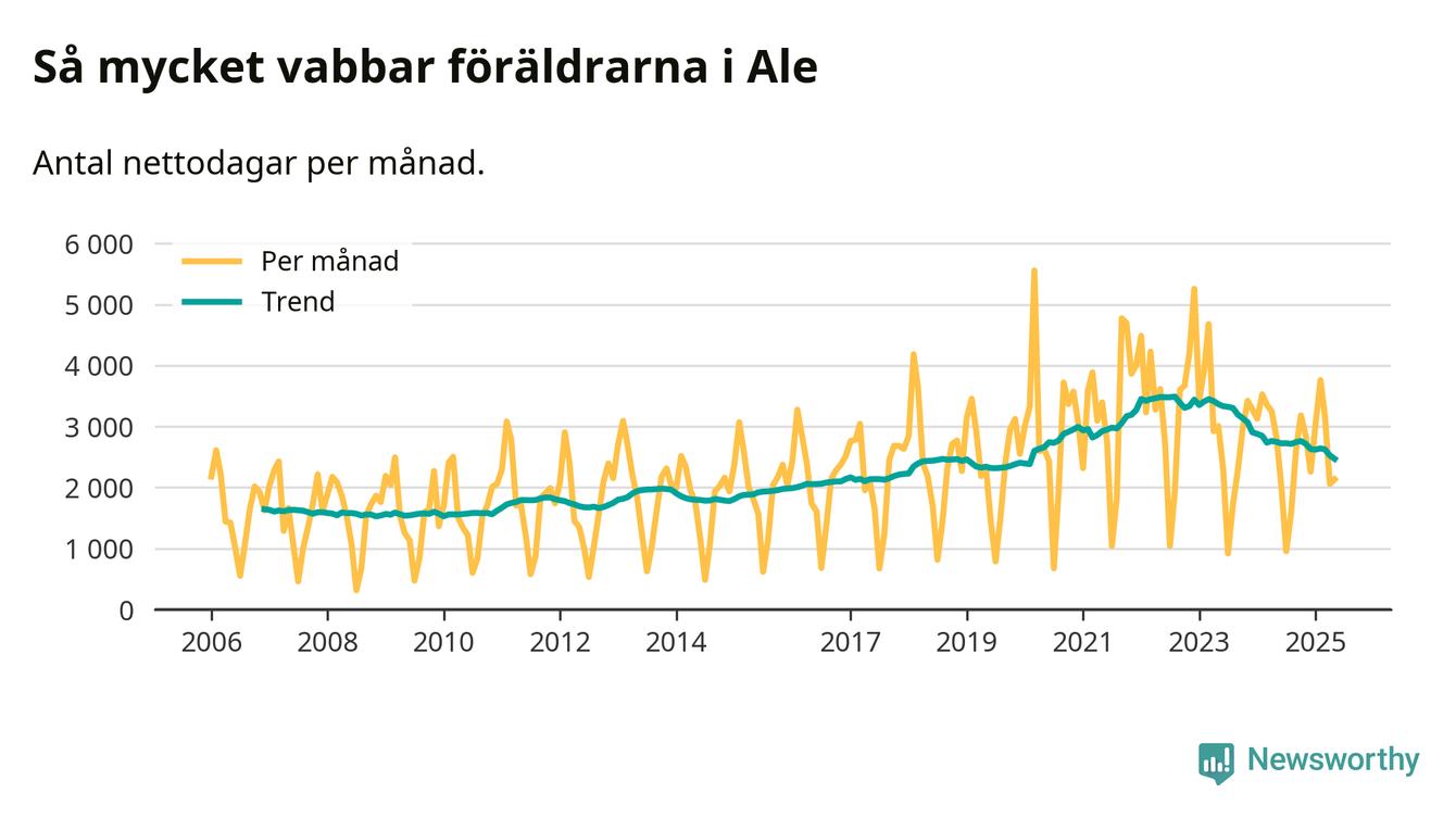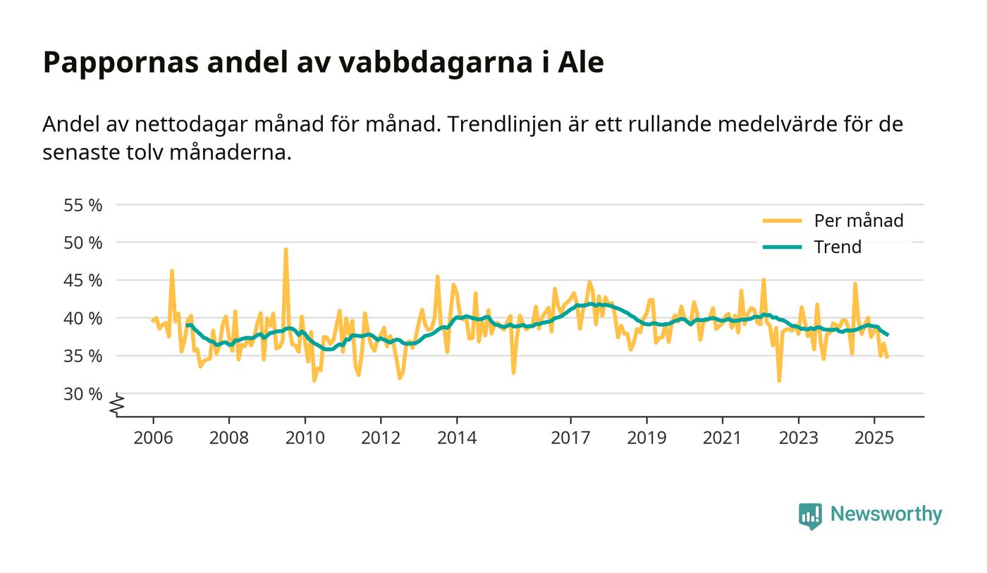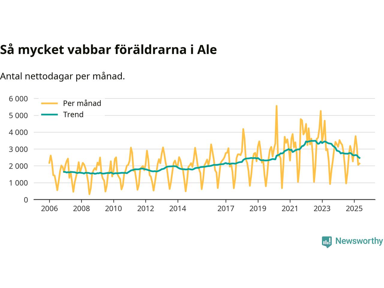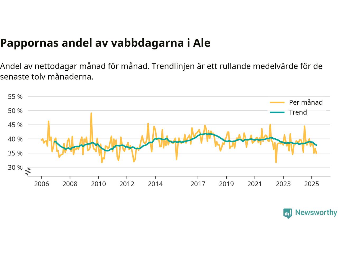 Ale ligger en bit från ett jämställt uttag. Under de senaste tolv månaderna har männen stått för 38 procent av all vabb i kommunen. Det är en lägre andel än på över tolv år.
