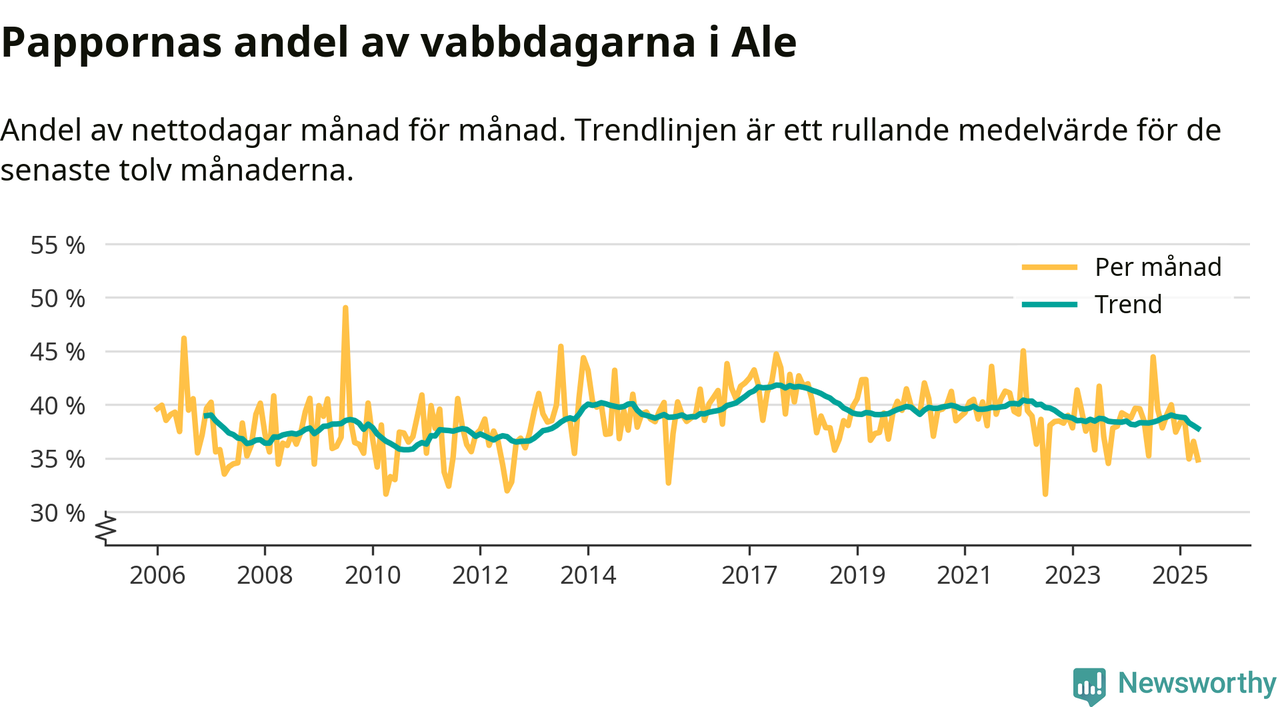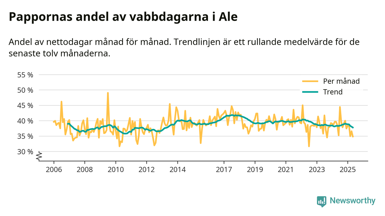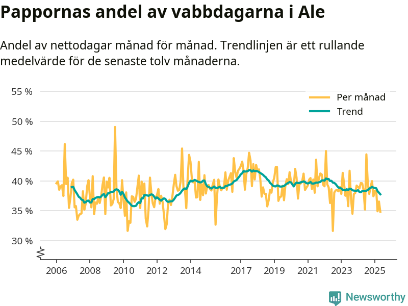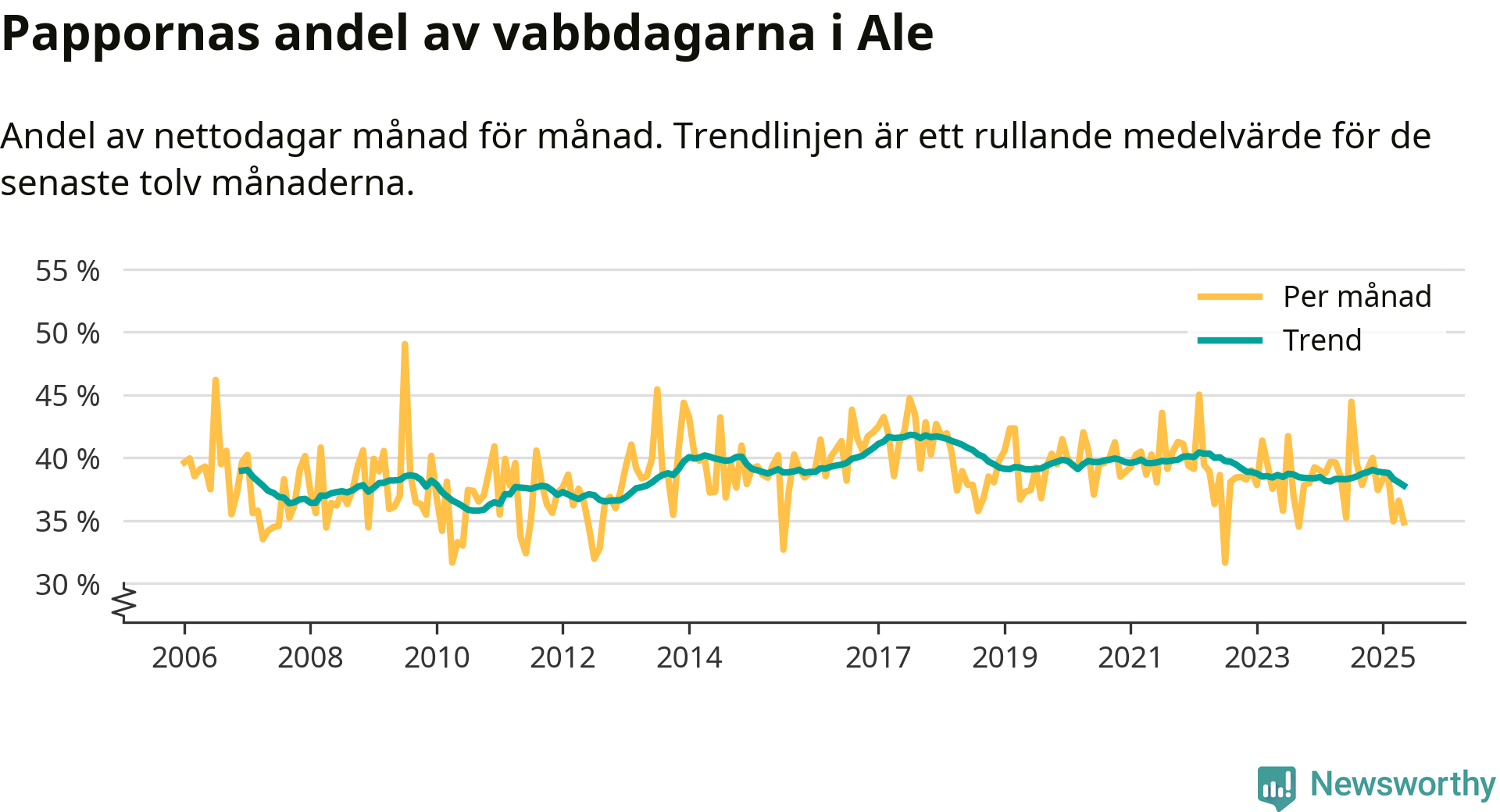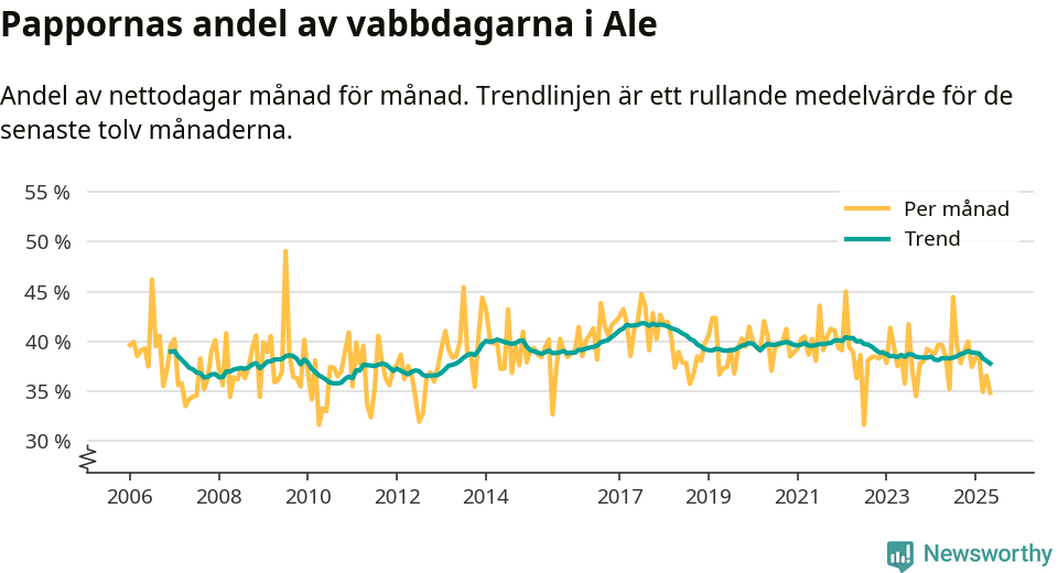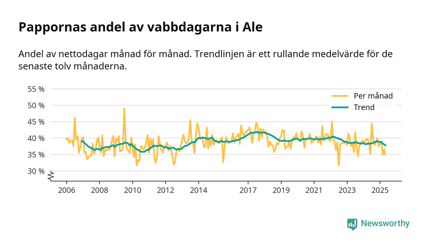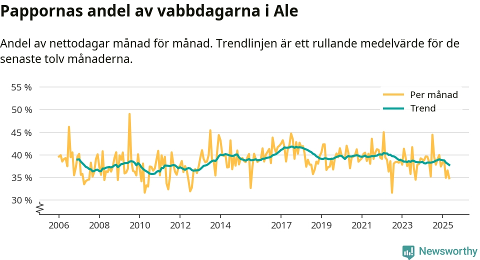 Ale ligger en bit från ett jämställt uttag. Under de senaste tolv månaderna har männen stått för 38 procent av all vabb i kommunen. Det är en lägre andel än på över tolv år.