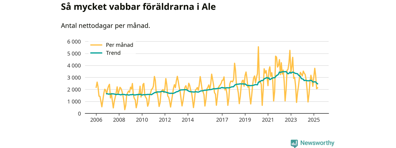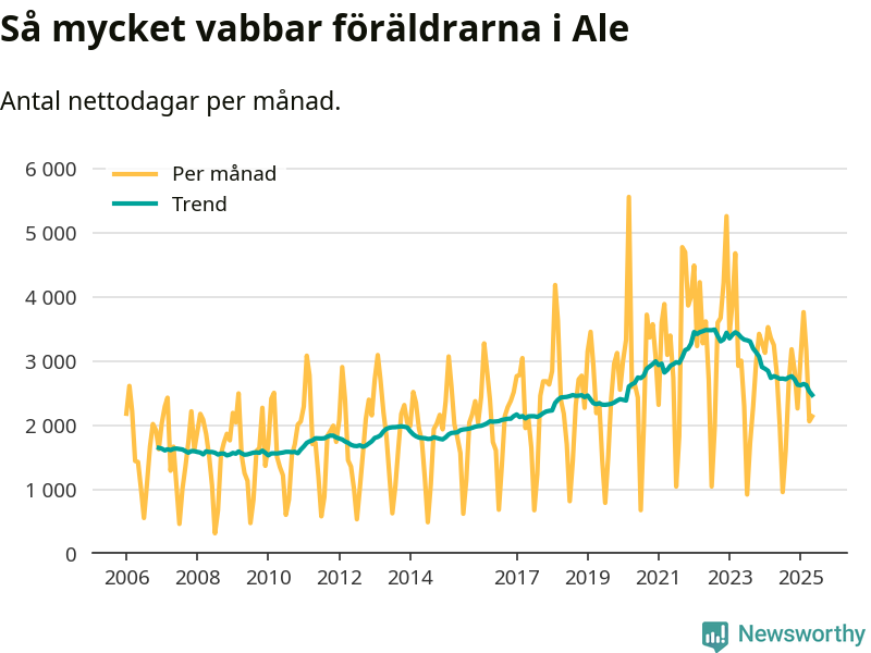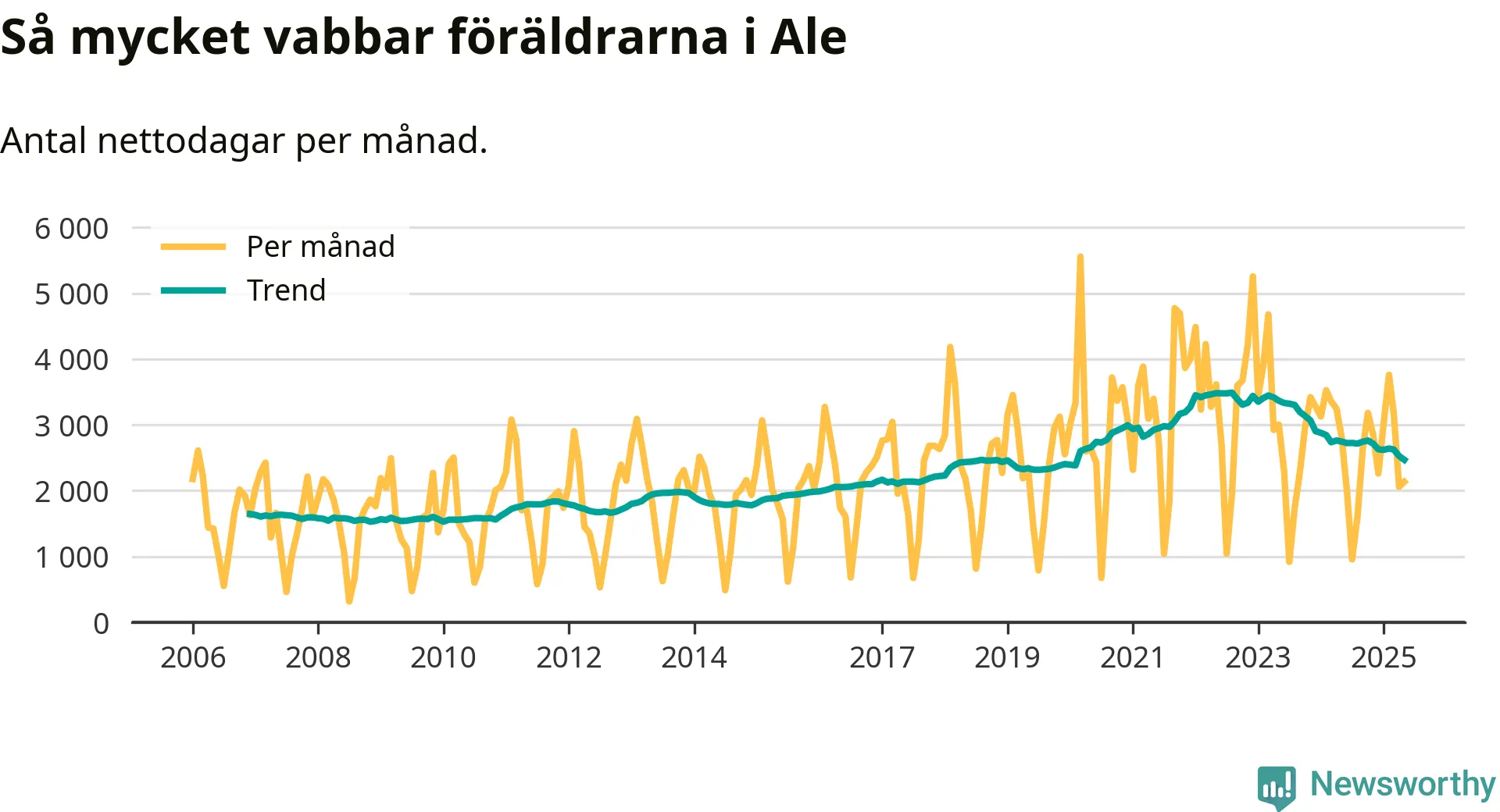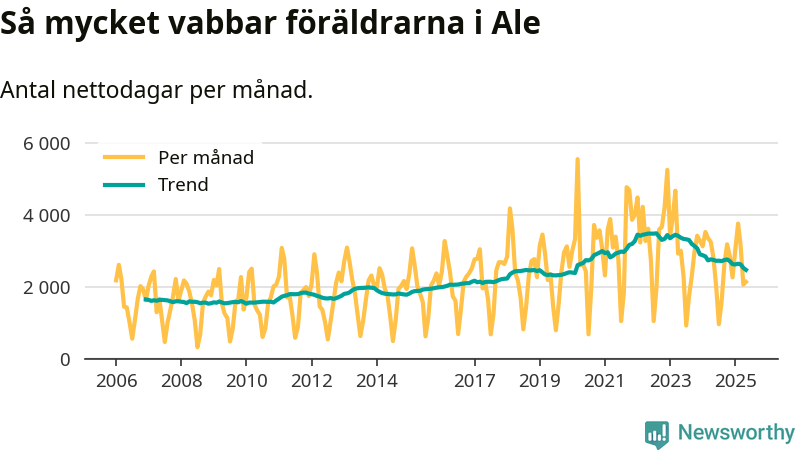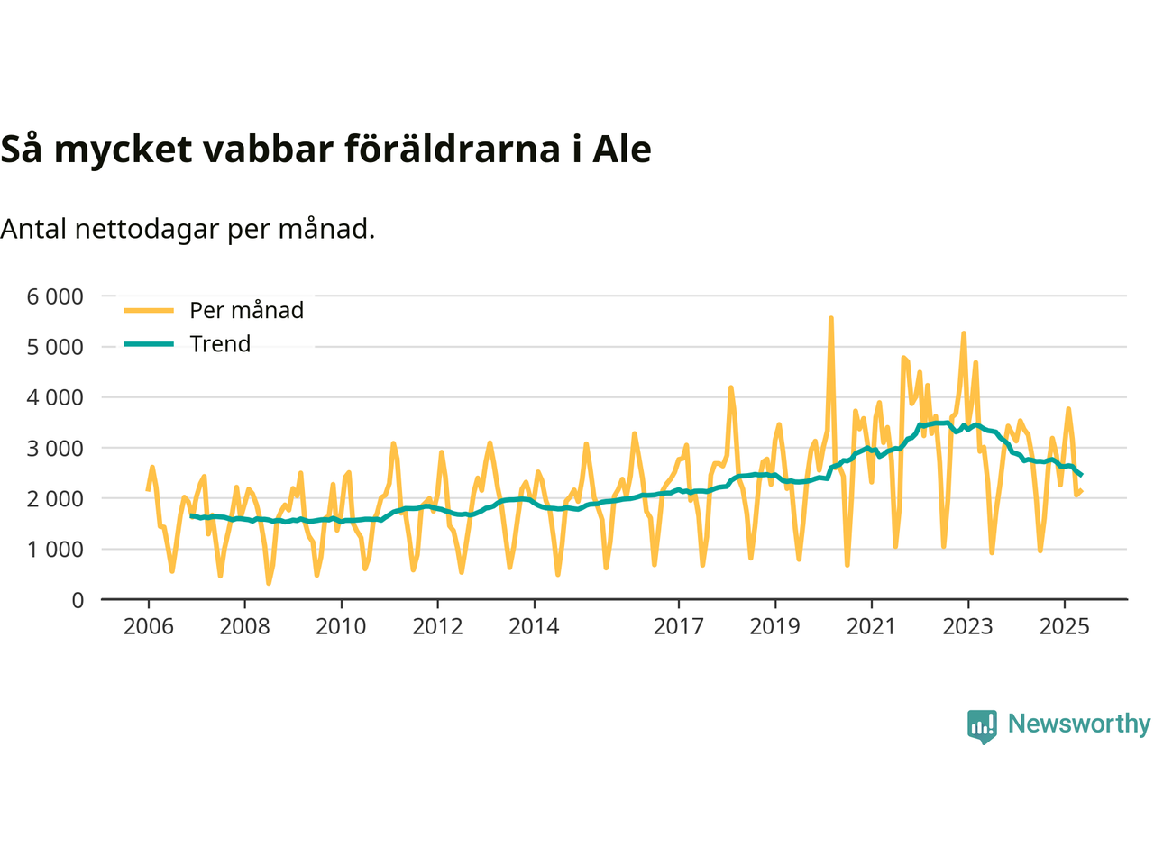När coronapandemin drog in i mars 2020 peakade antalet vabbdagar både i Ale kommun och i riket som helhet. Under de senaste två åren har vabbuttaget börjat minska igen.