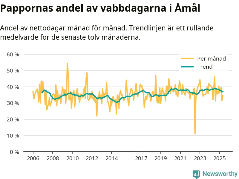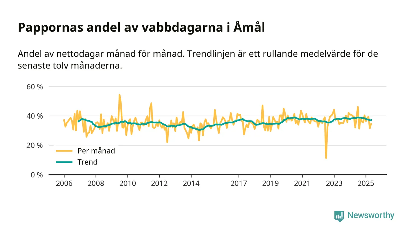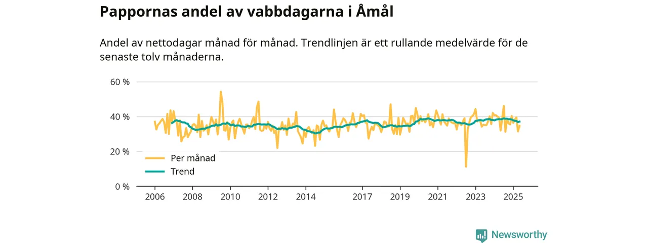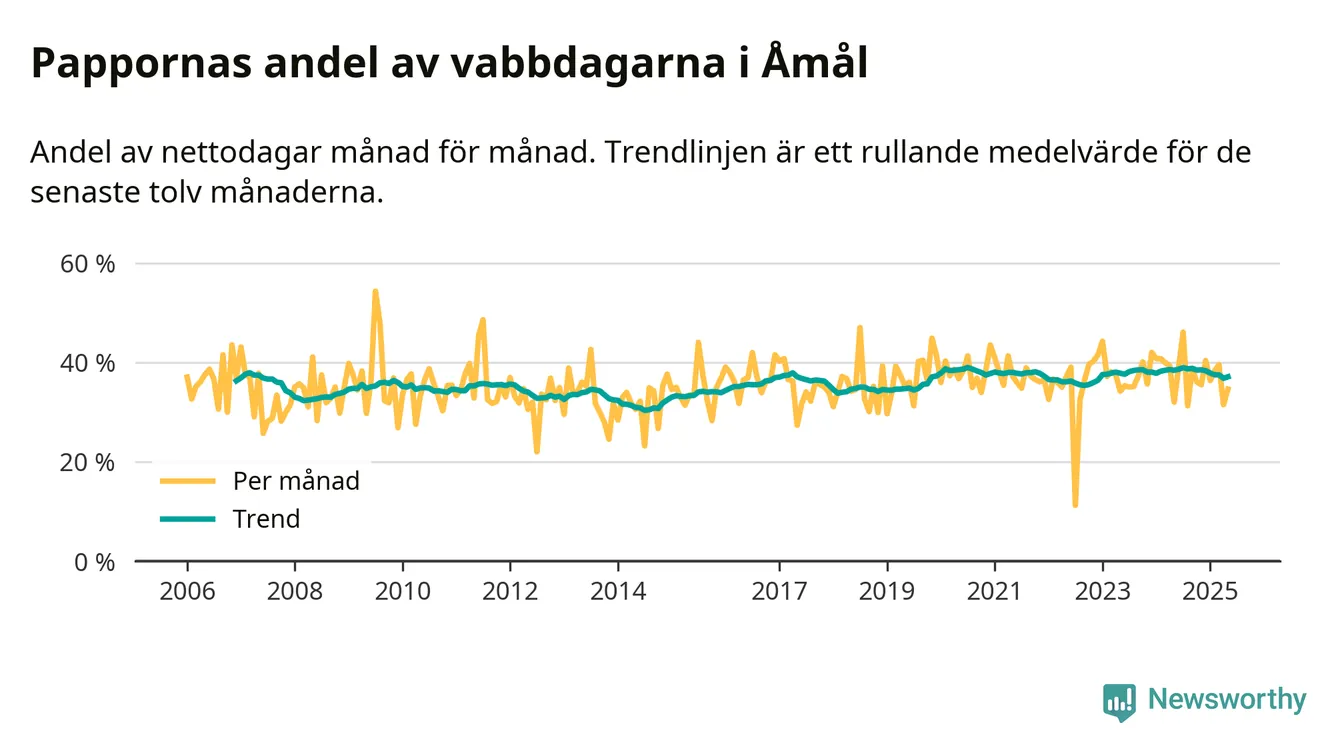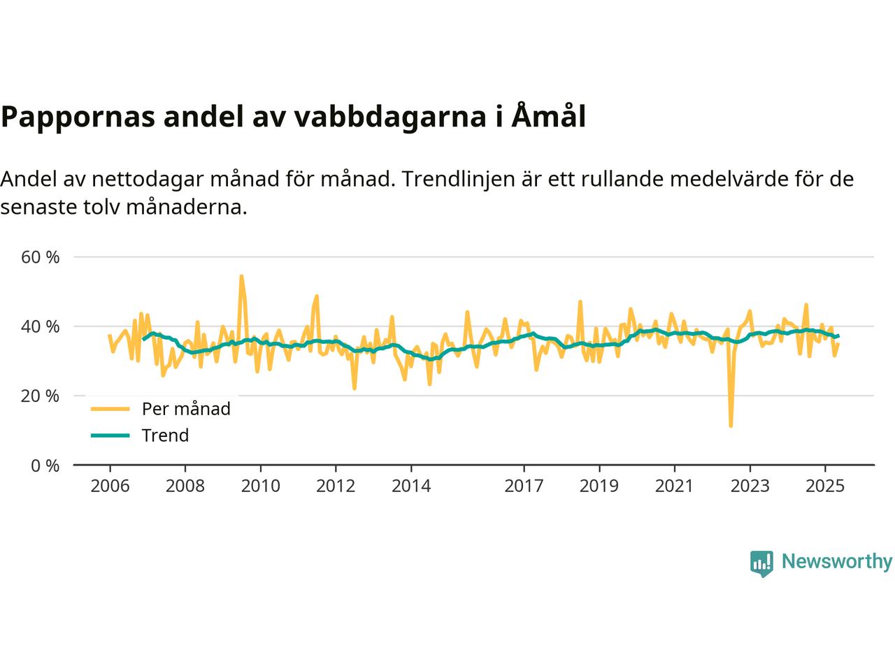 Åmål ligger en bit från ett jämställt uttag. Under de senaste tolv månaderna har männen stått för 37 procent av all vabb i kommunen.