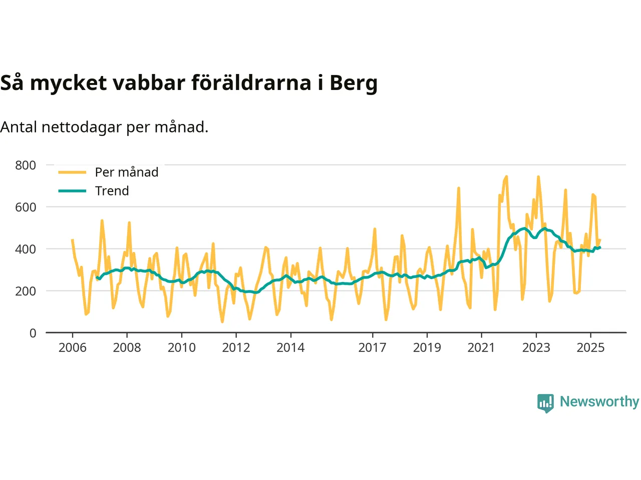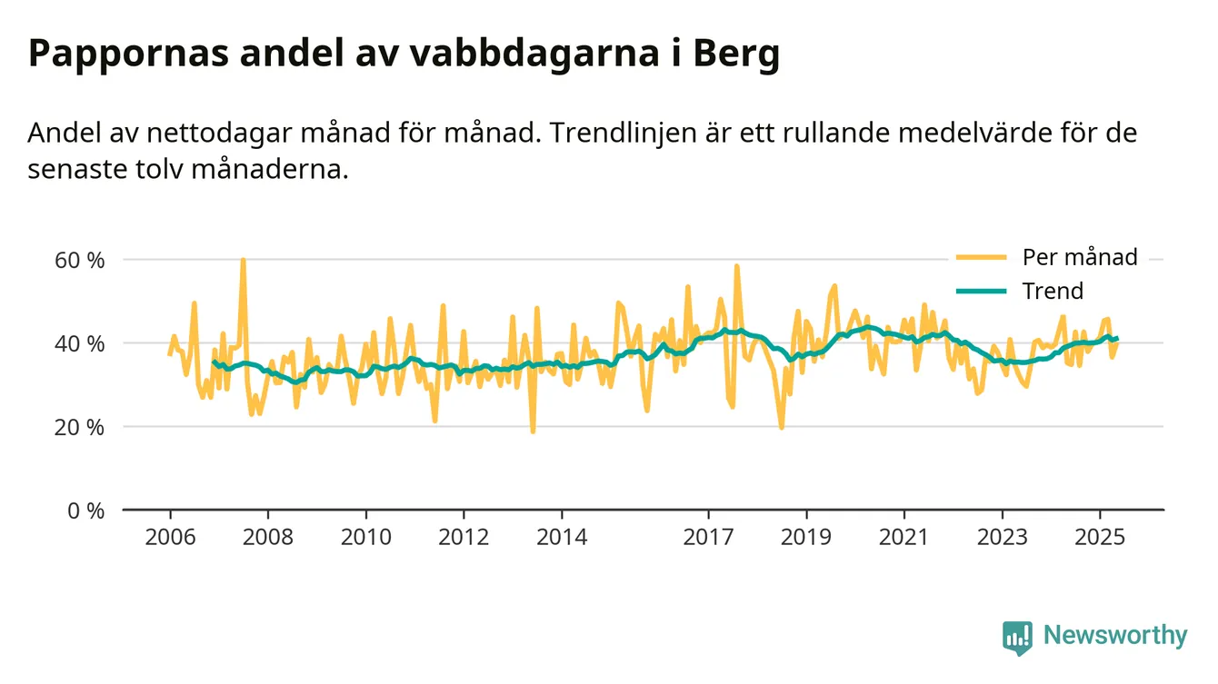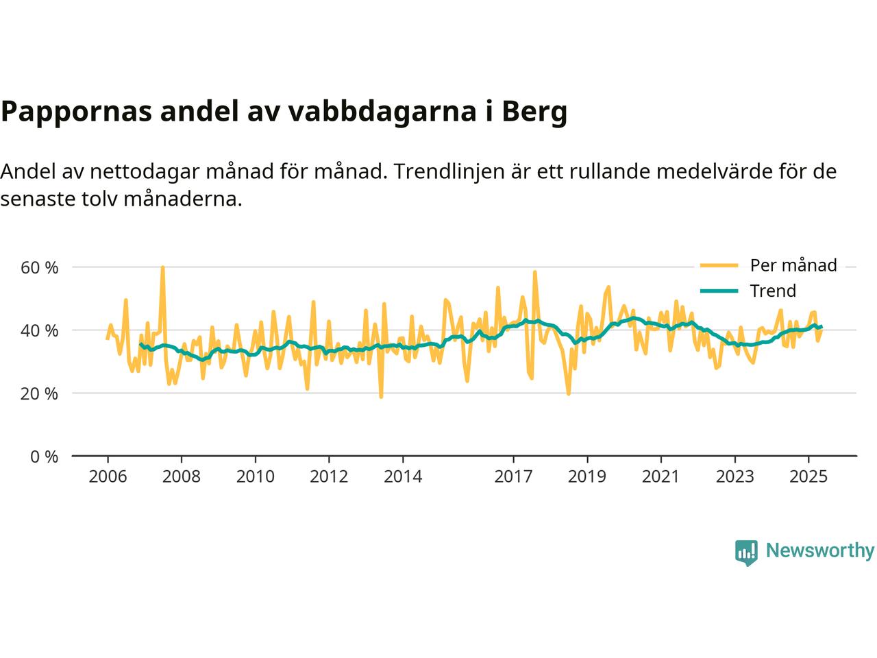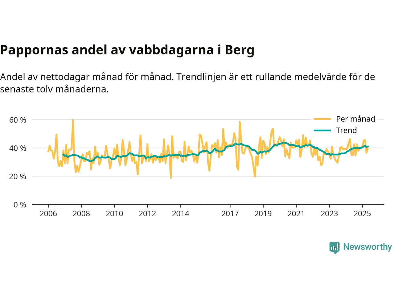 Berg ligger en bit från ett jämställt uttag. Under de senaste tolv månaderna har männen stått för 41 procent av all vabb i kommunen. Pappornas uttag peakade våren 2020 då kommunens fäder var uppe i 44 procent av vabbdagarna 1.