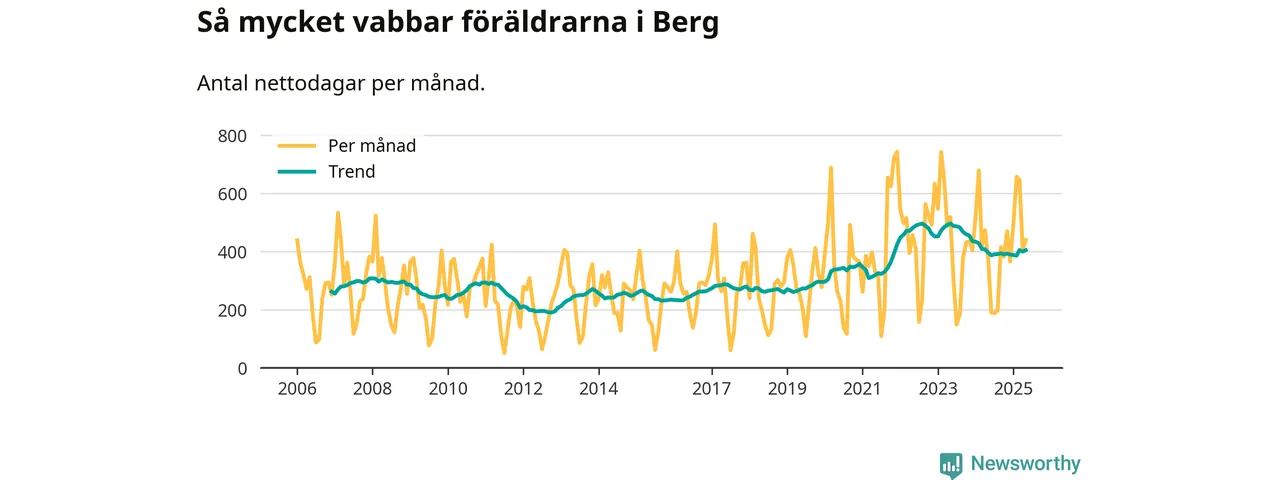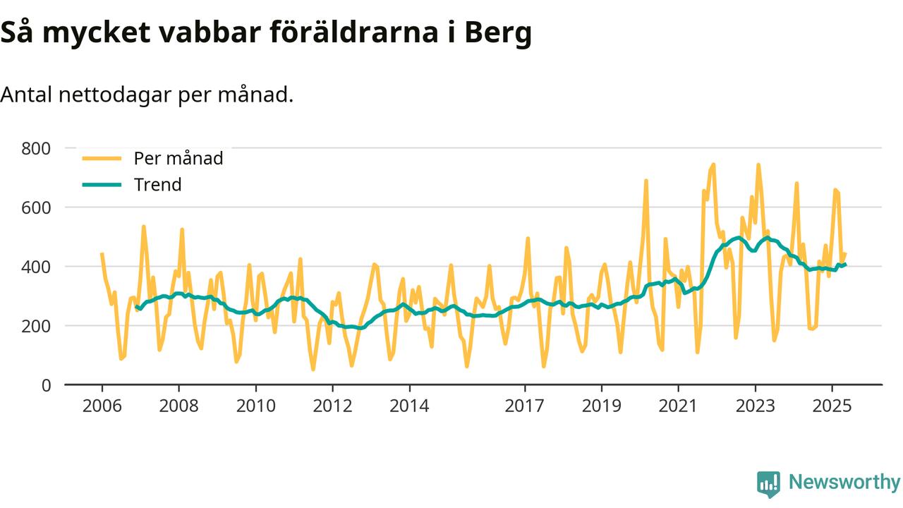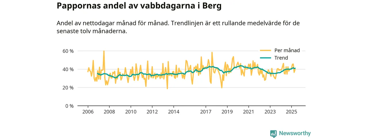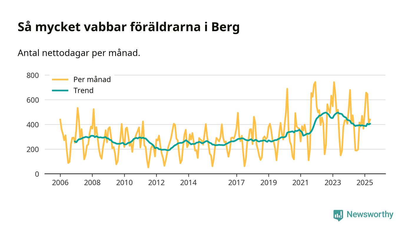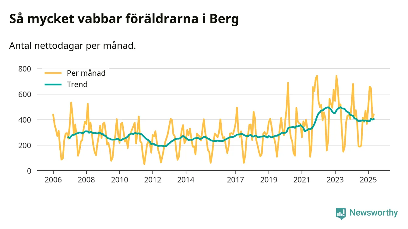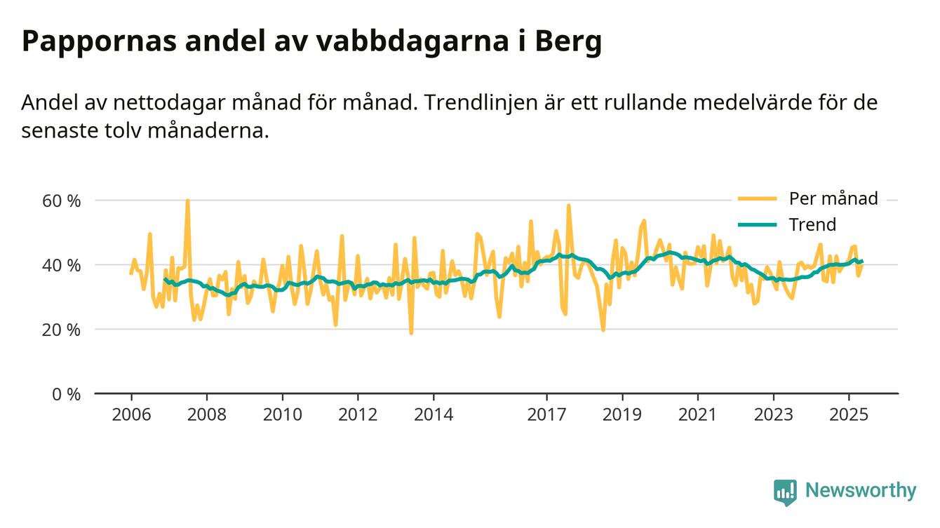 Berg ligger en bit från ett jämställt uttag. Under de senaste tolv månaderna har männen stått för 41 procent av all vabb i kommunen. Pappornas uttag peakade våren 2020 då kommunens fäder var uppe i 44 procent av vabbdagarna 1.