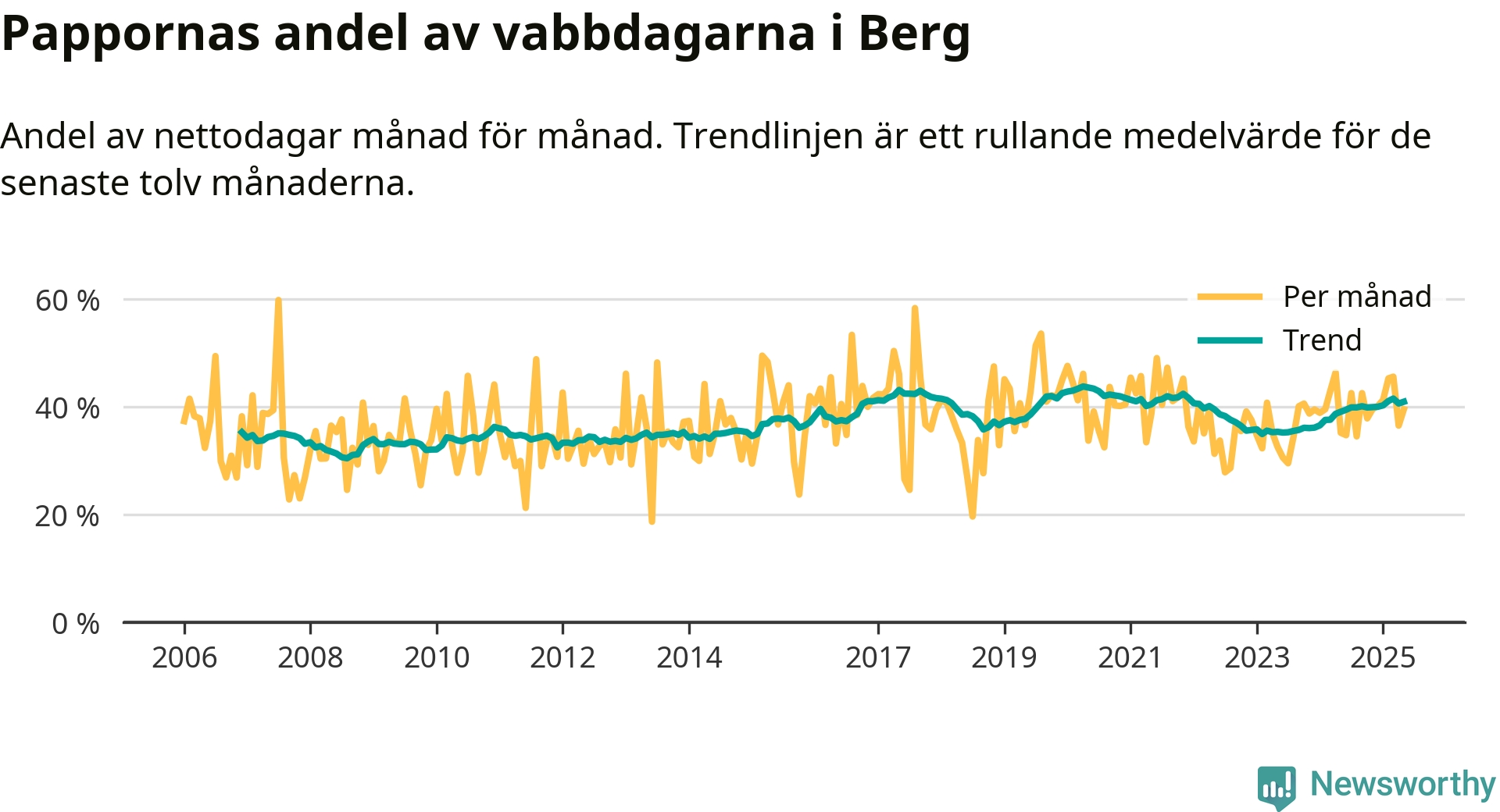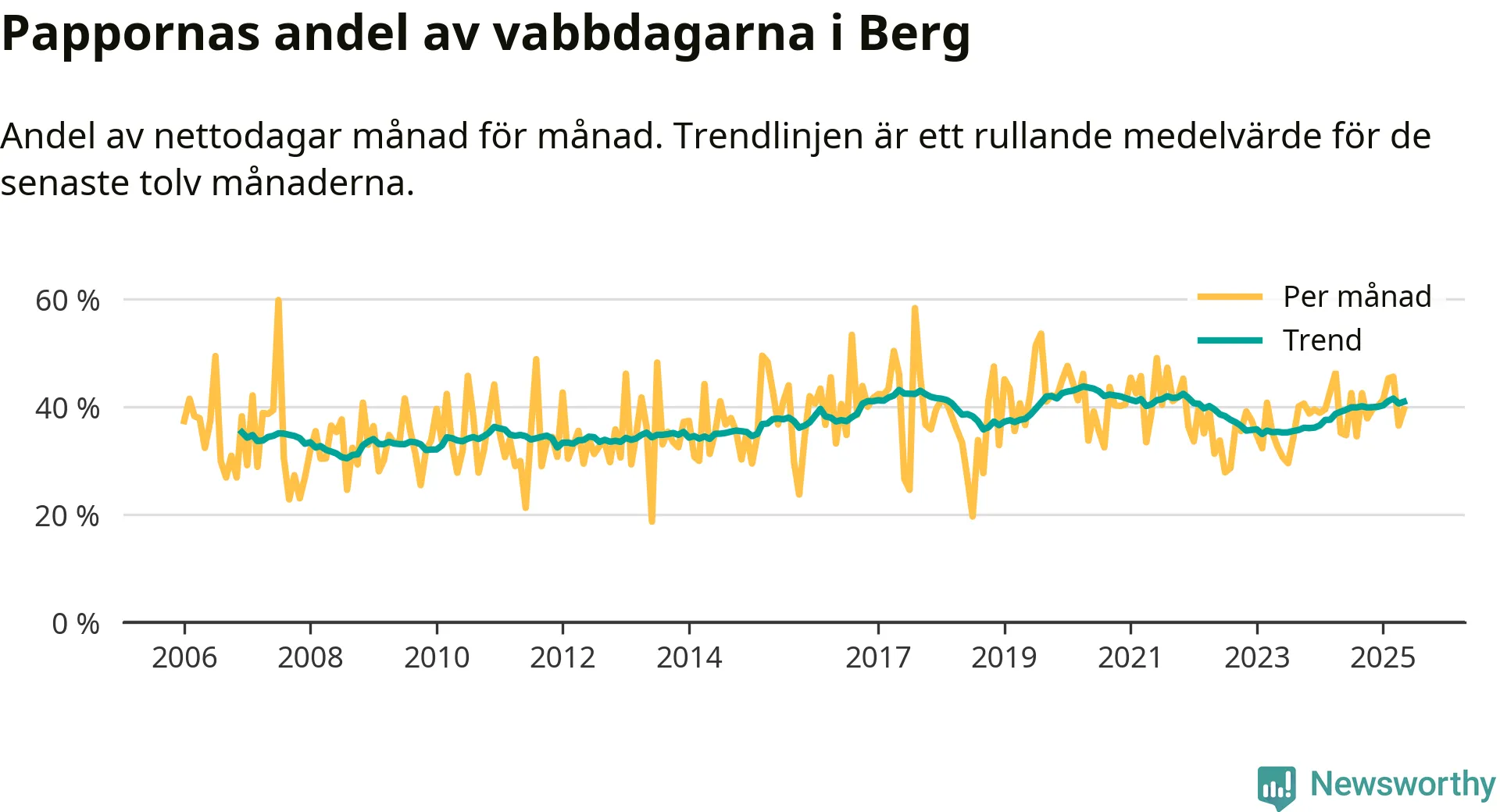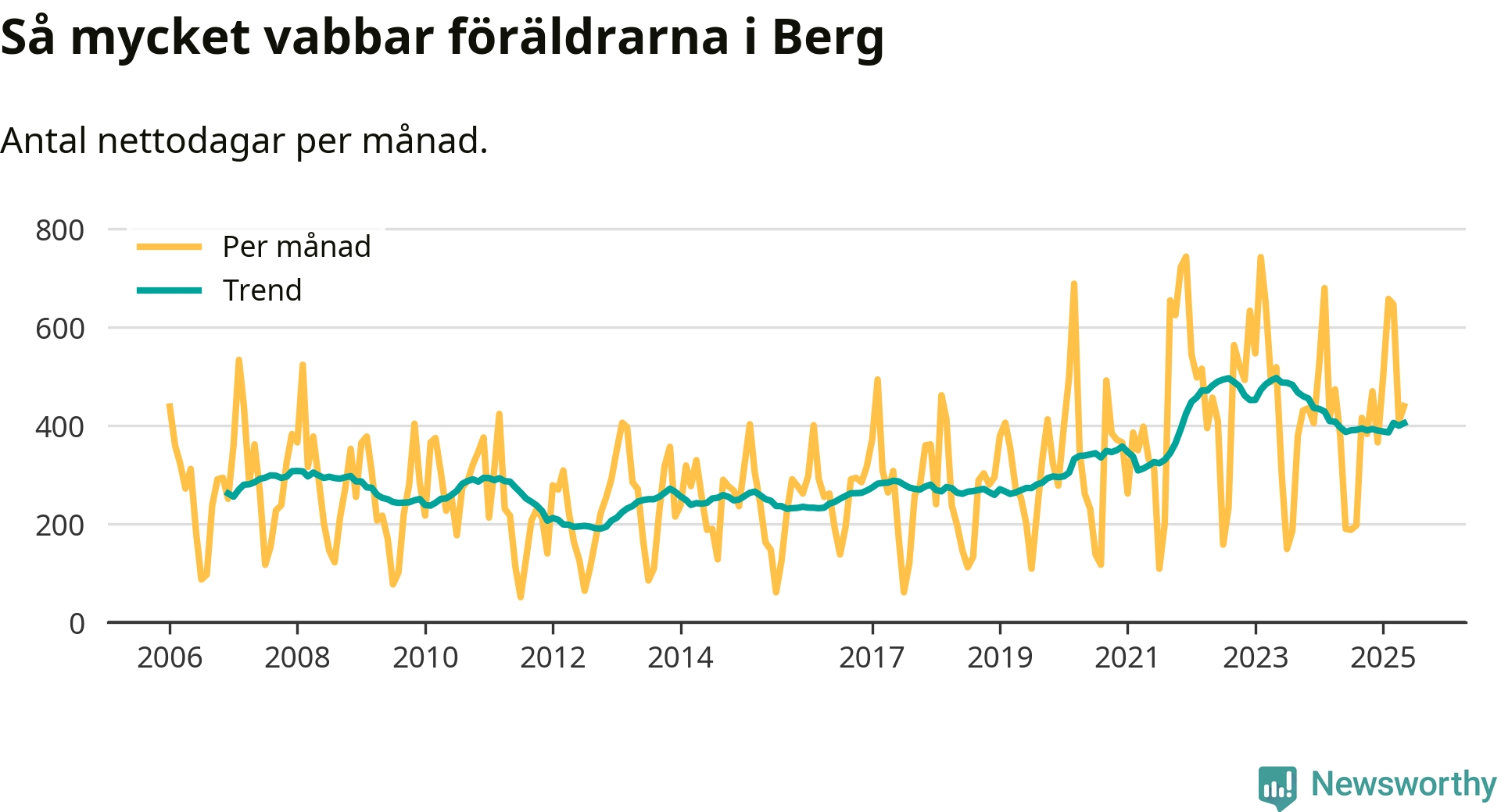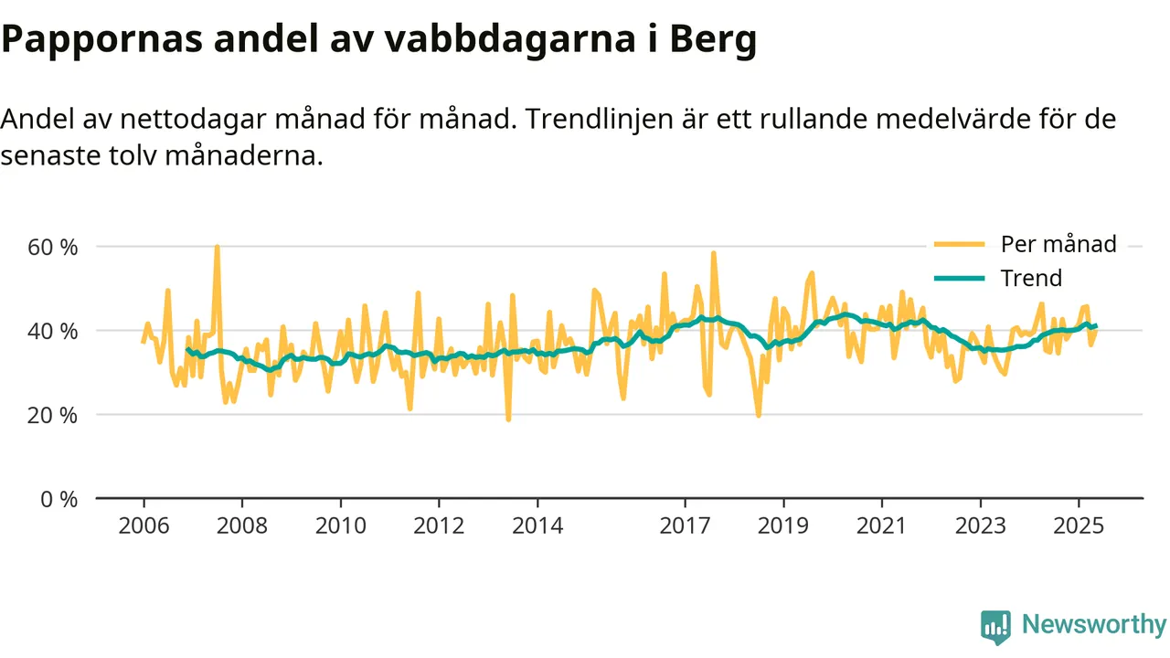 Berg ligger en bit från ett jämställt uttag. Under de senaste tolv månaderna har männen stått för 41 procent av all vabb i kommunen. Pappornas uttag peakade våren 2020 då kommunens fäder var uppe i 44 procent av vabbdagarna 1.