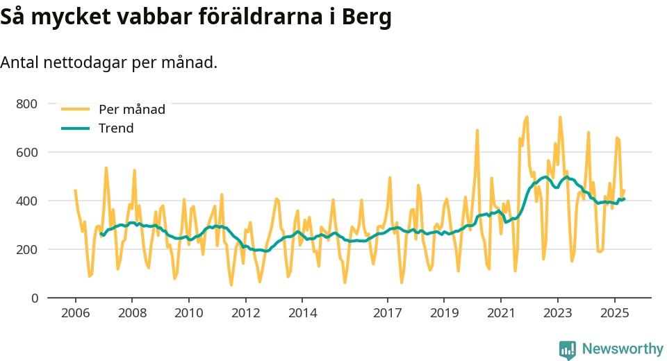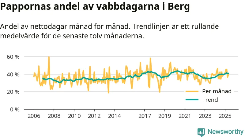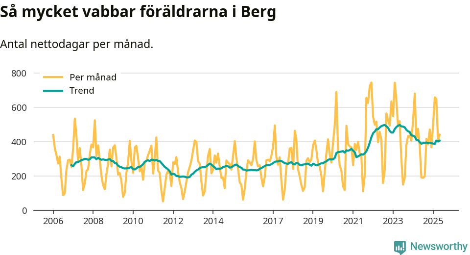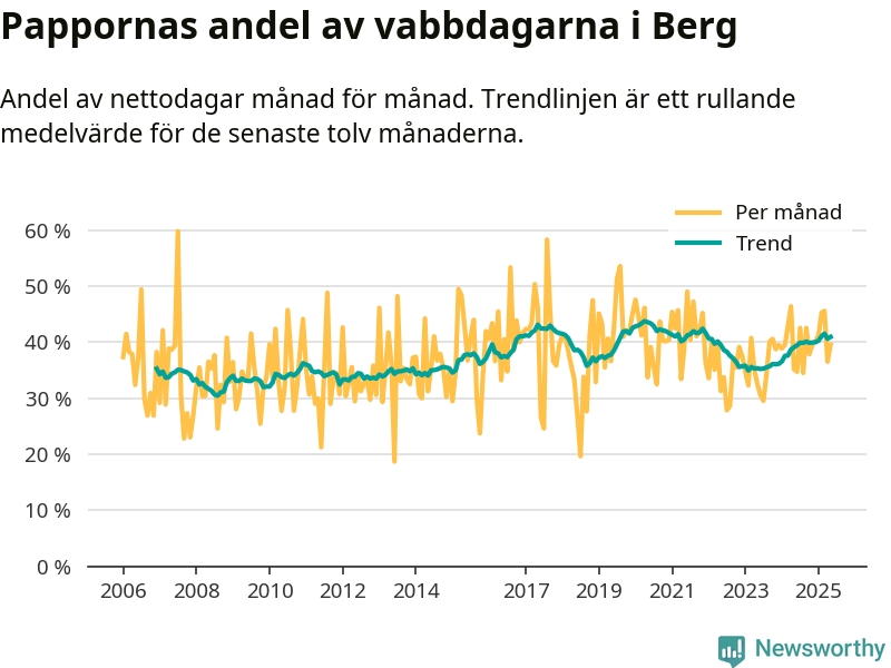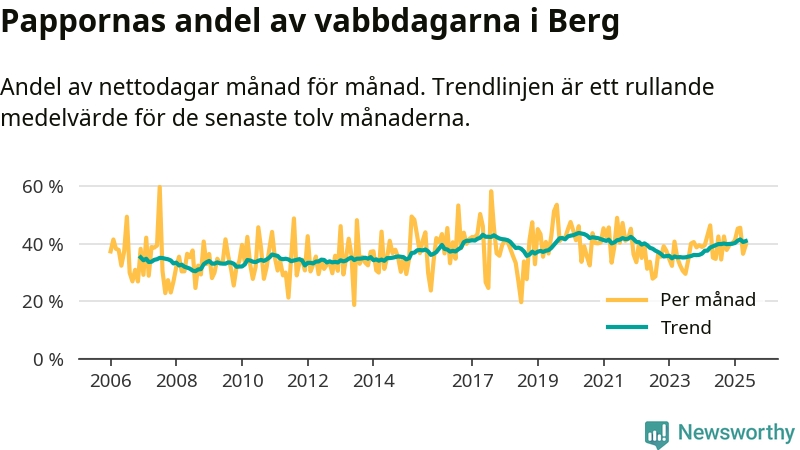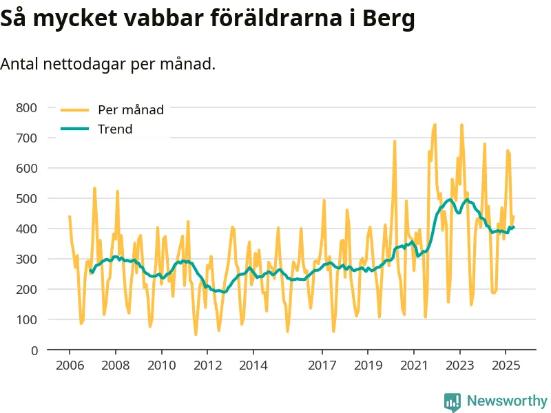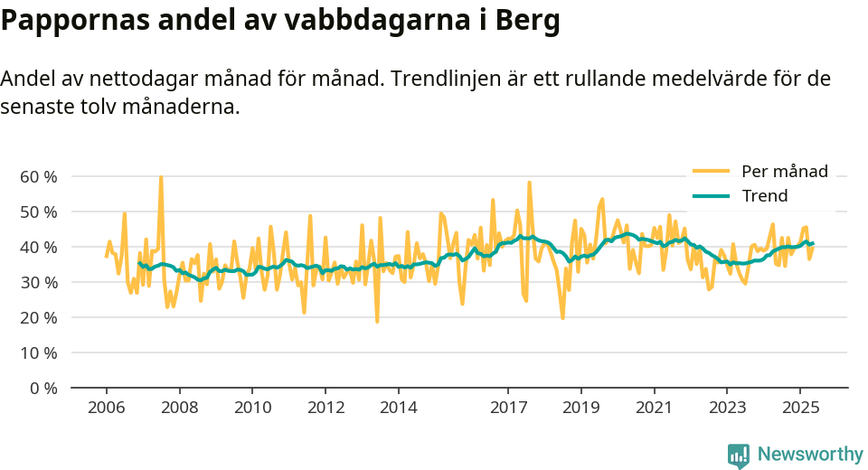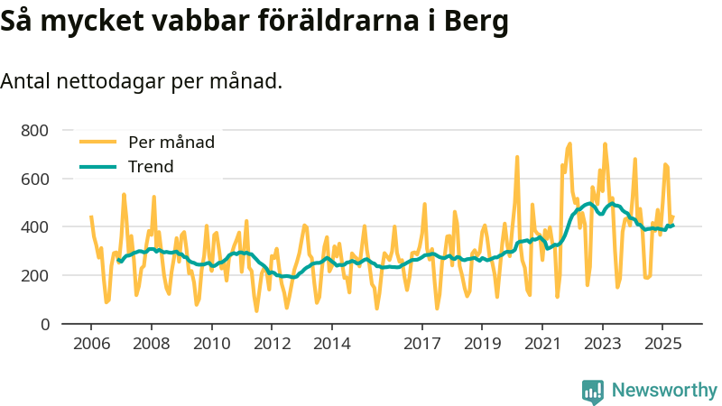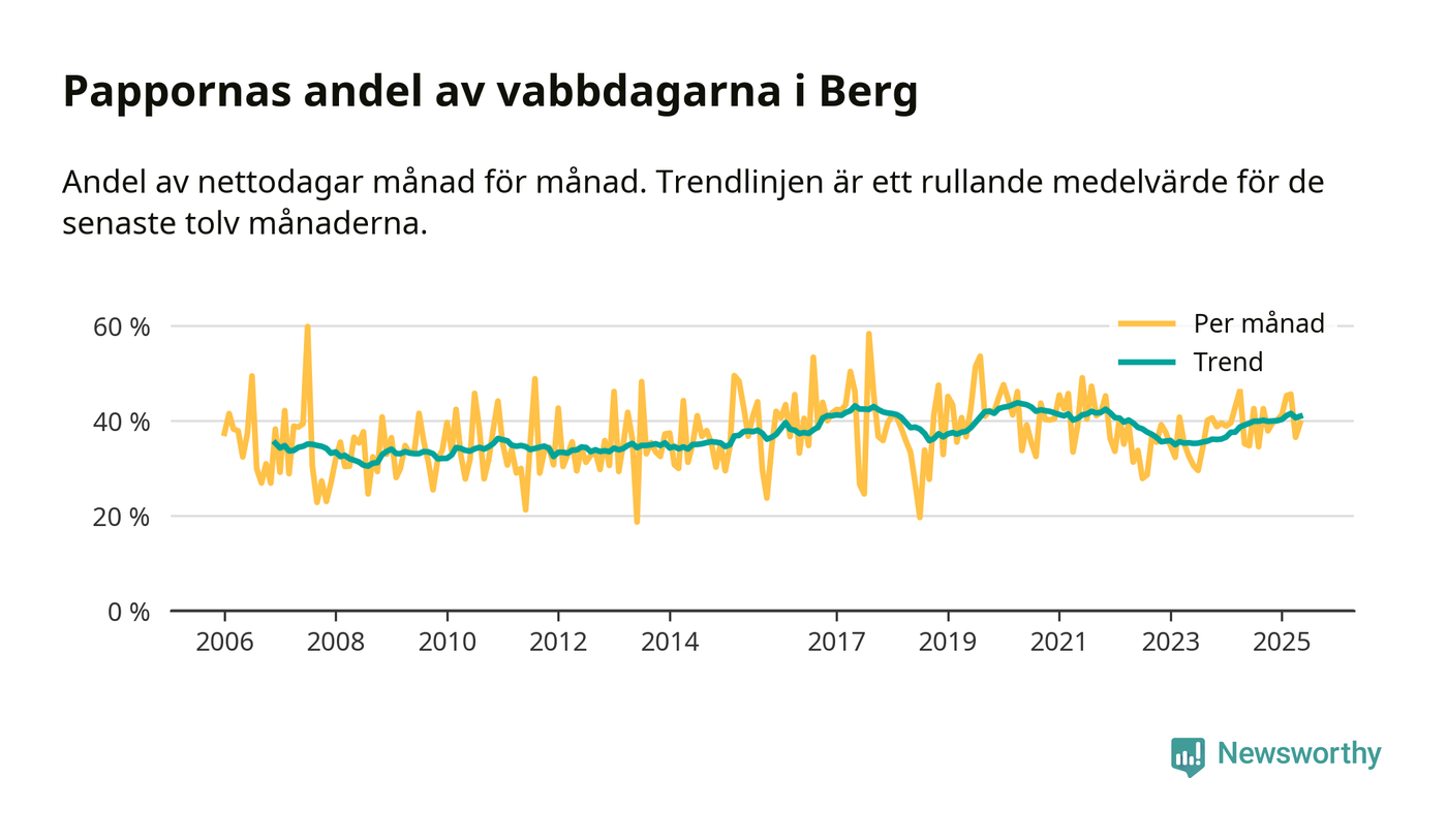 Berg ligger en bit från ett jämställt uttag. Under de senaste tolv månaderna har männen stått för 41 procent av all vabb i kommunen. Pappornas uttag peakade våren 2020 då kommunens fäder var uppe i 44 procent av vabbdagarna 1.