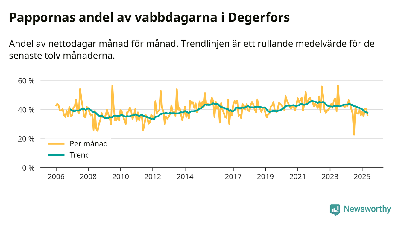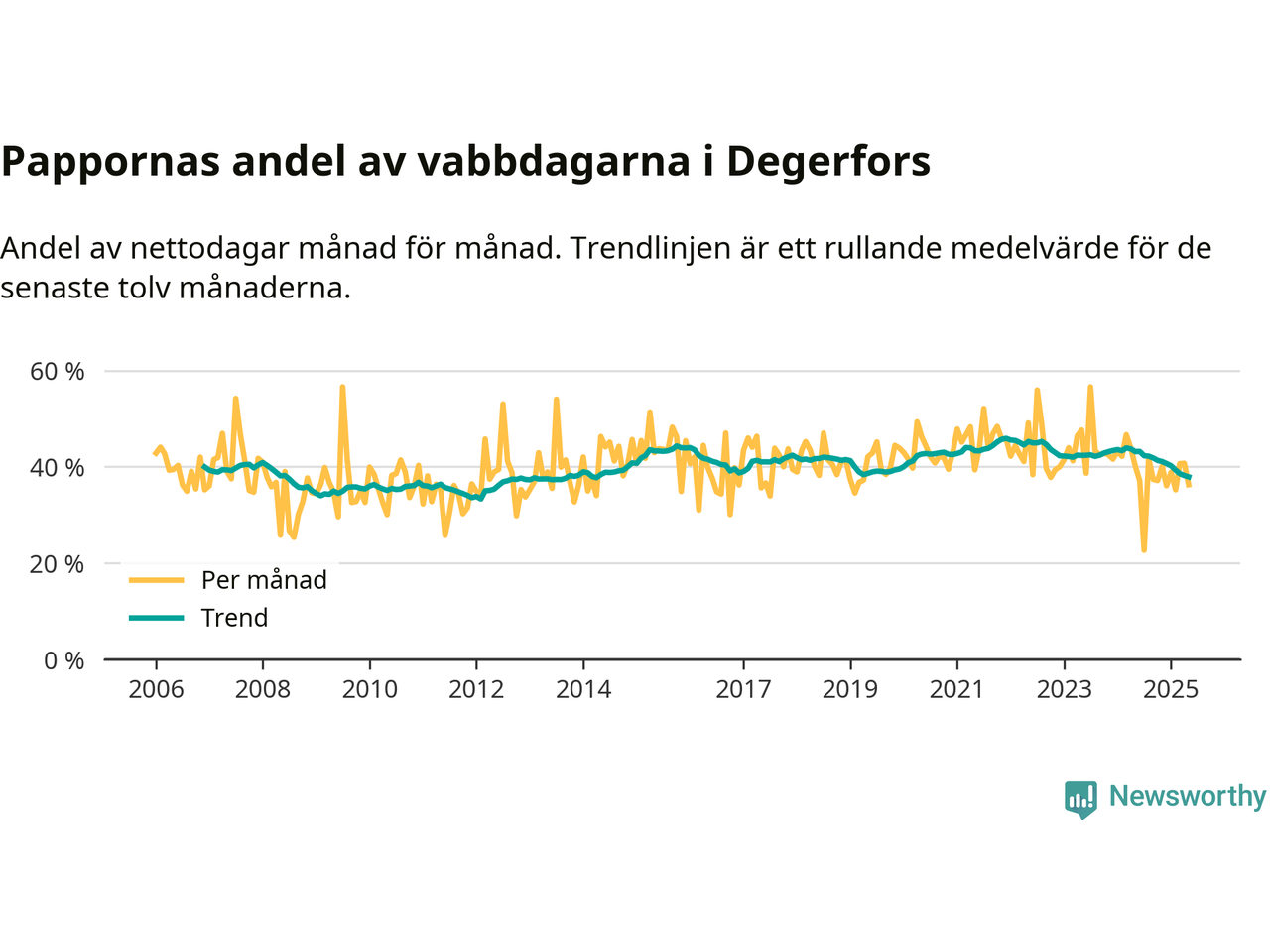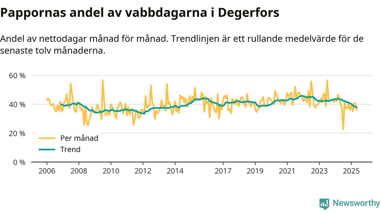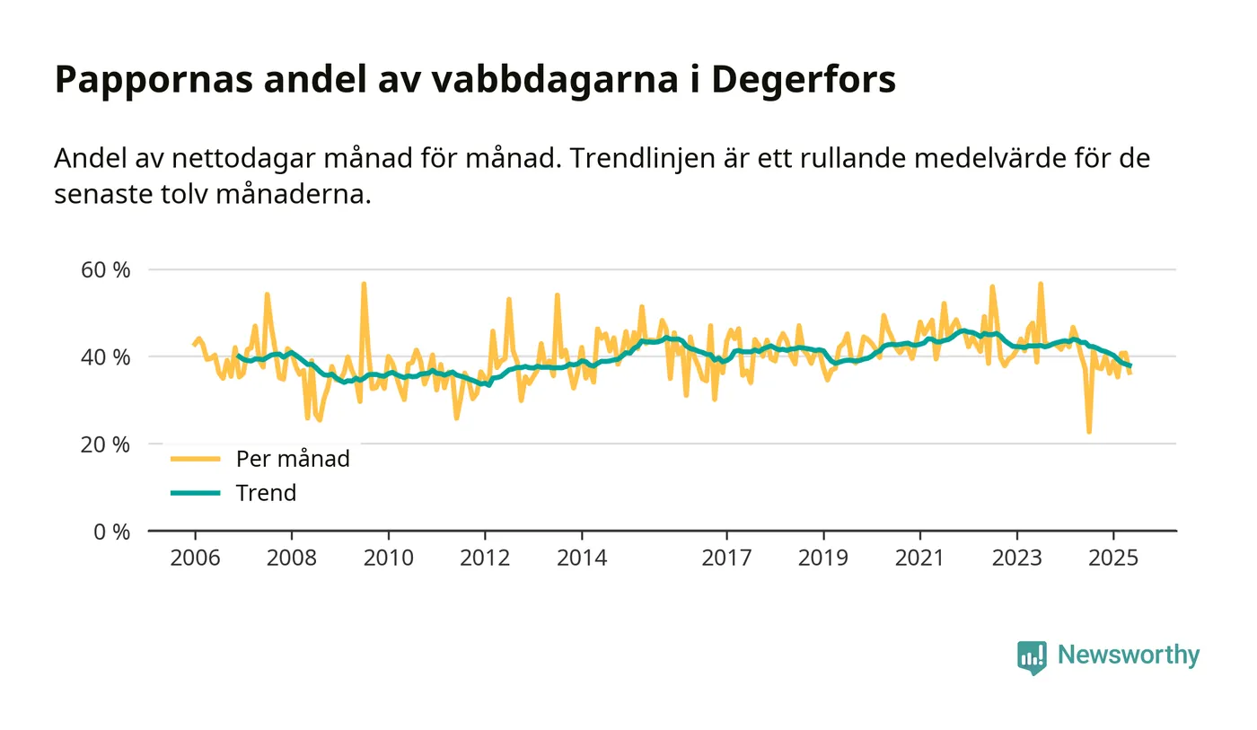 Degerfors ligger en bit från ett jämställt uttag. Under de senaste tolv månaderna har männen stått för 38 procent av all vabb i kommunen. Det är en lägre andel än på över elva år.