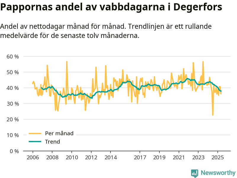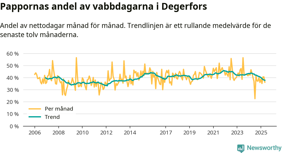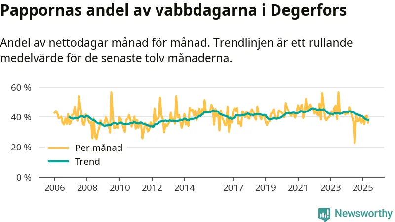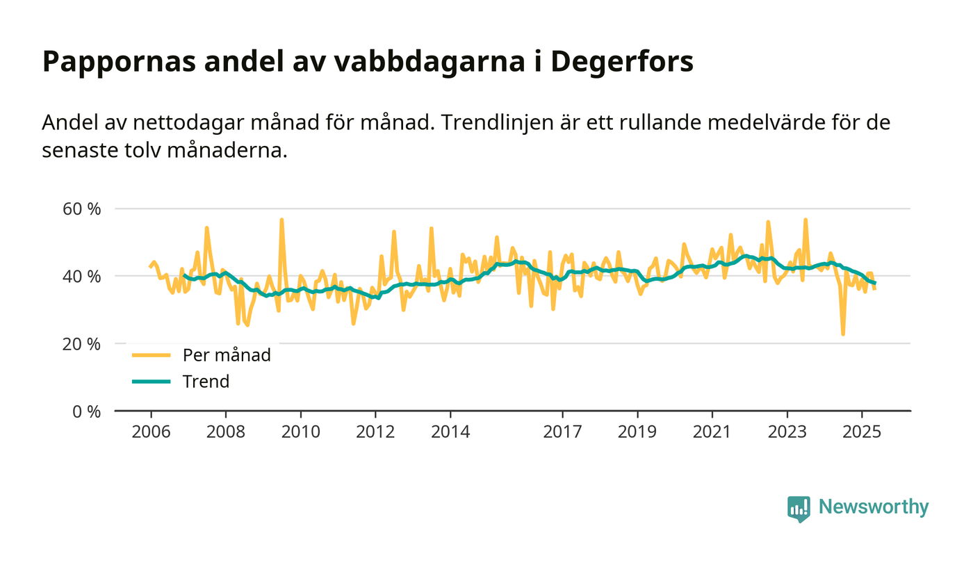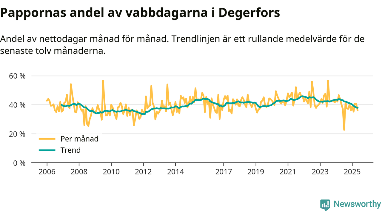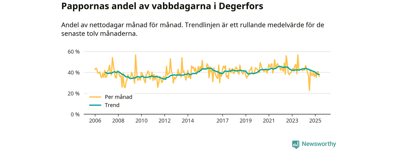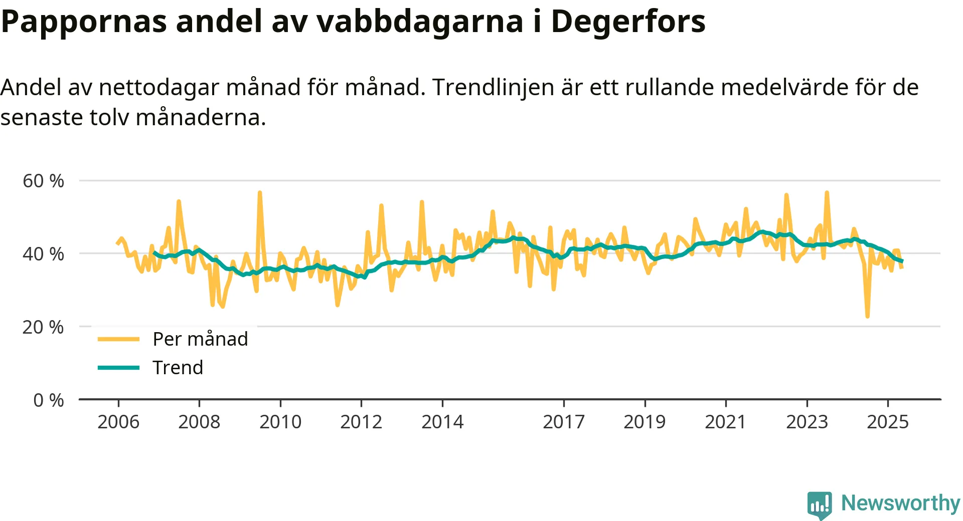 Degerfors ligger en bit från ett jämställt uttag. Under de senaste tolv månaderna har männen stått för 38 procent av all vabb i kommunen. Det är en lägre andel än på över elva år.
