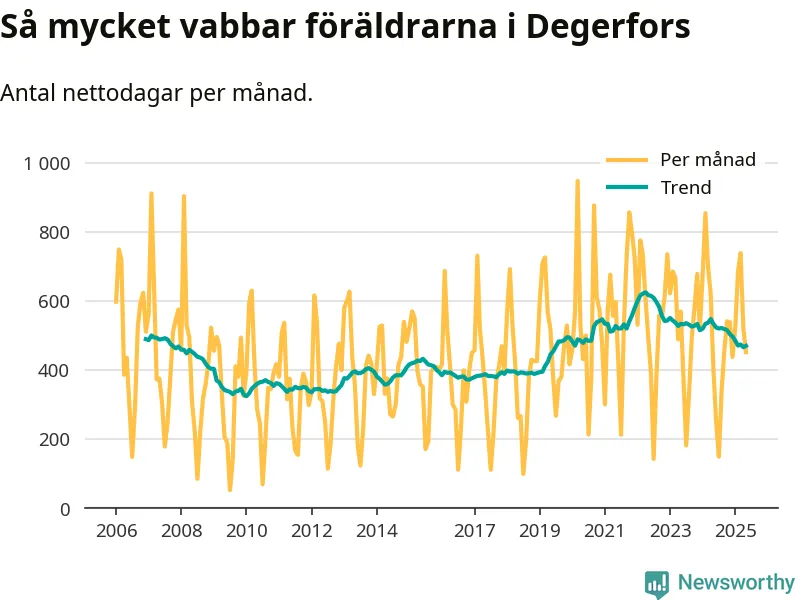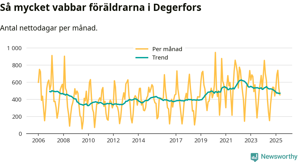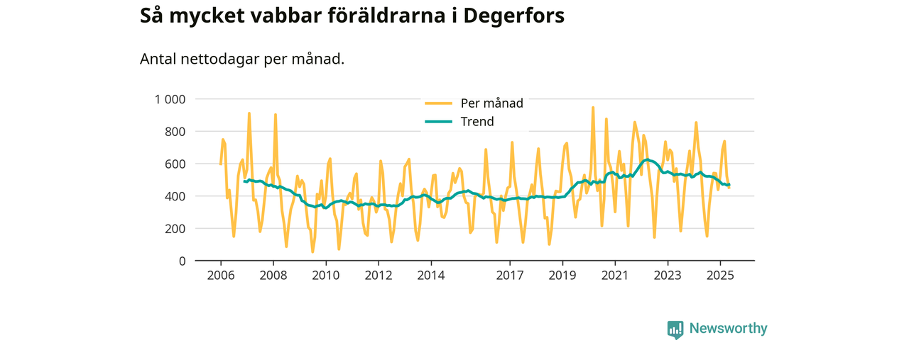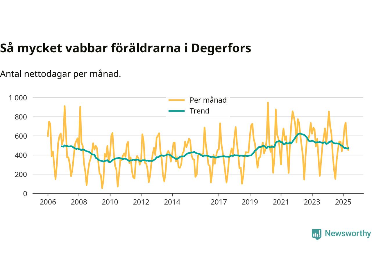 När coronapandemin drog in i mars 2020 peakade antalet vabbdagar både i Degerfors kommun och i riket som helhet. Under de senaste två åren har vabbuttaget börjat minska igen.
