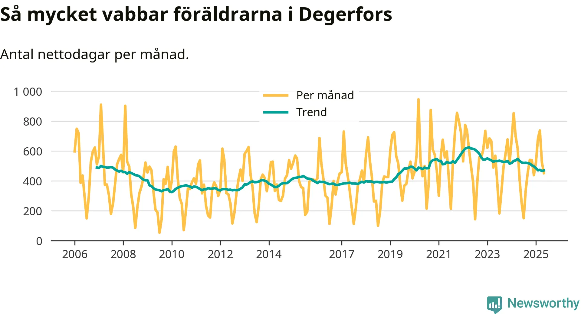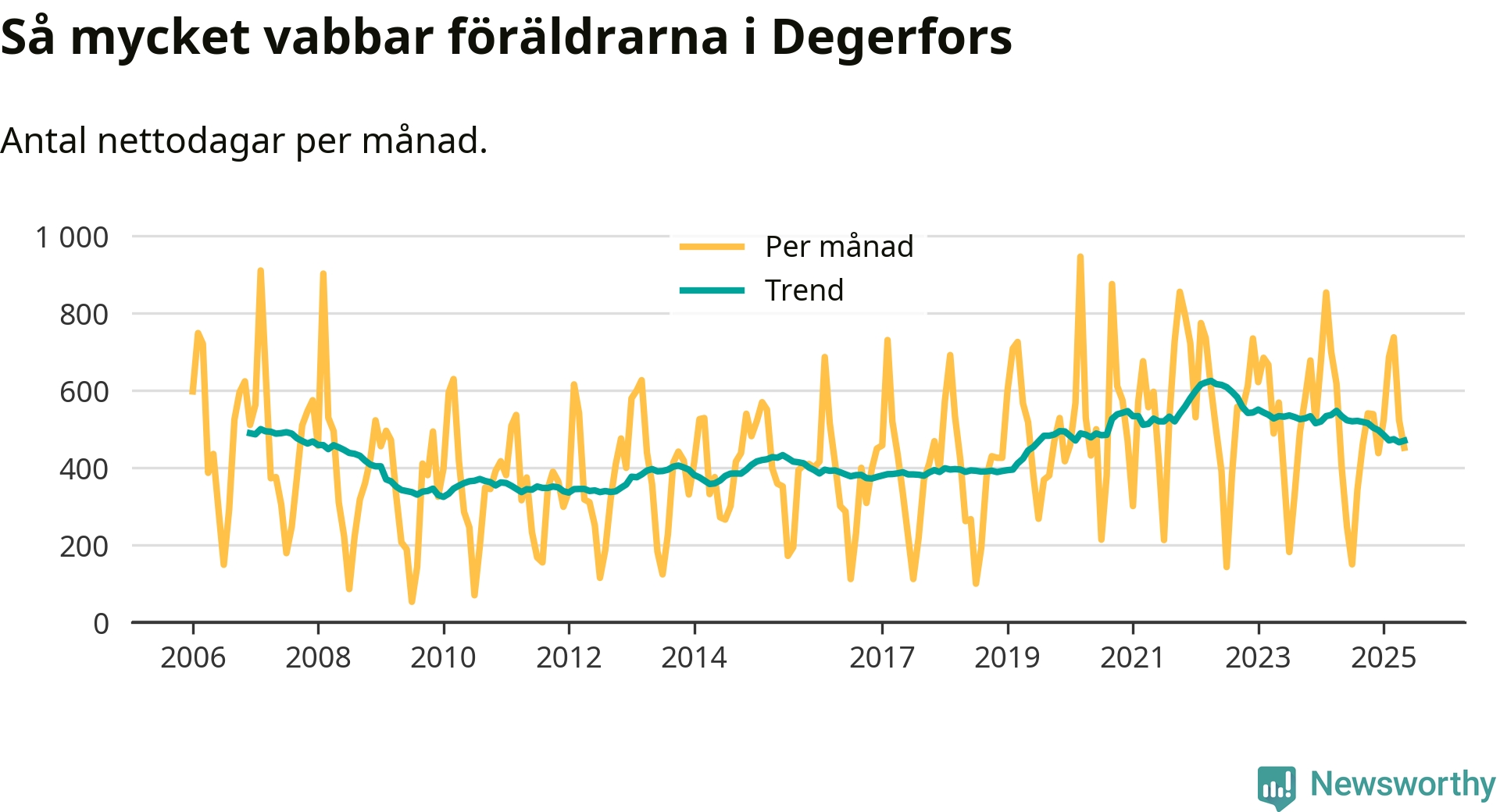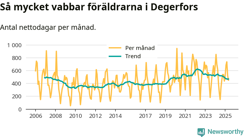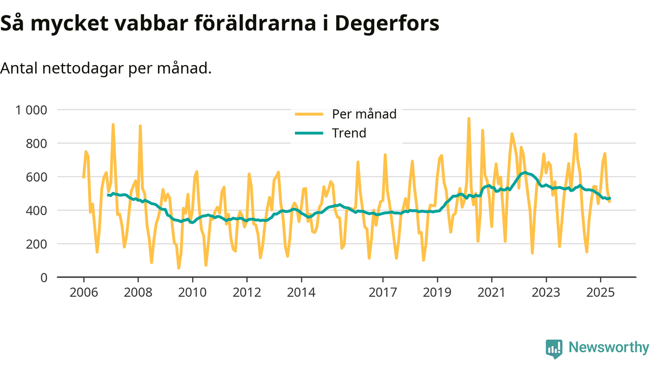 När coronapandemin drog in i mars 2020 peakade antalet vabbdagar både i Degerfors kommun och i riket som helhet. Under de senaste två åren har vabbuttaget börjat minska igen.