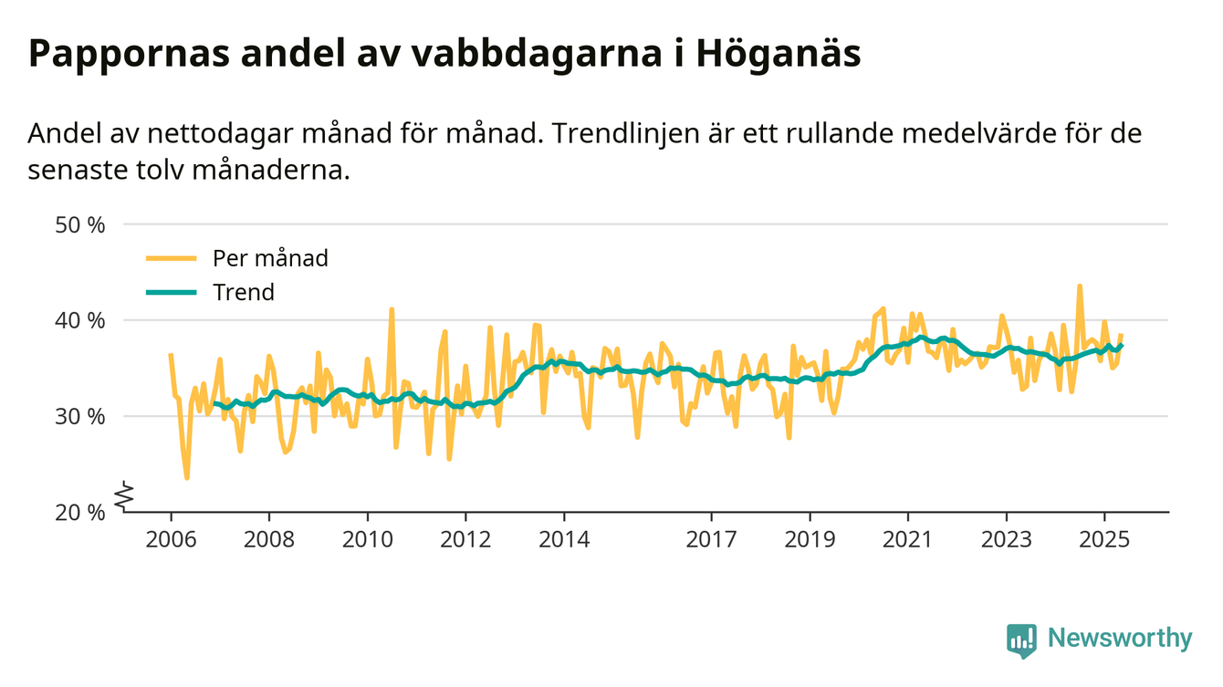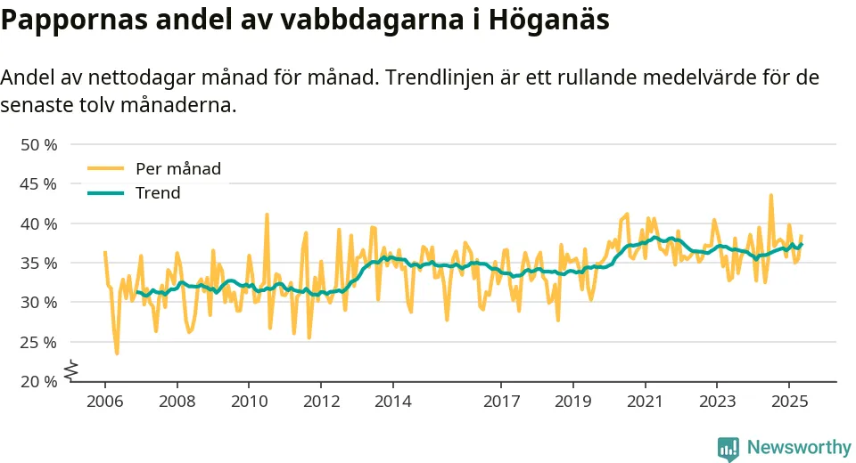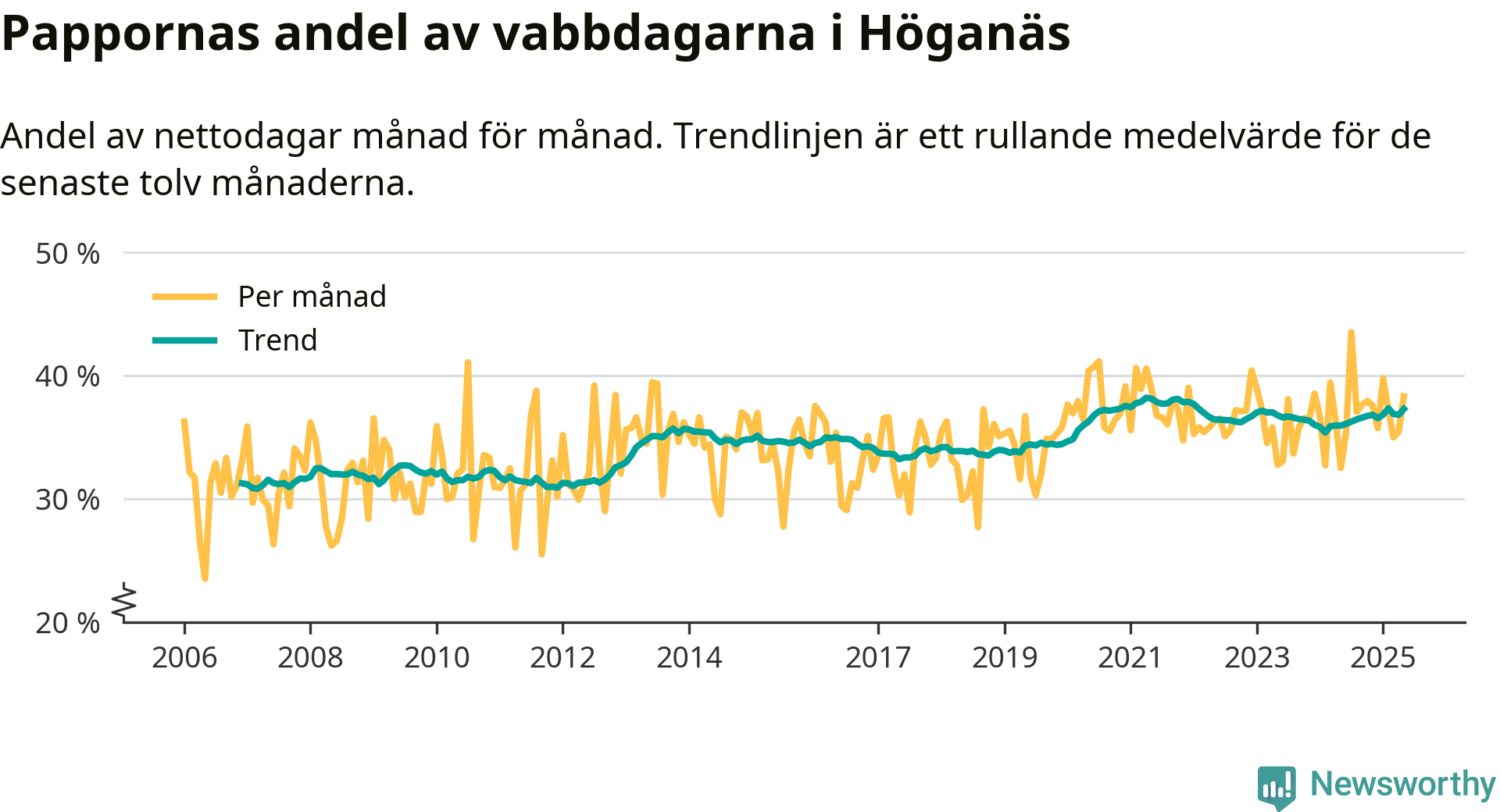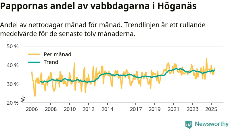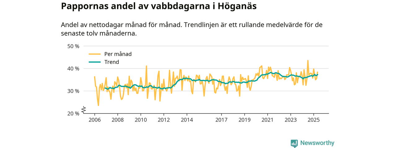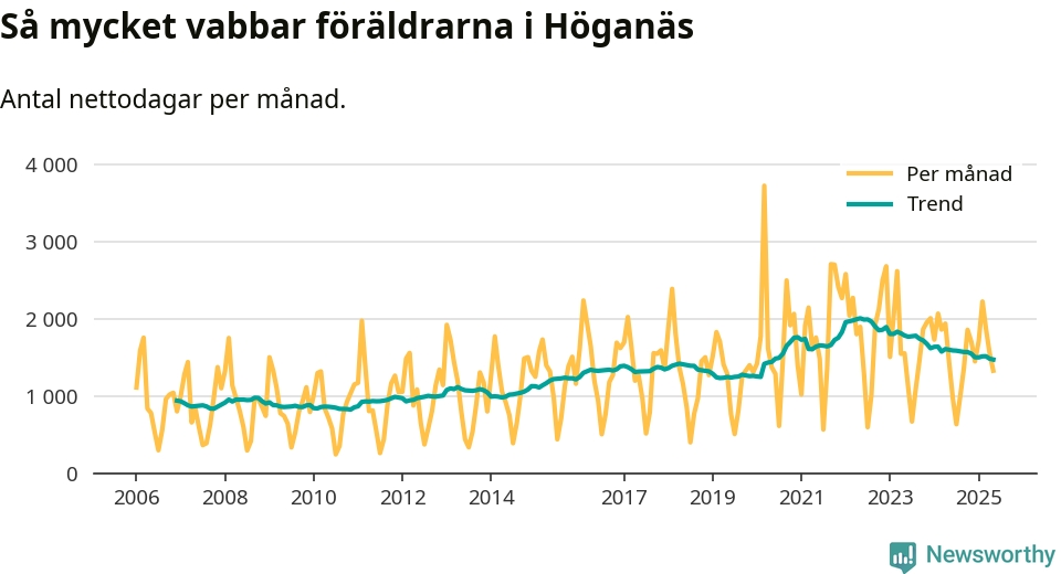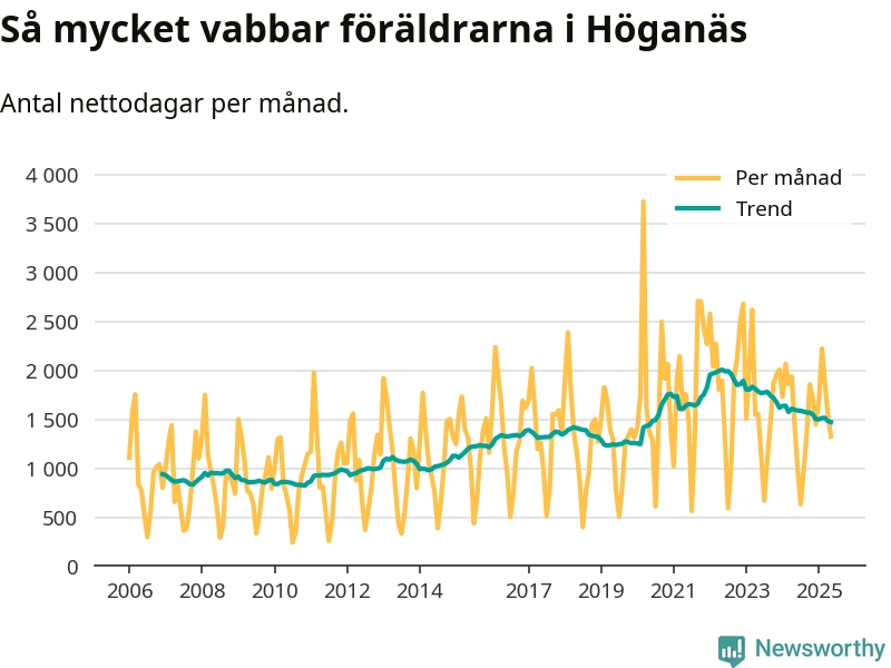 När coronapandemin drog in i mars 2020 peakade antalet vabbdagar både i Höganäs kommun och i riket som helhet. Under de senaste två åren har vabbuttaget börjat minska igen.