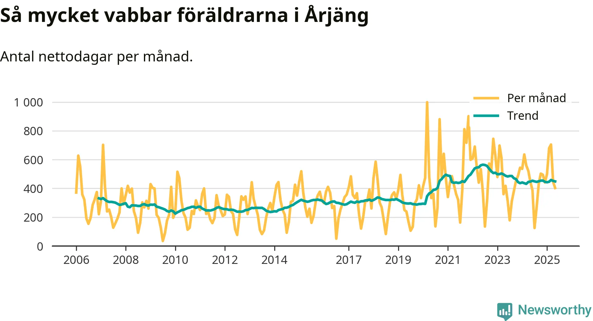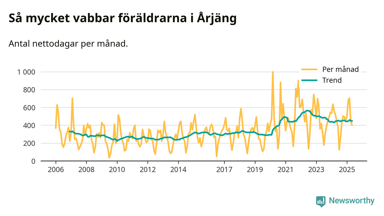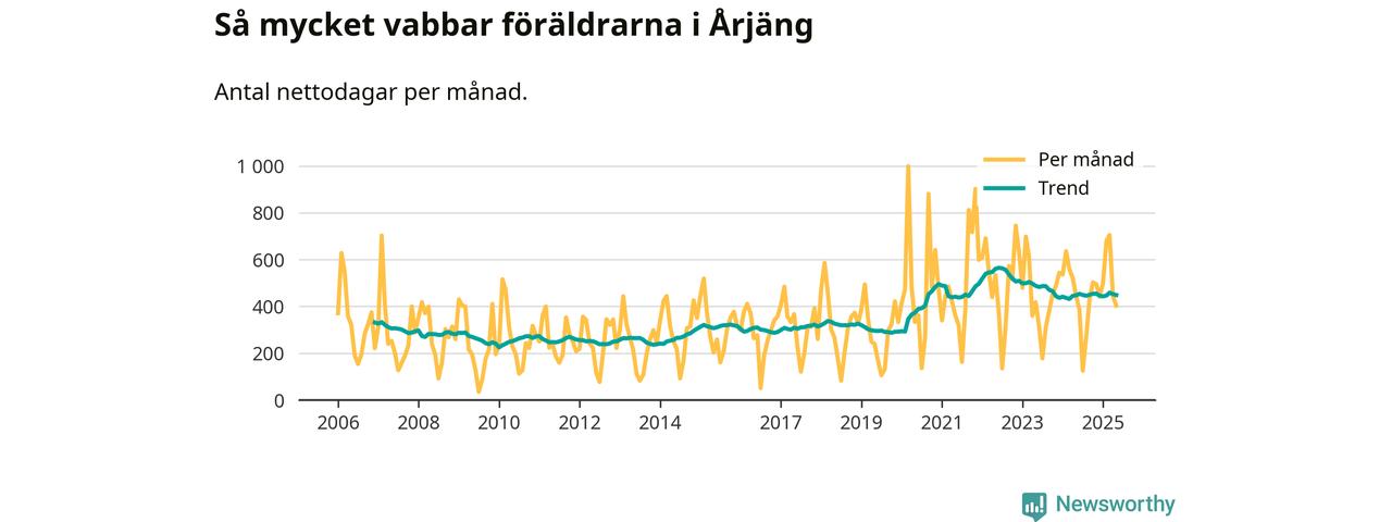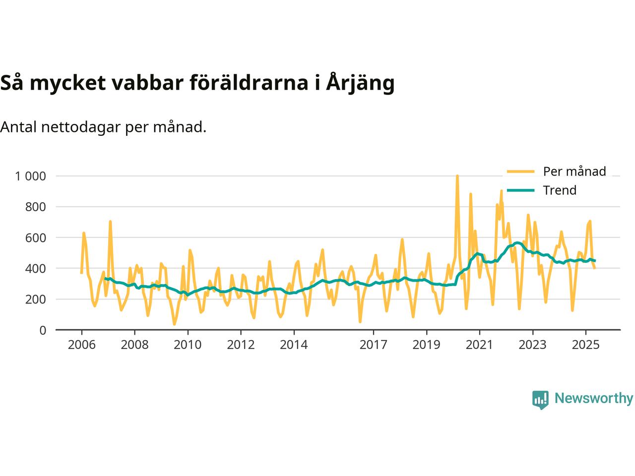 När coronapandemin drog in i mars 2020 peakade antalet vabbdagar både i Årjängs kommun och i riket som helhet. Under de senaste två åren har vabbuttaget börjat minska igen.