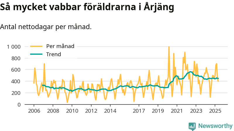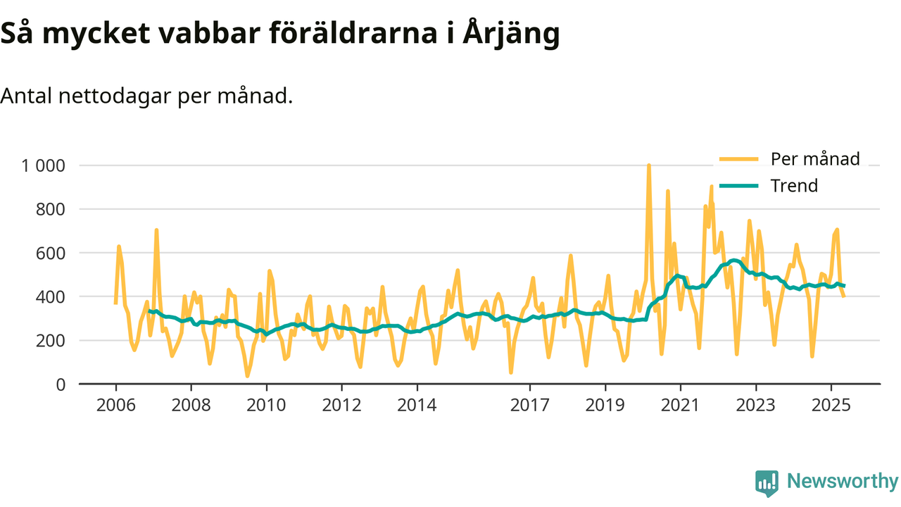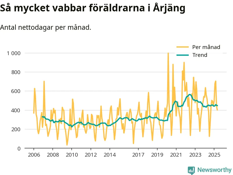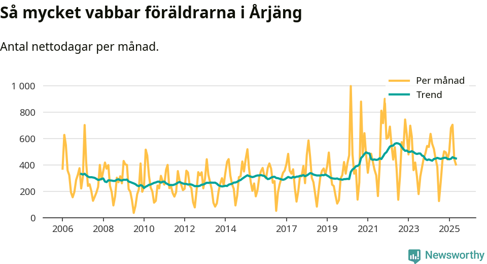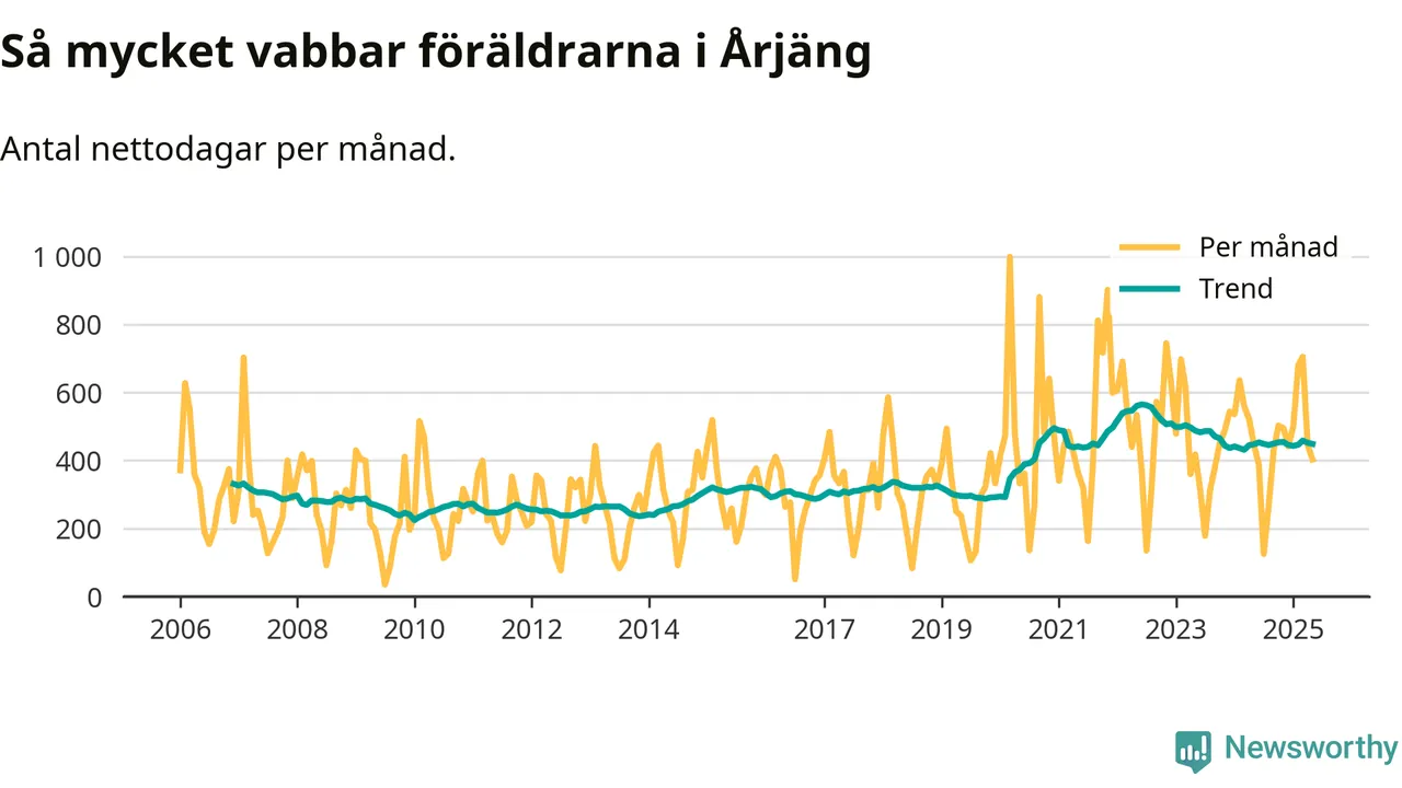 När coronapandemin drog in i mars 2020 peakade antalet vabbdagar både i Årjängs kommun och i riket som helhet. Under de senaste två åren har vabbuttaget börjat minska igen.