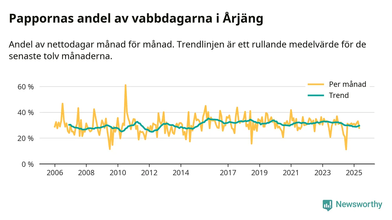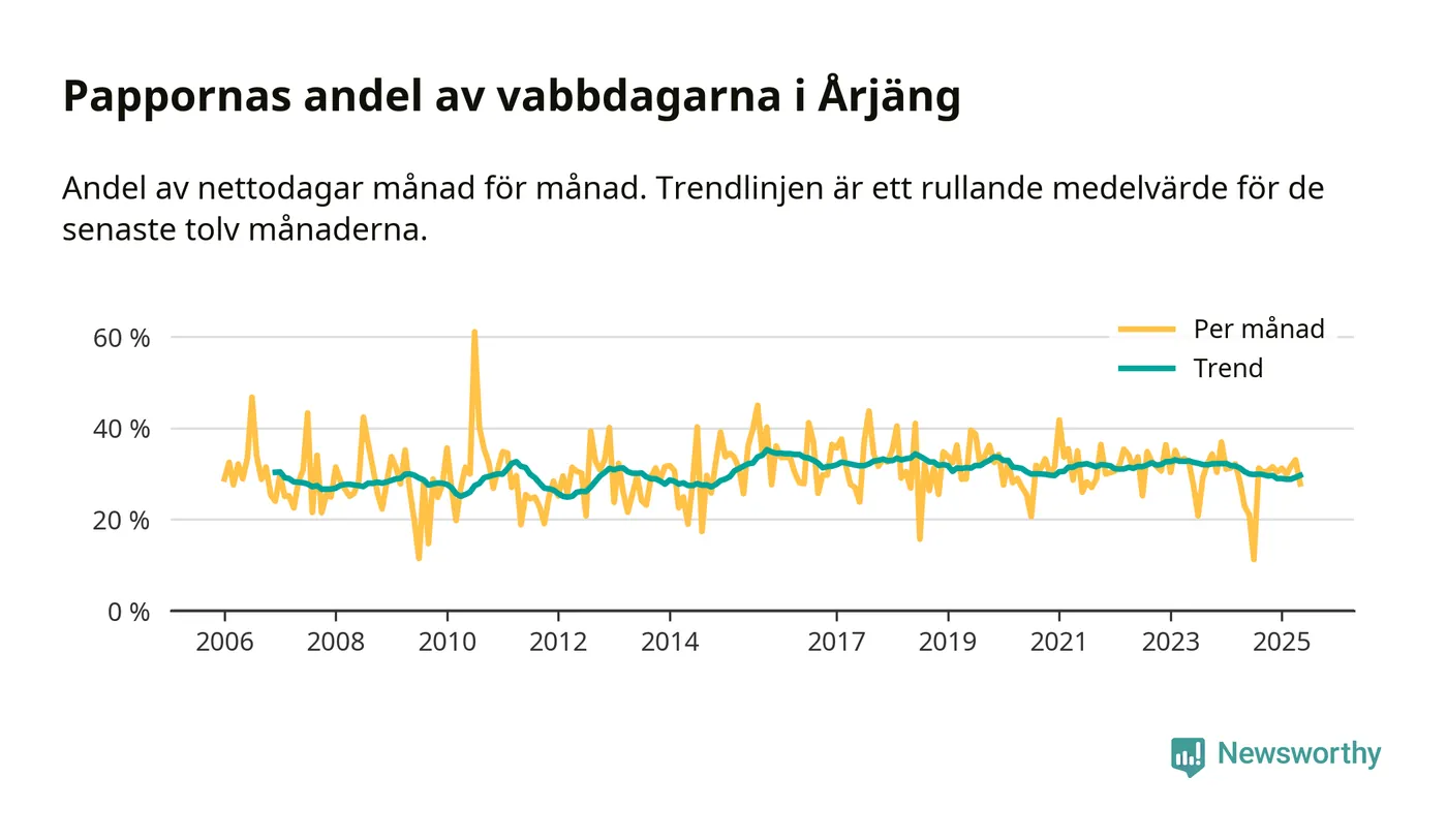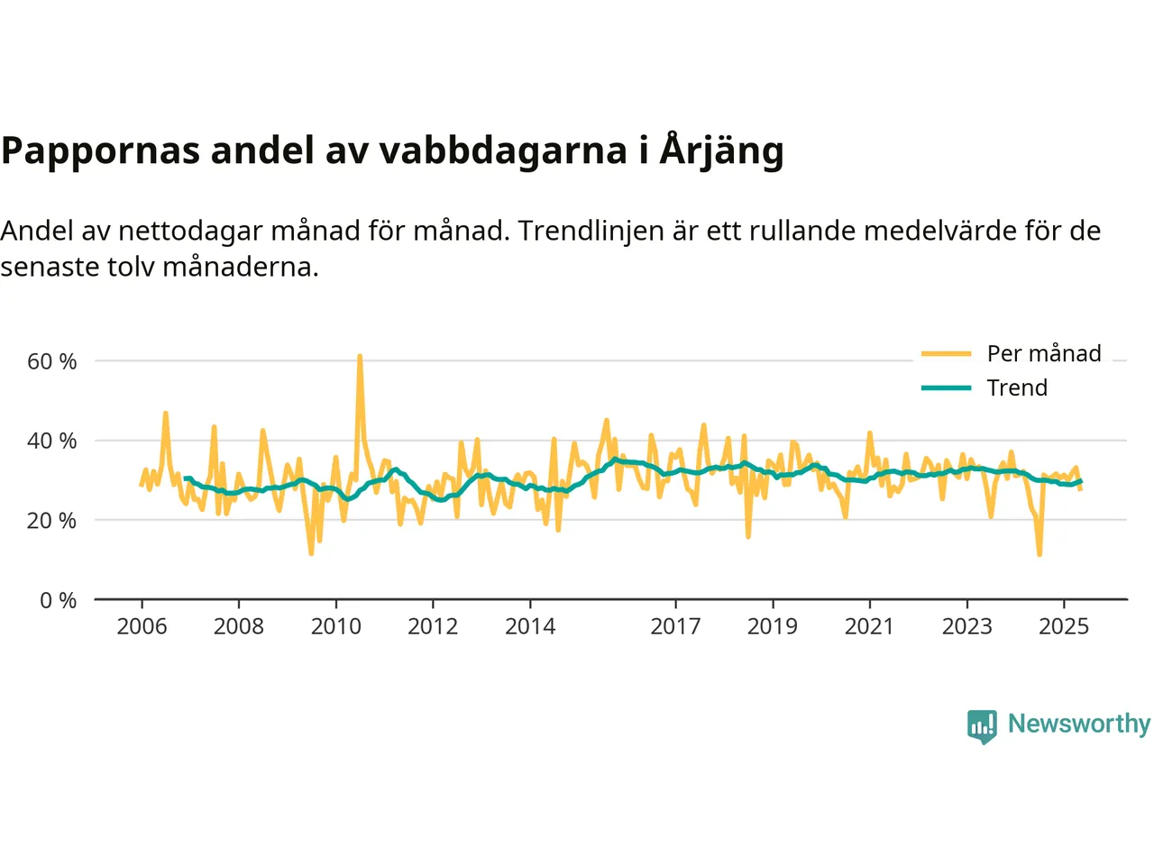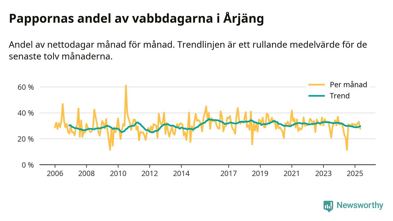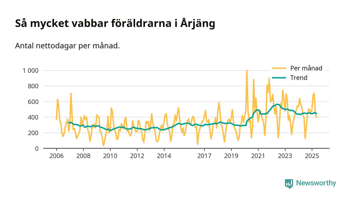 Årjäng ligger långt från ett jämställt uttag. Under de senaste tolv månaderna har männen stått för 30 procent av all vabb i kommunen. Pappornas uttag peakade hösten 2015 då kommunens fäder var uppe i 35 procent av vabbdagarna 1.