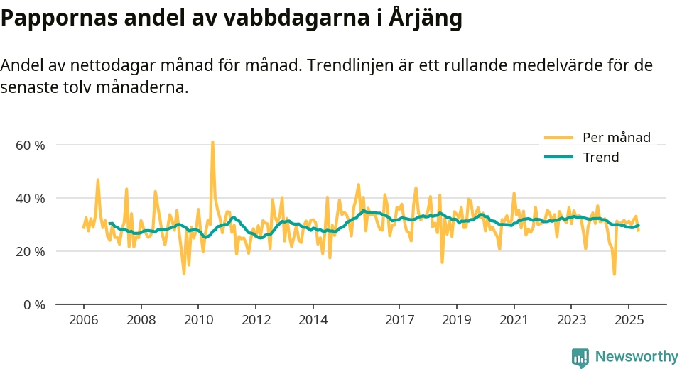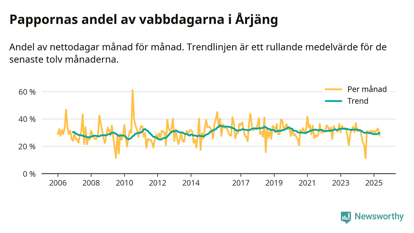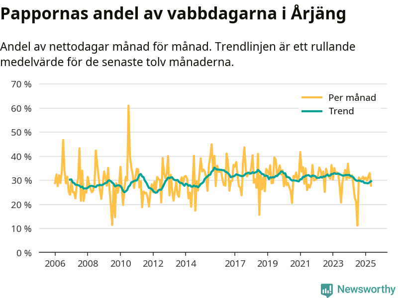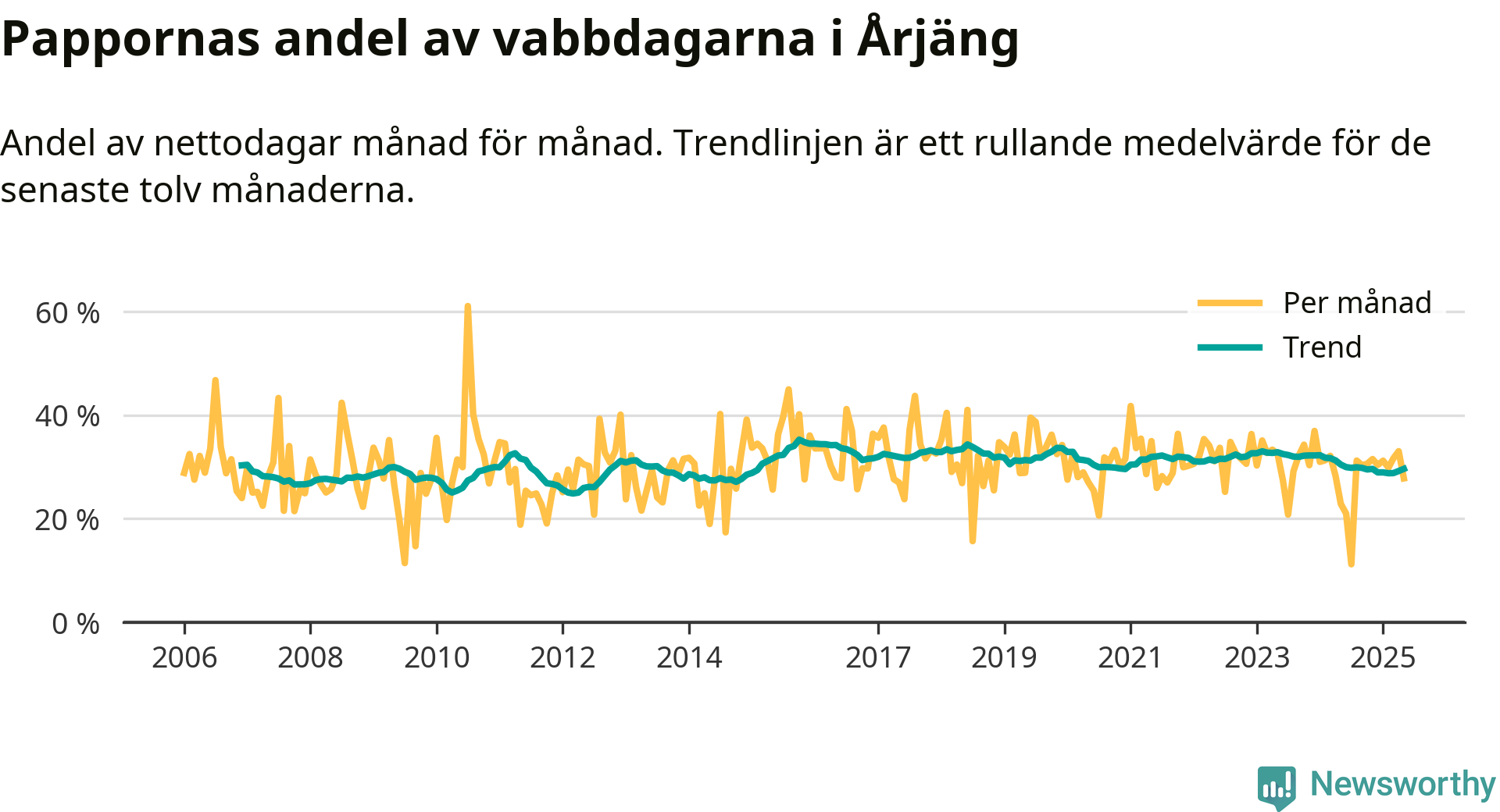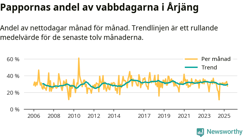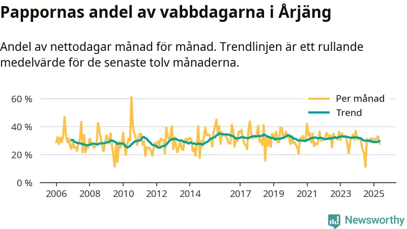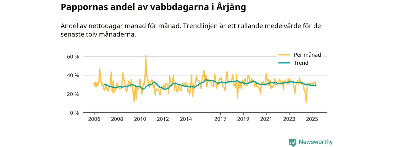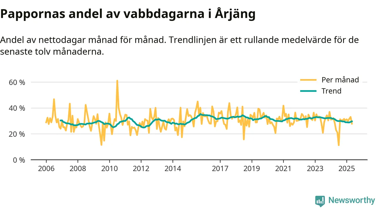 Årjäng ligger långt från ett jämställt uttag. Under de senaste tolv månaderna har männen stått för 30 procent av all vabb i kommunen. Pappornas uttag peakade hösten 2015 då kommunens fäder var uppe i 35 procent av vabbdagarna 1.