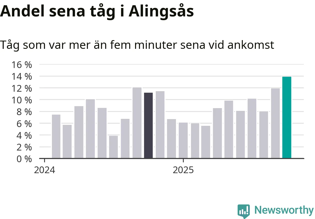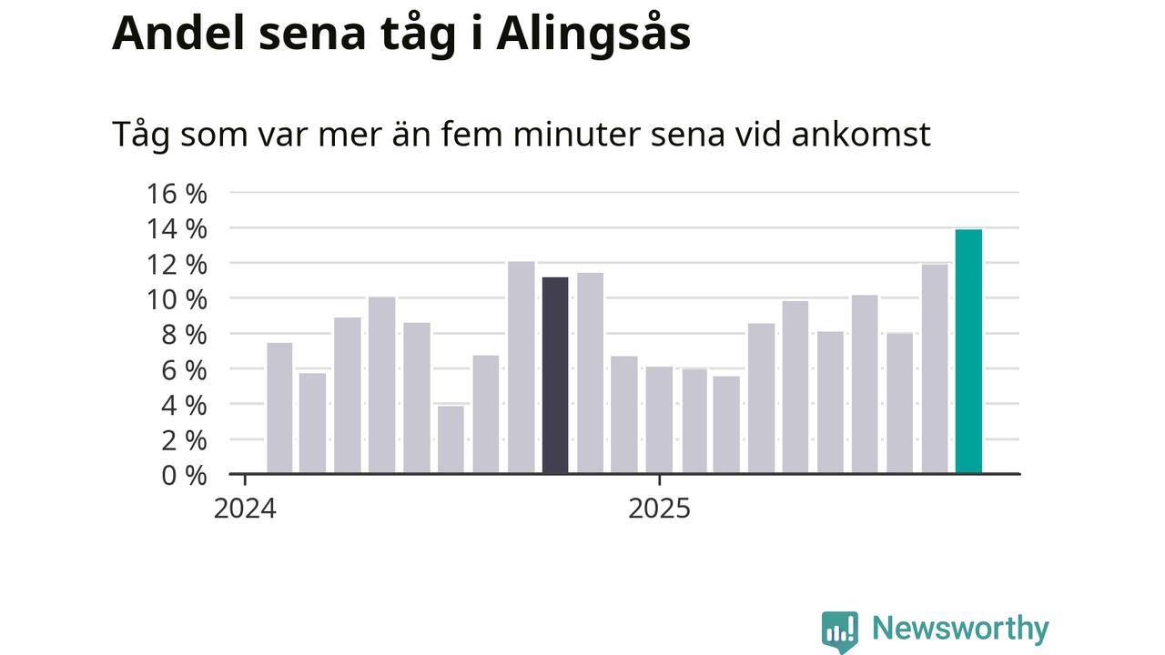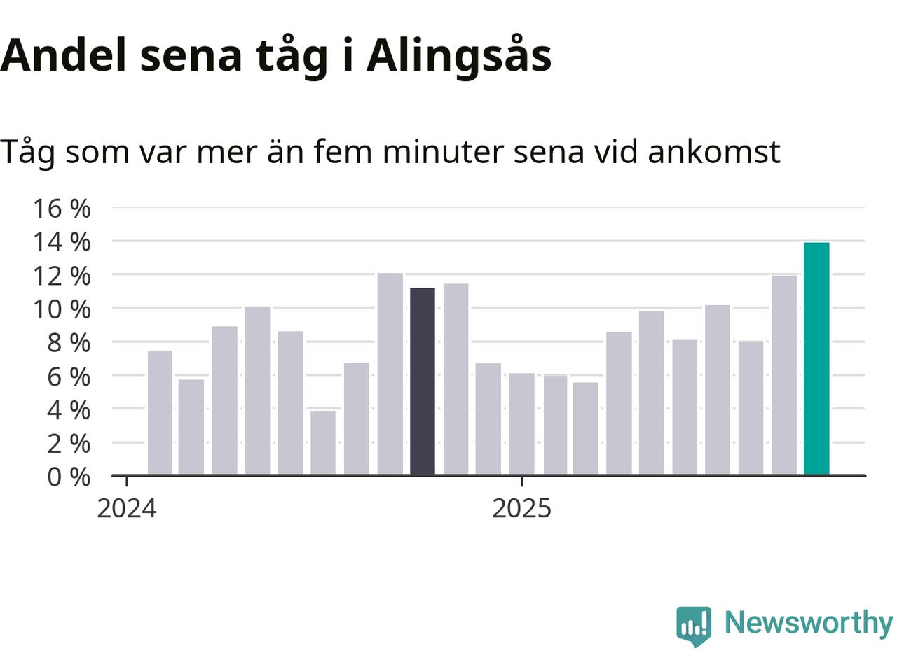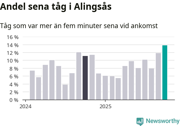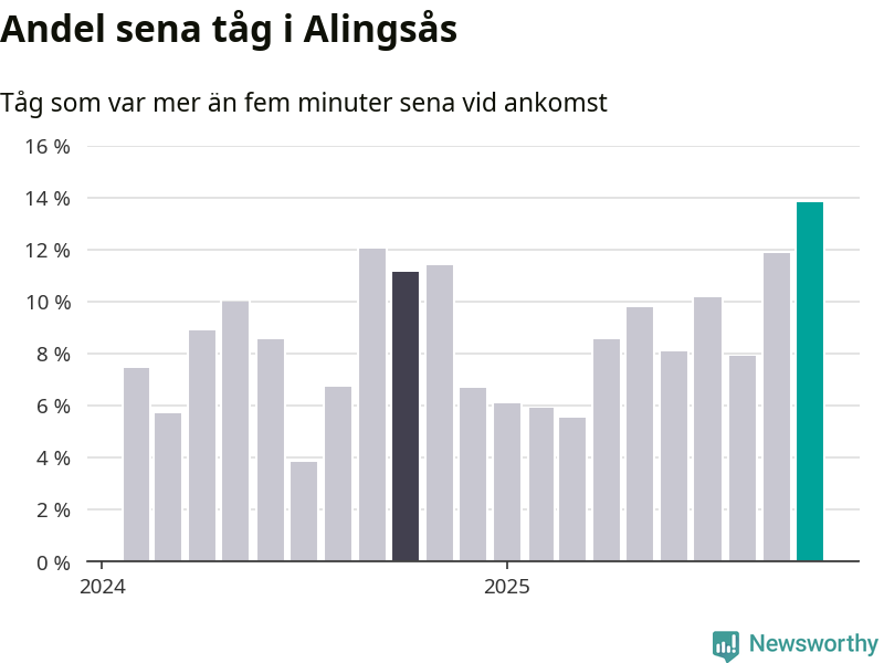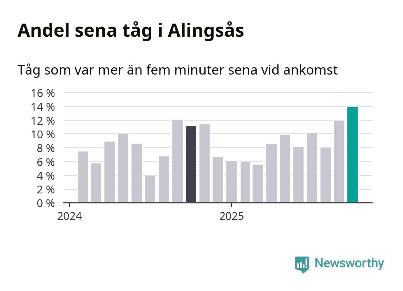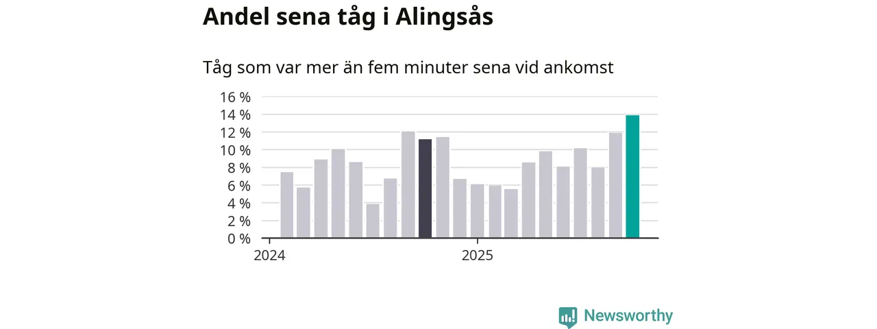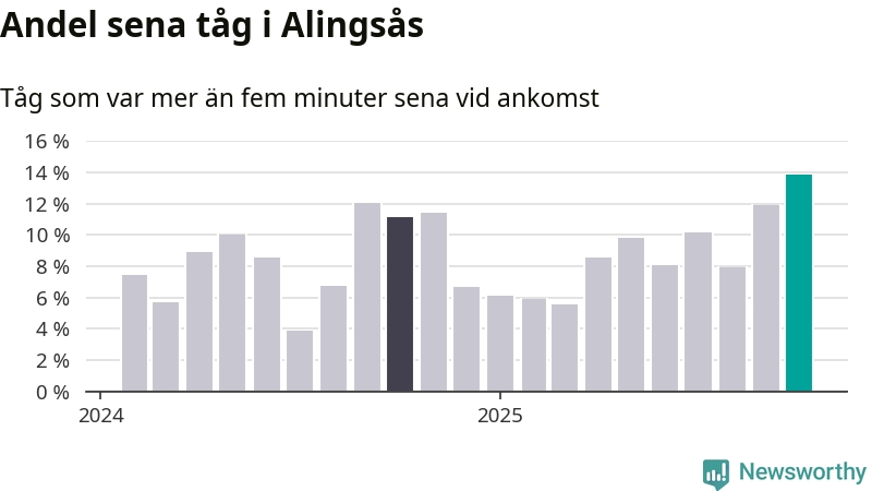 14 procent är den högsta andelen sena tåg sedan åtminstone den hårt förseningsdrabbade vintern 2023/24. Siffrorna bygger på realtidsinformation om tågavgångar och ankomster från Trafikverket, som Newsworthy löpande samlar in.