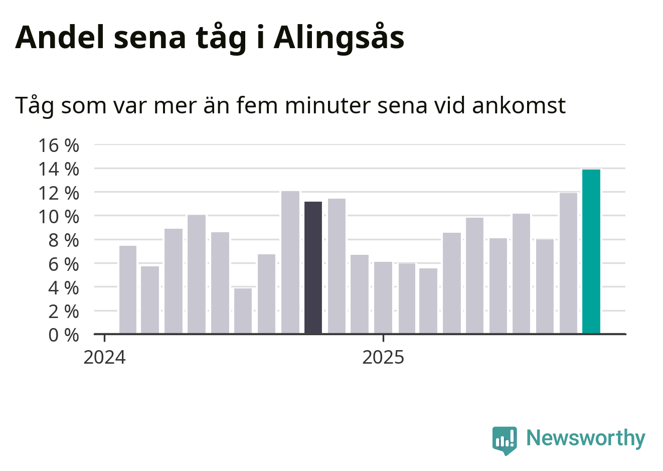 Av omkring 3 600 tåg som passerade Alingsås eller Västra Bodarne i oktober var 503 mer än fem minuter sena. Det motsvarar 14 procent, en bit över den nationella målsättningen som säger att inte mer än fem procent av tågen ska vara sena.