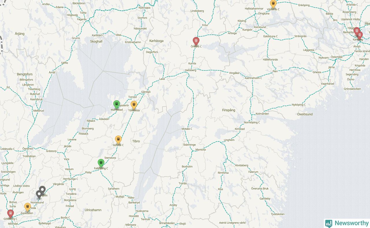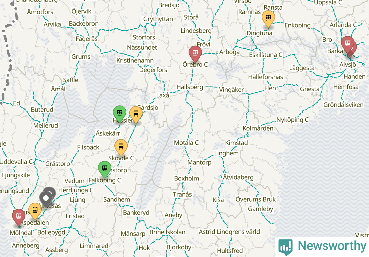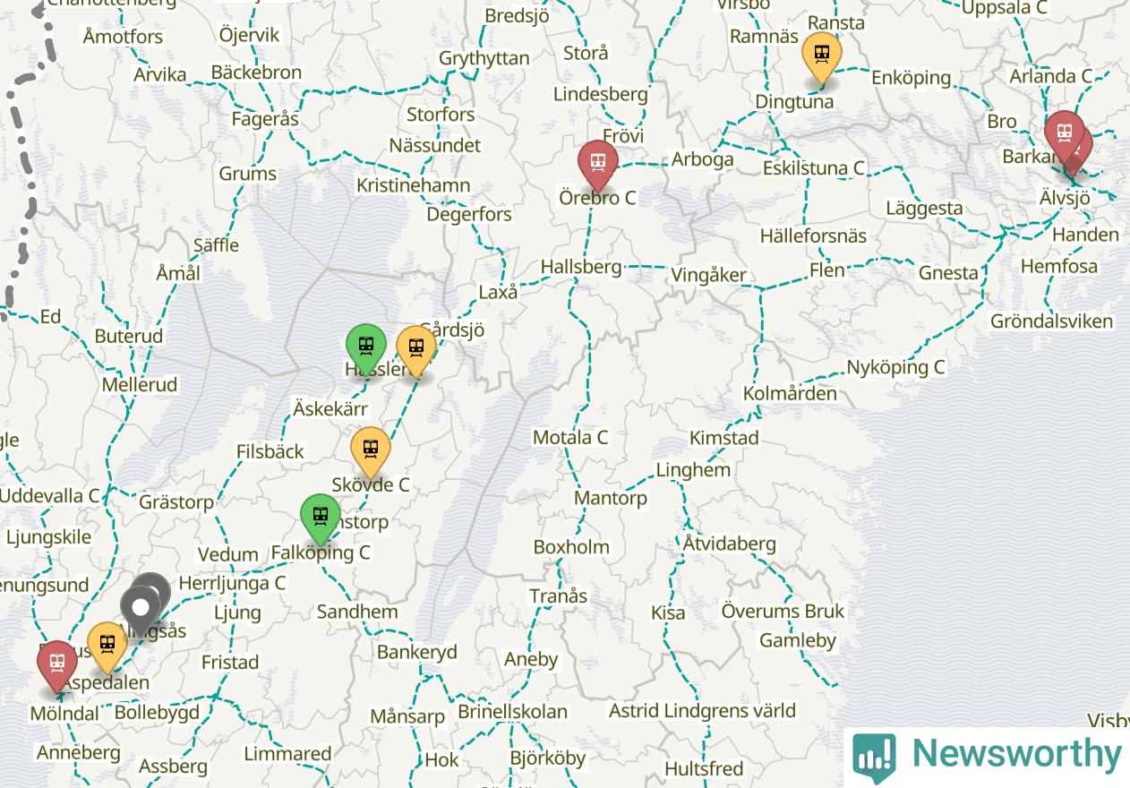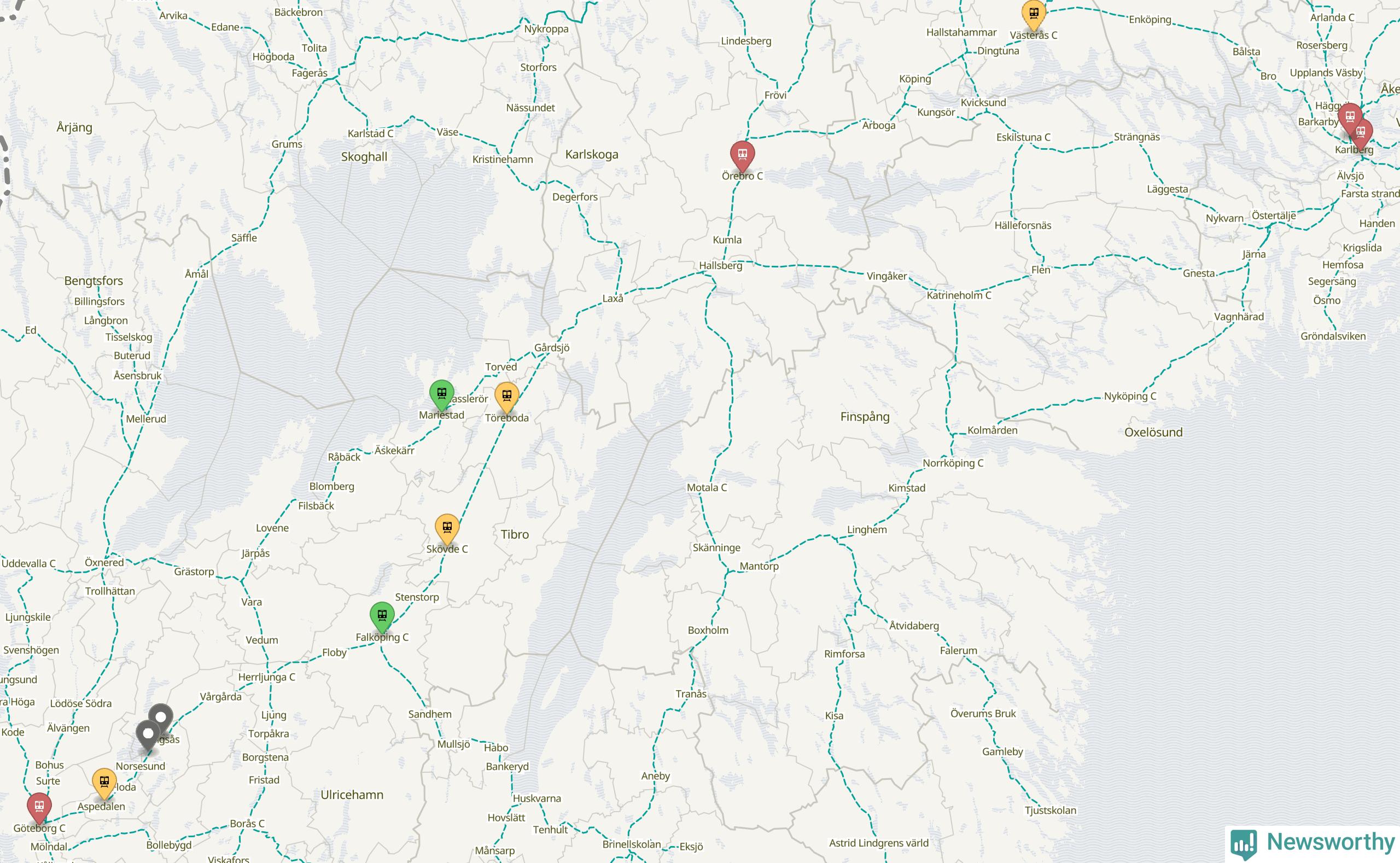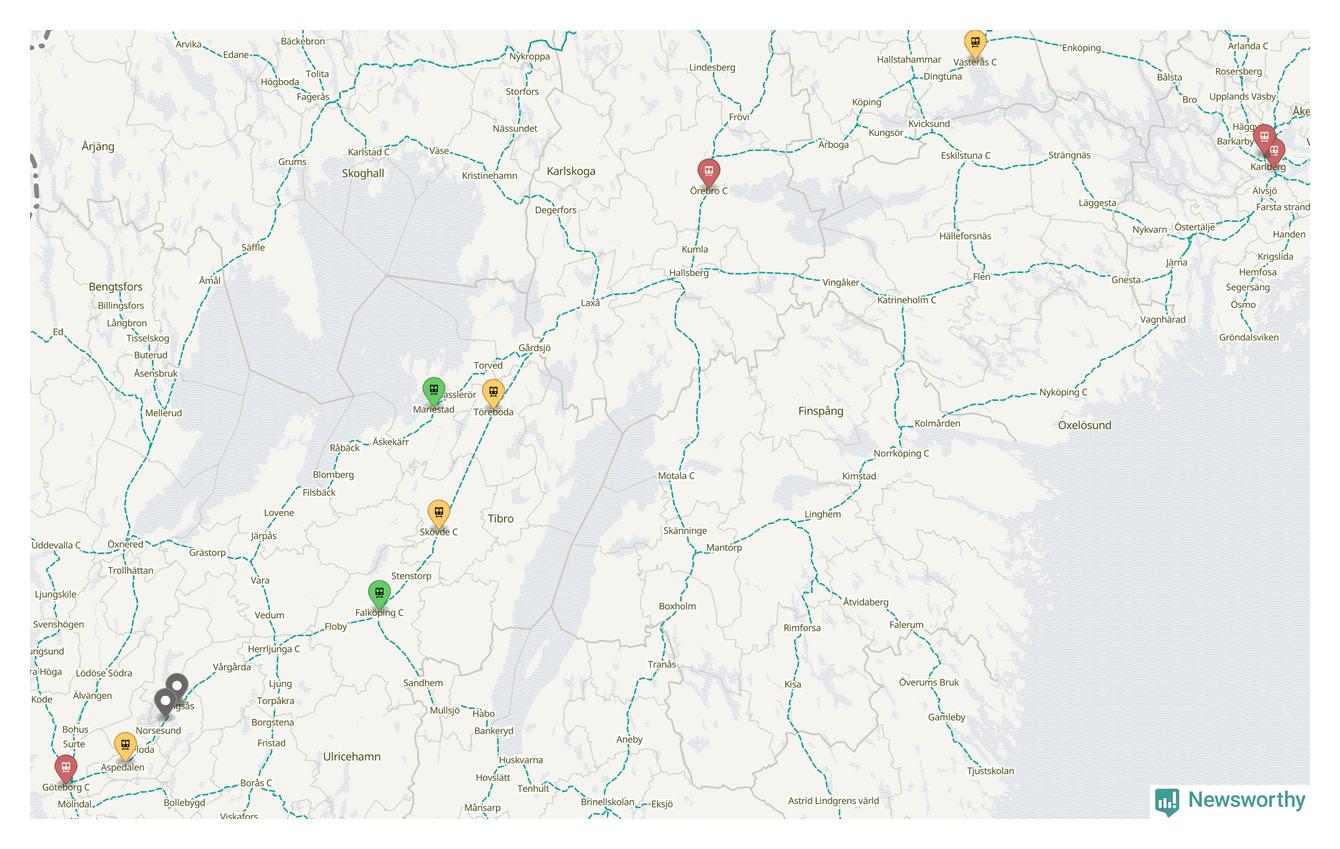 Kartdata från Mapbox, Newsworthy, OpenStreetMap och Trafikverket. Uppgifter om sträckor med passagerartrafik från jarnvag.net.