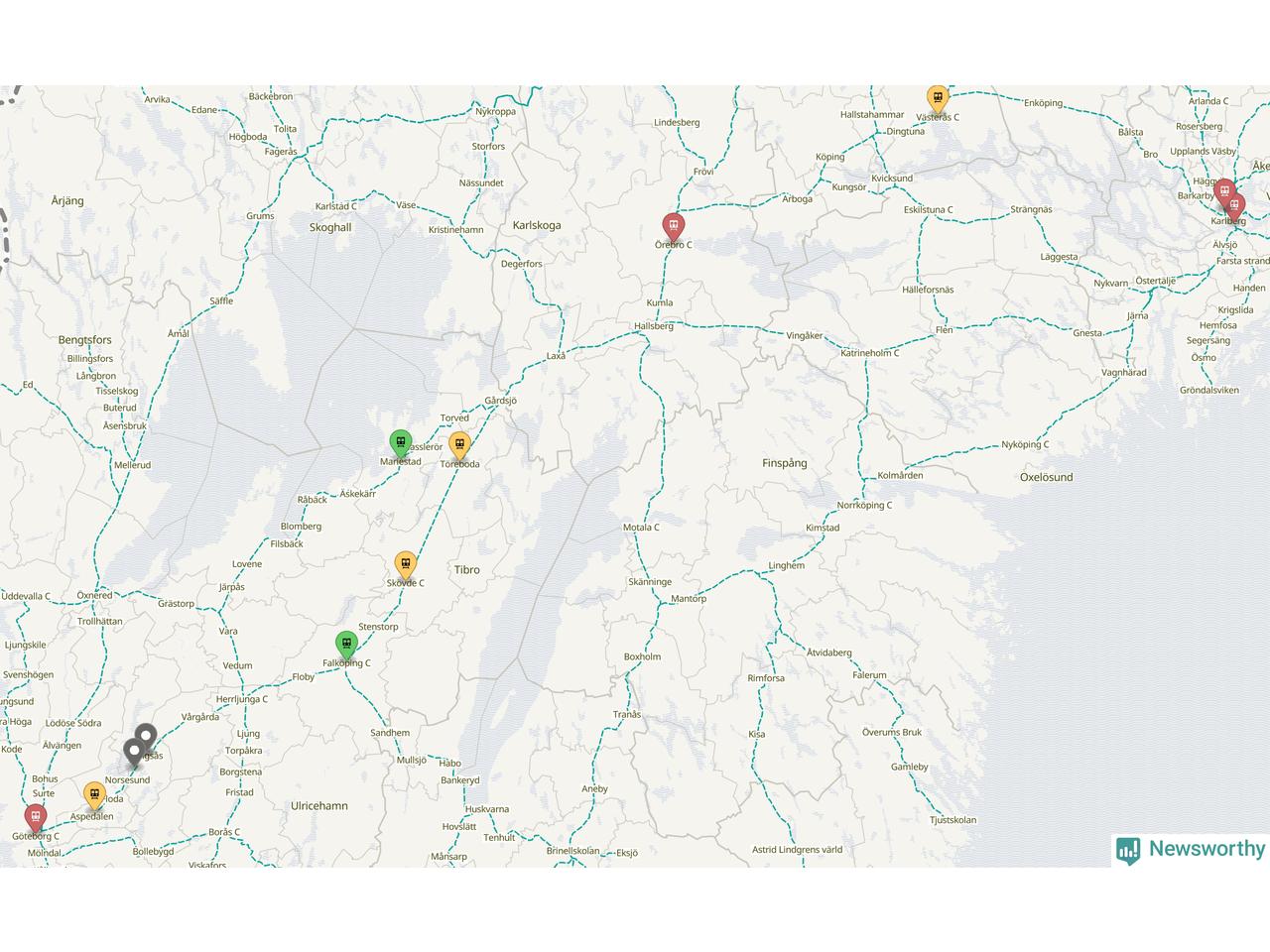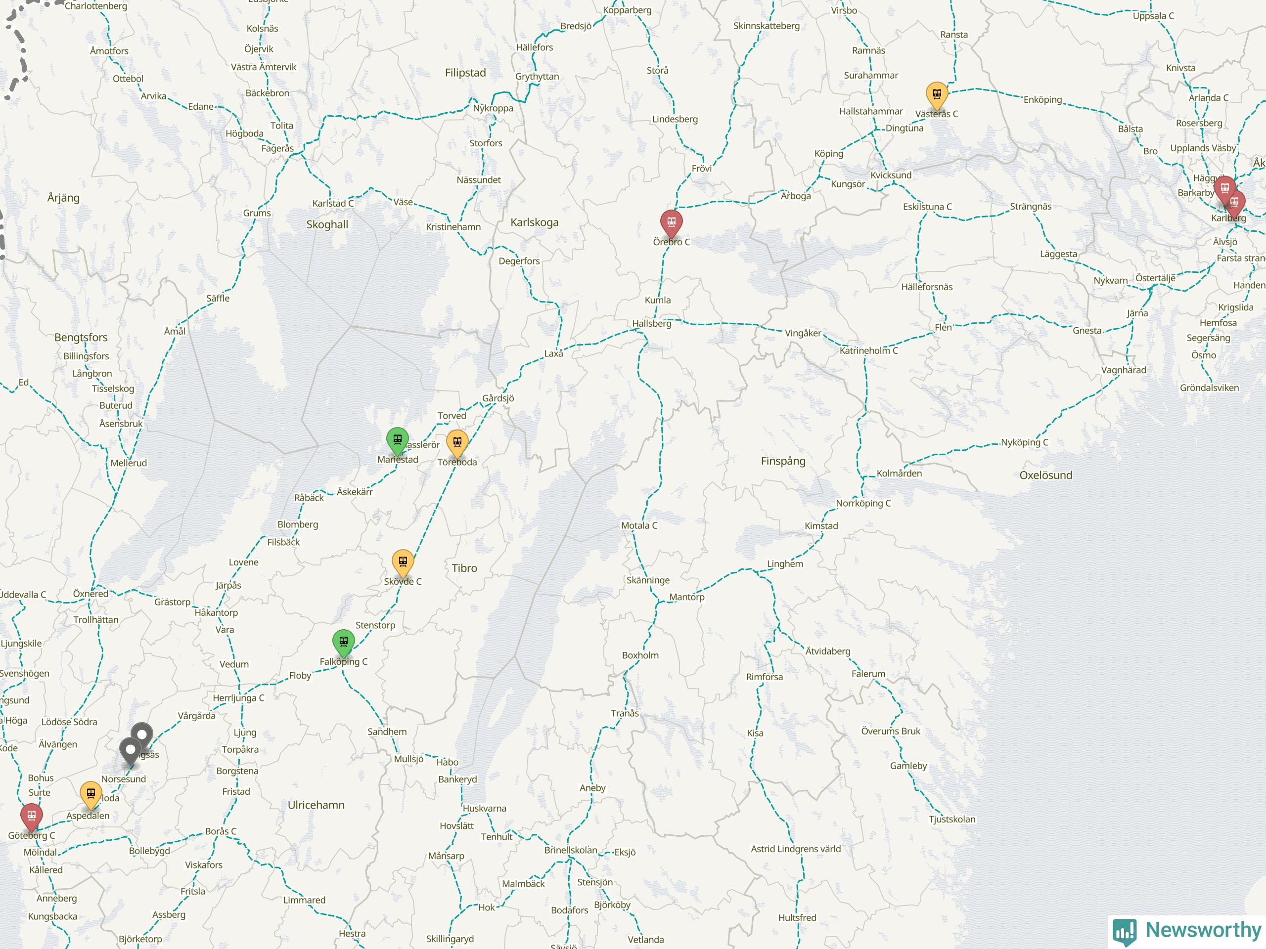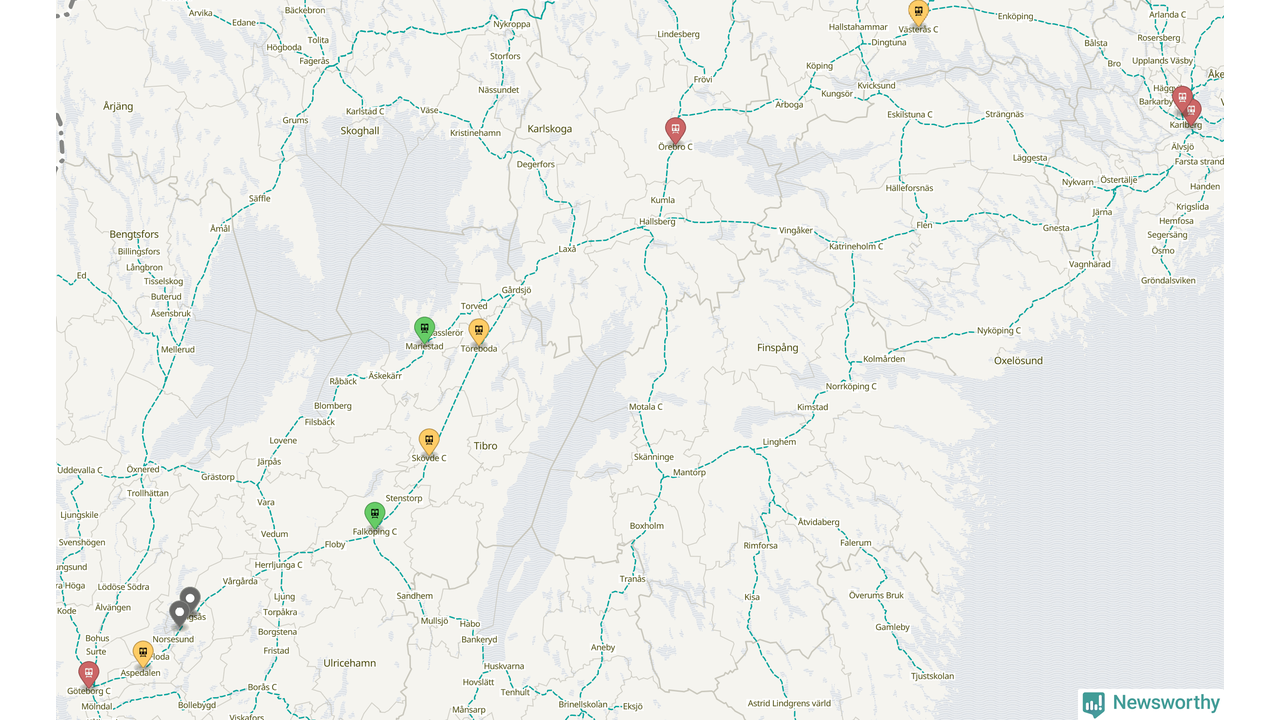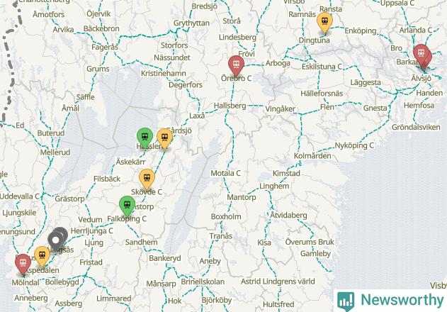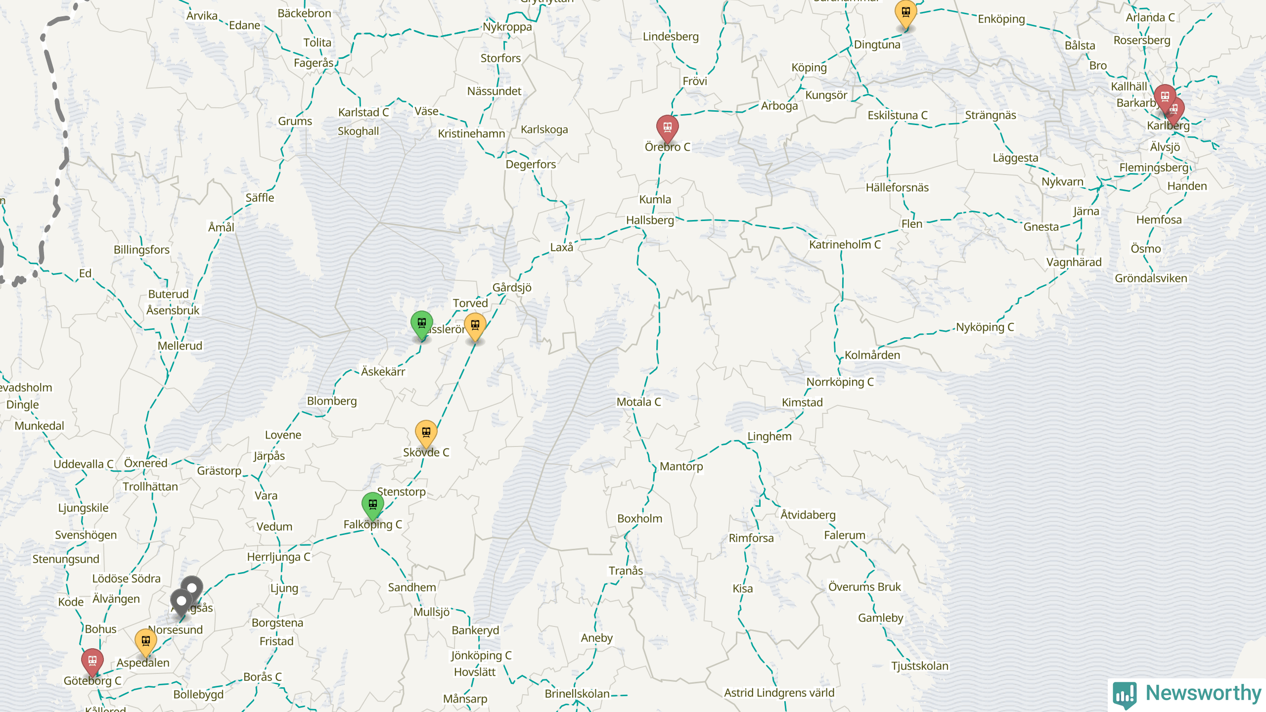 Kartdata från Mapbox, Newsworthy, OpenStreetMap och Trafikverket. Uppgifter om sträckor med passagerartrafik från jarnvag.net.